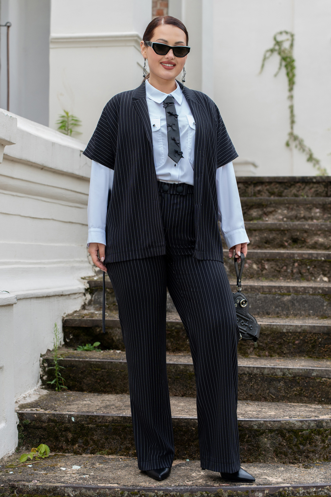 Эти элегантные женские брюки прямого силуэта идеально подходят для создания деловых и стильных образов. Изготовленные из эластичной костюмной ткани с классическим вертикальным полосатым принтом в сдержанной цветовой гамме, они придают строгость и утончённость. Модель оснащена удобным поясом на застёжке с тесьмой-молнией и пуговицами, дополненным сзади эластичной резинкой для идеальной посадки. По бокам расположены наклонные карманы, добавляющие практичности. Чёткие стрелки на всю длину визуально удлиняют силуэт, подчёркивая изысканность линий. Эти брюки будут гармонично смотреться как в офисных, так и в более неформальных образах.