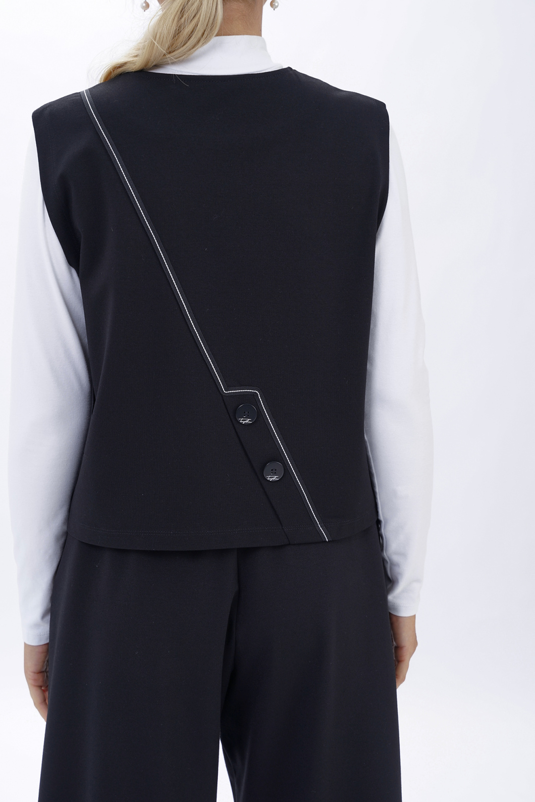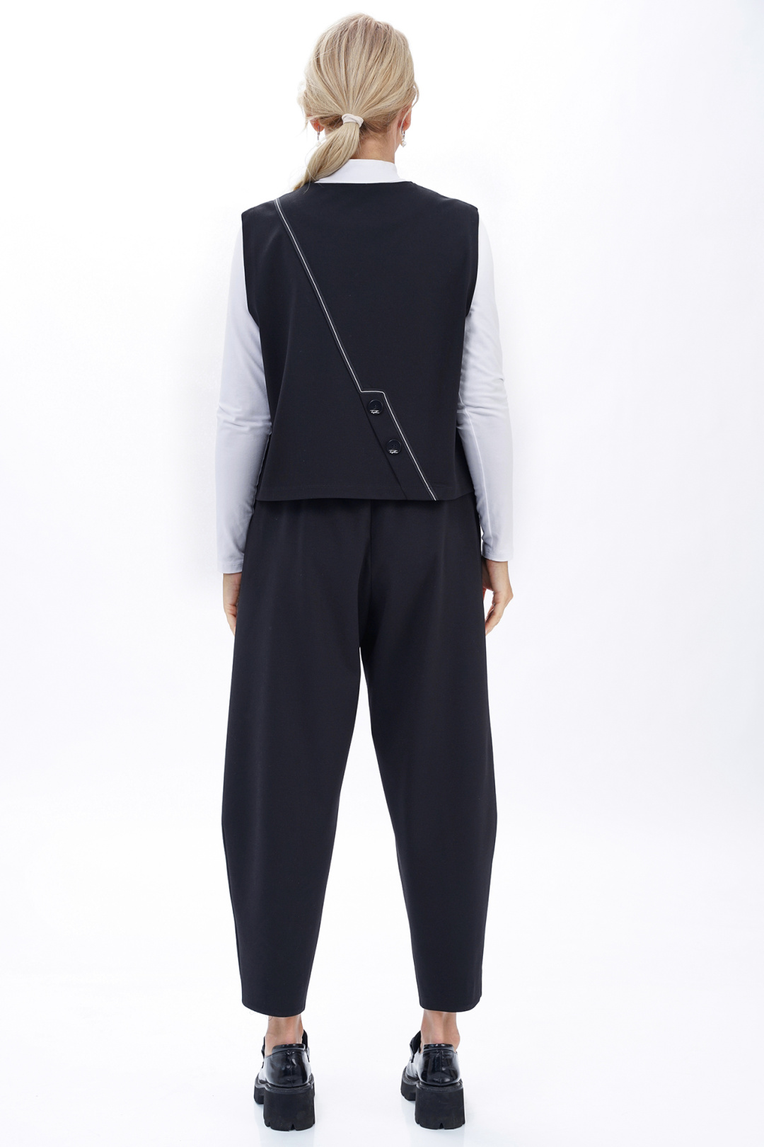 Жилет прямого, свободного силуэта, с застёжкой на петлю, пуговицу, правая часть переда с фигурной линией низа и декорирована нашивкой. Спинка с рельефным швом понизу переходящий в закрытую шлицу с пришивными пуговицами. По левой части переда, по спинки отделочная тесьма.