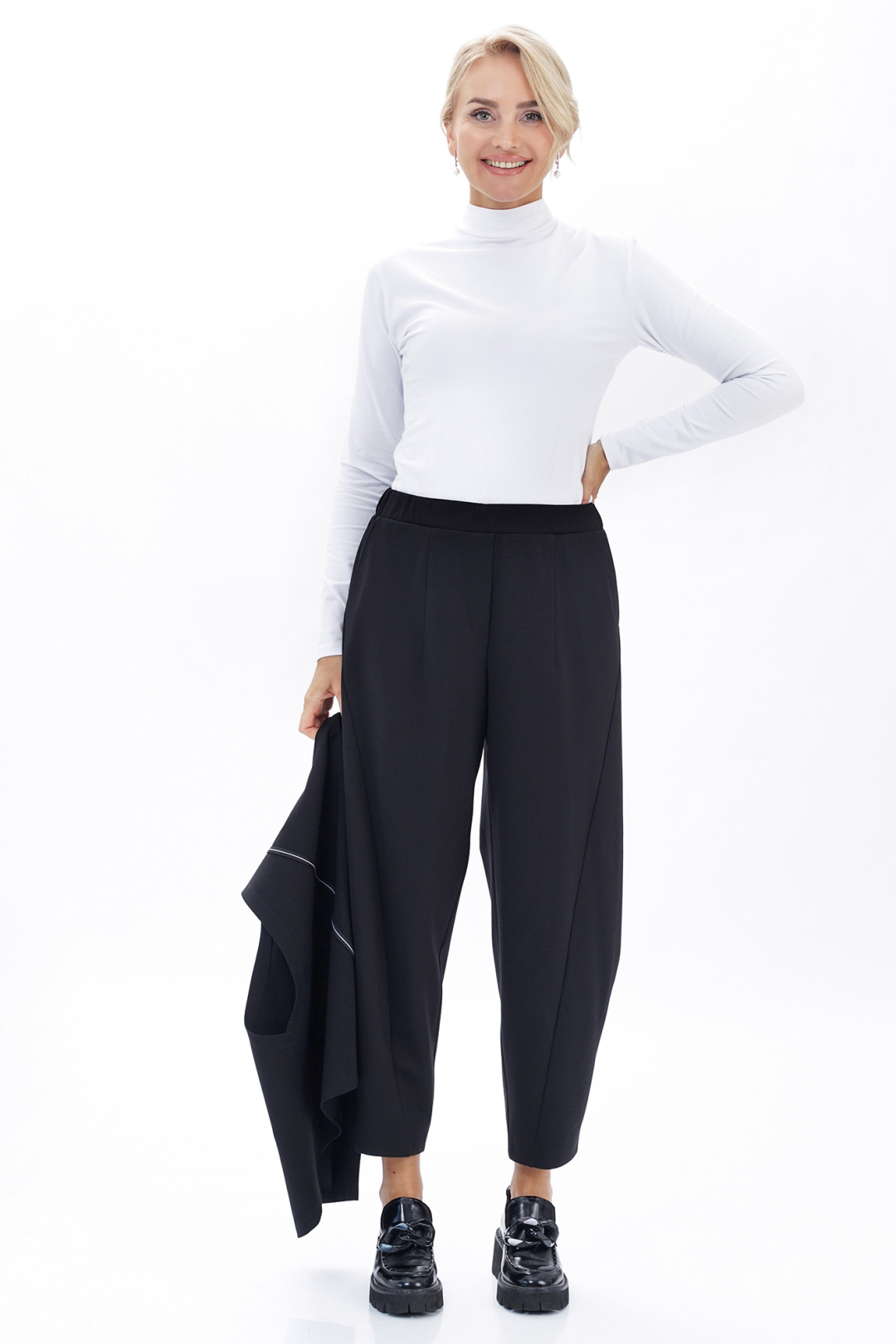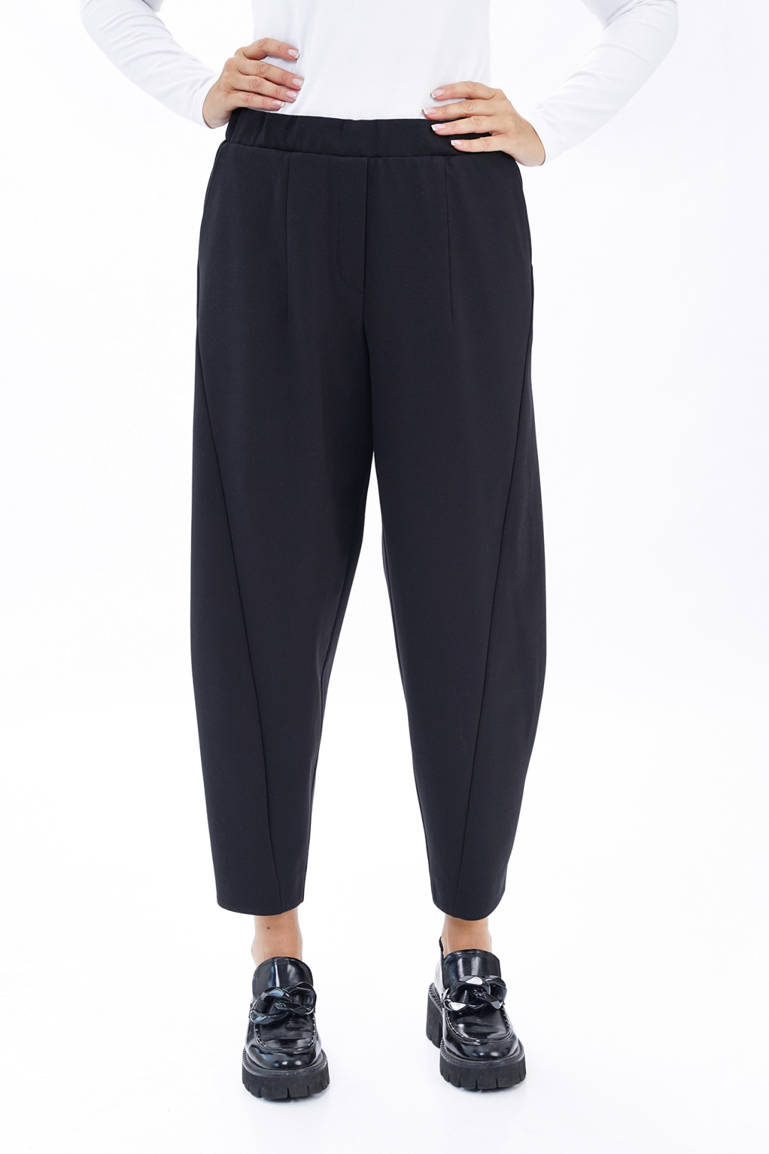 Брюки типа «банан», с притачным поясом на резинке, с имитацией застёжки типа «гульфик». С переходящими на перед фигурными боковыми швами, от линии низа по боковым конструктивные выточки. Низ обработан обтачкой. Передние части с косыми боковыми карманами и талевыми выточками.