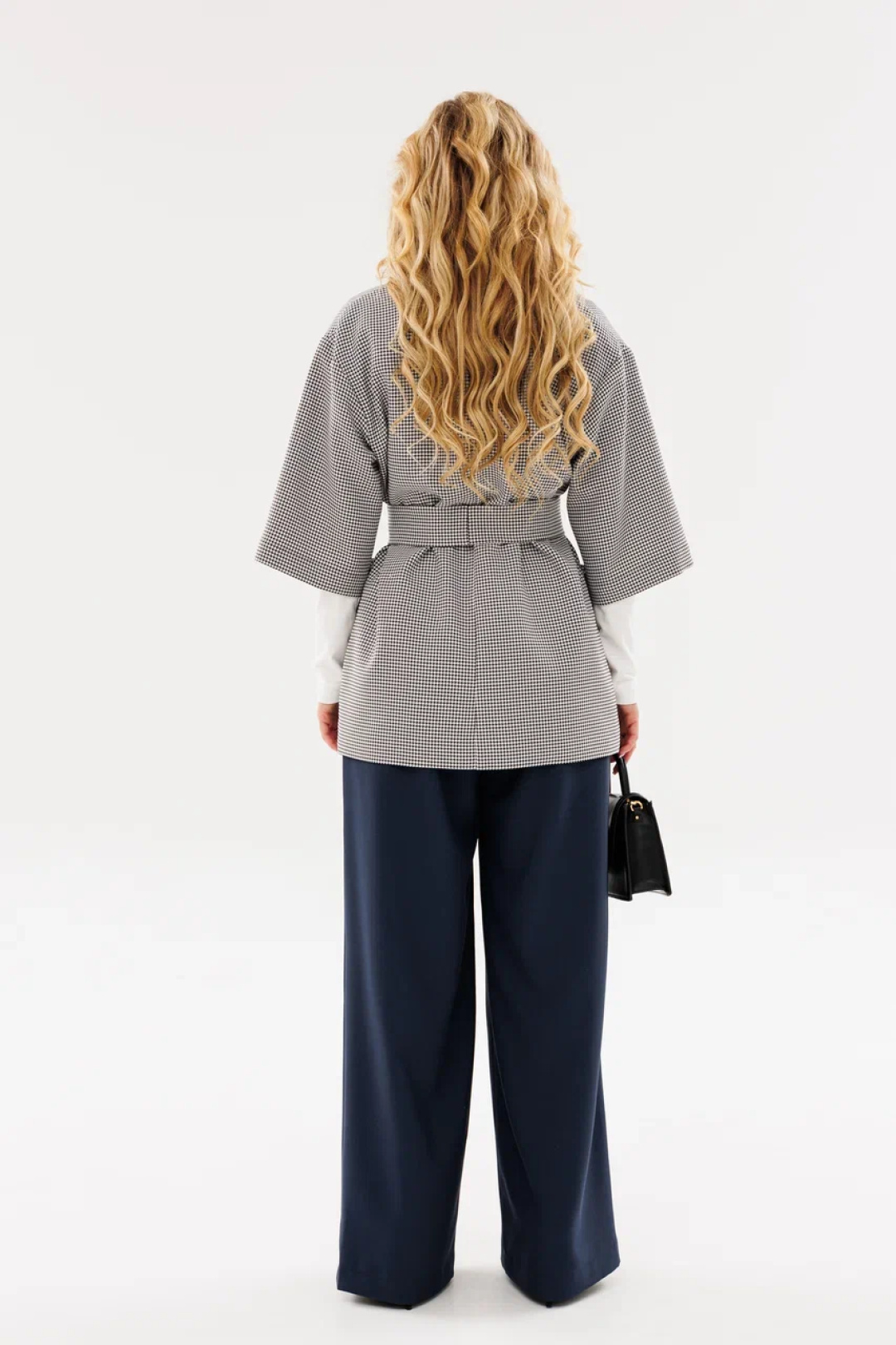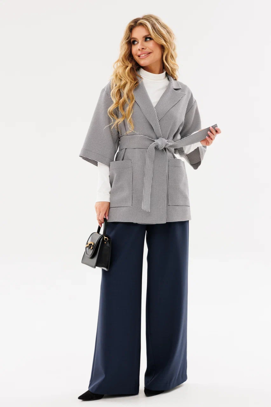 Брюки женские,свободного силуэта,на поясе со шлевками.Застежка на молнию и пуговицу.По переду заложены складки.По бокам действующие угловые карманы.