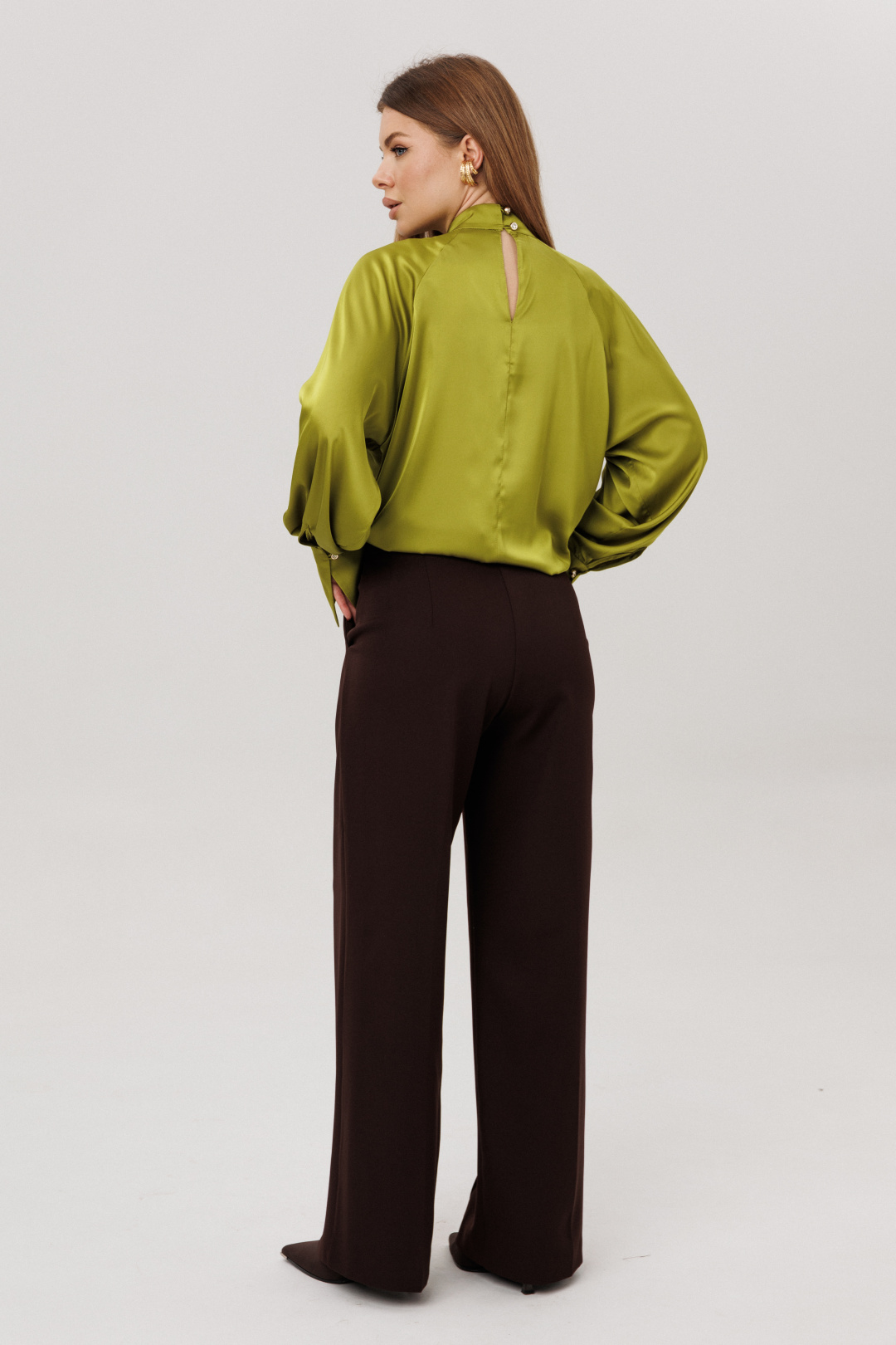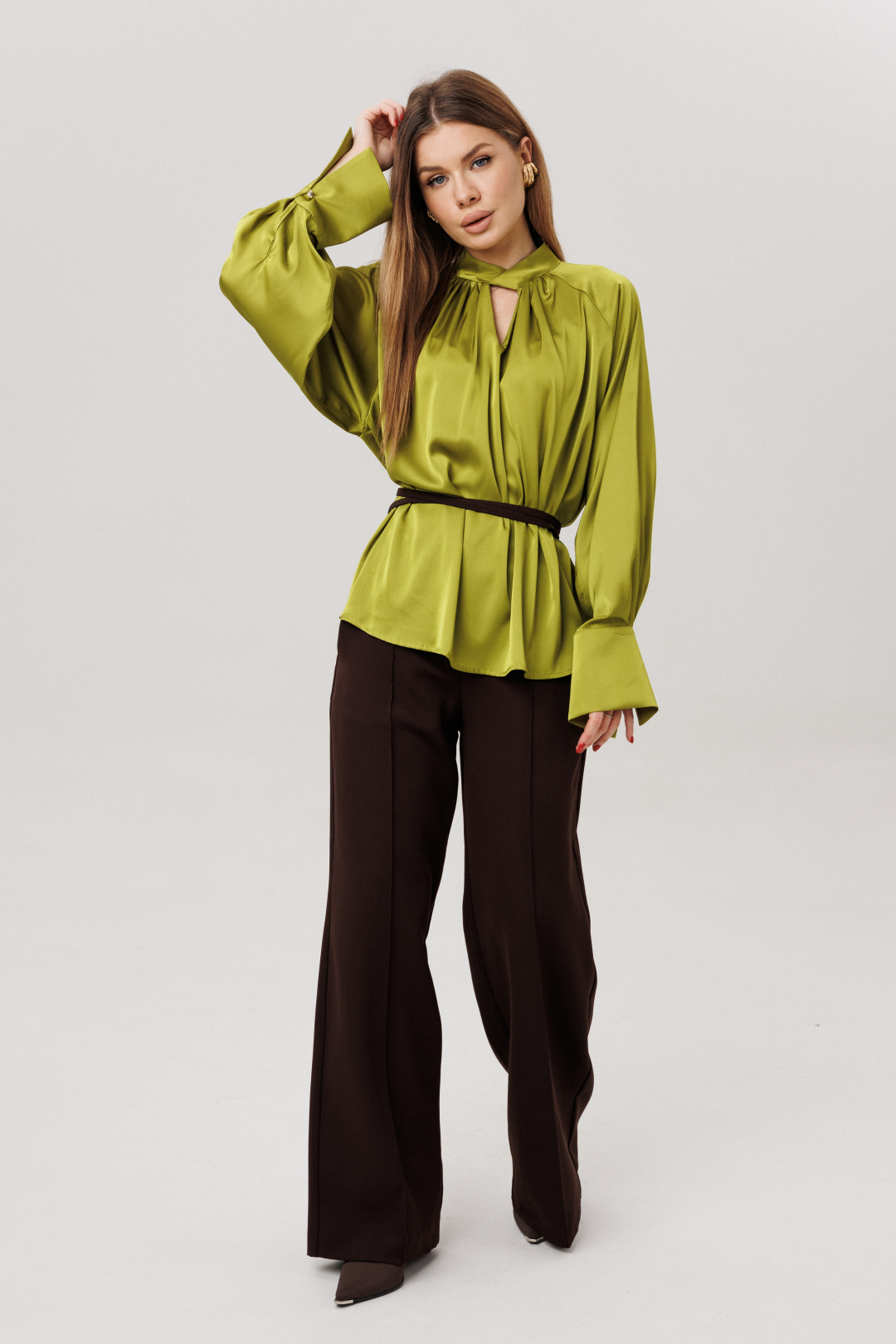Элегантная блузка прямого силуэта в изысканном оливковом оттенке. Модель выполнена с оригинальными акцентными рукавами длиной до запястья и регланом на плечах. Особый шик придают мягкие складки на передней части, добавляющие объем и фактуру. Застежка спереди представлена в виде двух петель с пуговицами на верхней части спины, что добавляет блузке дополнительный элемент изысканности. Эта модель идеально подойдет для создания как деловых, так и повседневных образов, обеспечивая комфорт и стильный внешний вид.