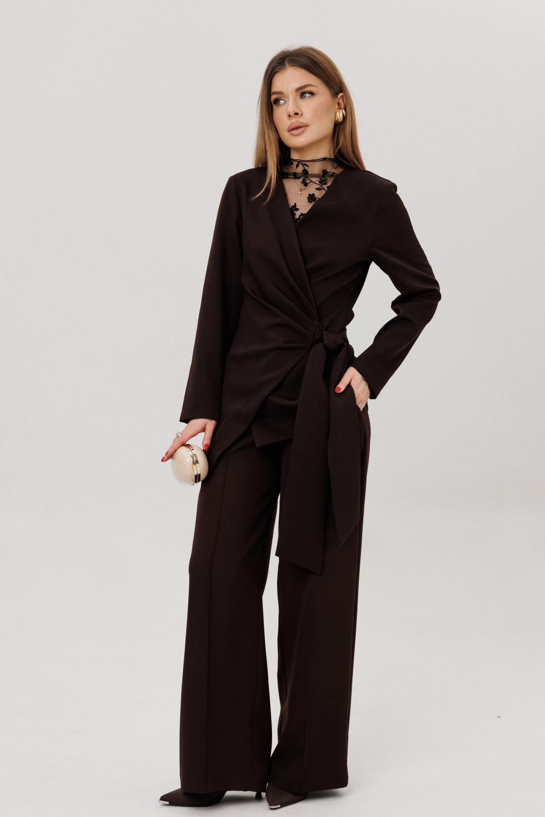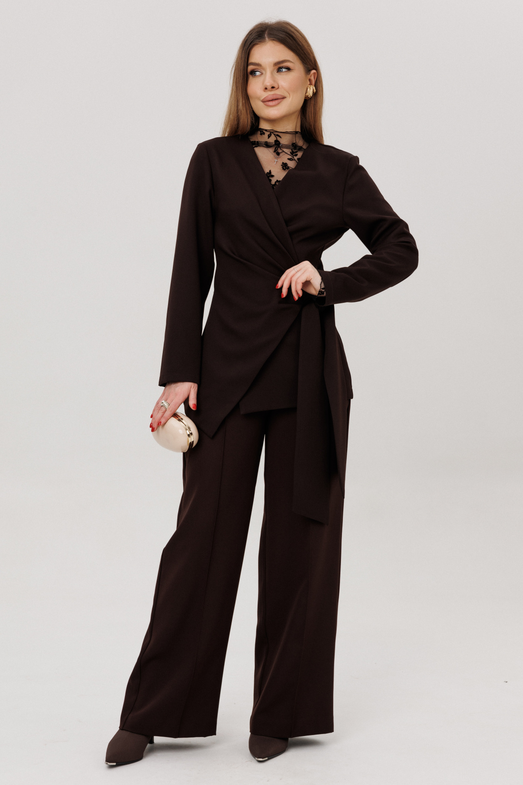 Жакет на запах приталенного силуэта с V-образным вырезом.По переду заложены складки. Застежка в виде пояса. Полочки ассиметричные по низу с заостренными углами. Перед жакета на подкладке. Элегантные женские брюки прямого кроя, по переду на брючинах стрелки. Модель с высокой посадкой на притачном поясе обеспечивает идеальное прилегание. Спереди расположена практичная застежка на тесьму-молнию, добавляющая удобства при носке. Брюки укомплектованы функциональными боковыми карманами, что придает модели дополнительную практичность и удобство