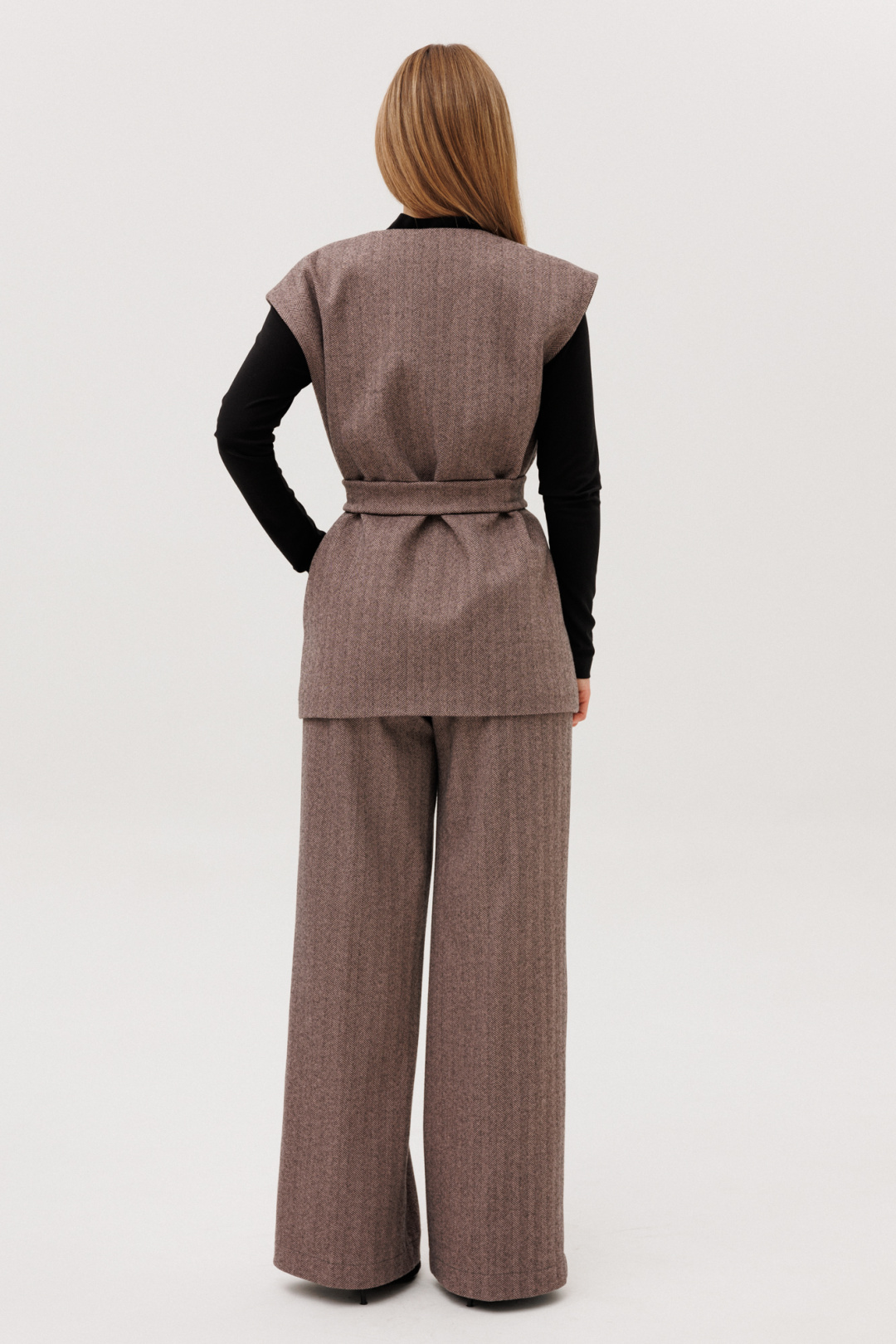 Костюм трехпредметный: Жилет женский свободного силуэта,с действующими карманами.По переду металлическая молния,пояс с пряжкой обтянутой из основной ткани.Элегантные женские брюки прямого кроя ,по переду на брючинах стрелки. Модель с высокой посадкой на притачном поясе обеспечивает идеальное прилегание. Спереди расположена практичная застежка на тесьму-молнию, добавляющая удобства при носке. Брюки укомплектованы функциональными боковыми карманами, что придает модели дополнительную практичность и удобство. Эта модель идеально подойдет как для офиса, так и для создания повседневных стильных образов.Джемпер женский прилегающего силуэта с втачным одношовным рукавом с воротником-стойкой.