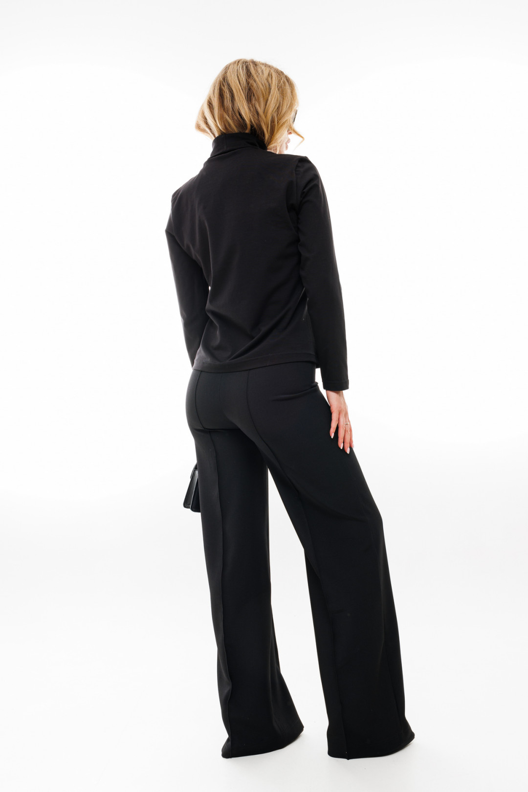 Элегантные,  с высокой посадкой и красивым облеганием бедра брюки. Застроченные стрелки прилают стройности и шика. Низ брюк умеренно широкий. Ноги при таком крое учеличиваются в длине. Застежка на потайную тесьму-молнию в  боковом шве.