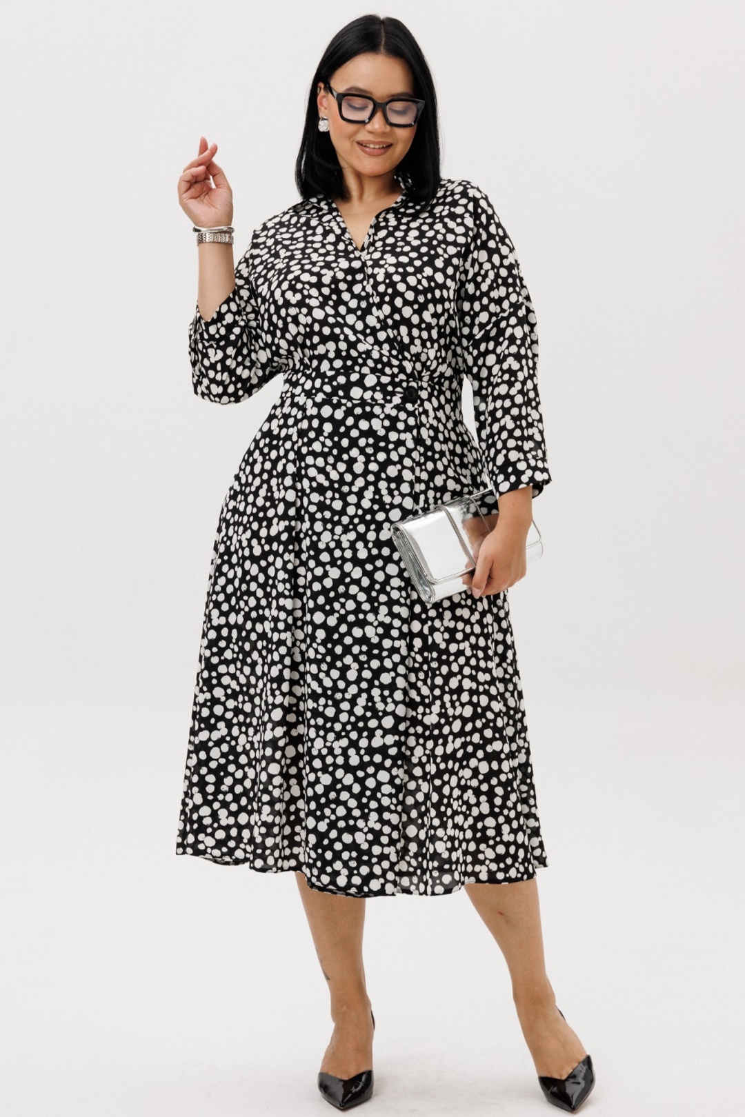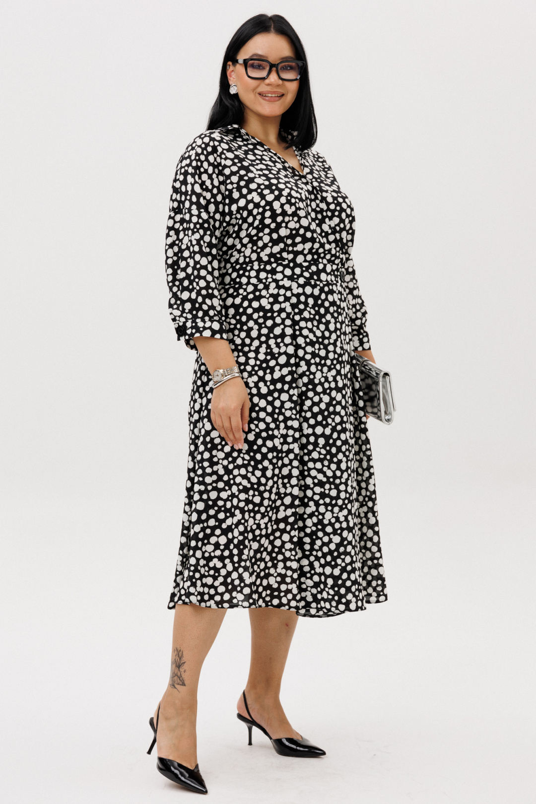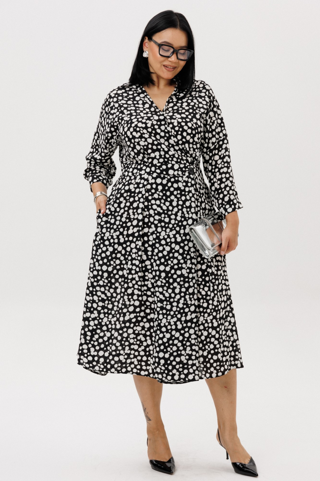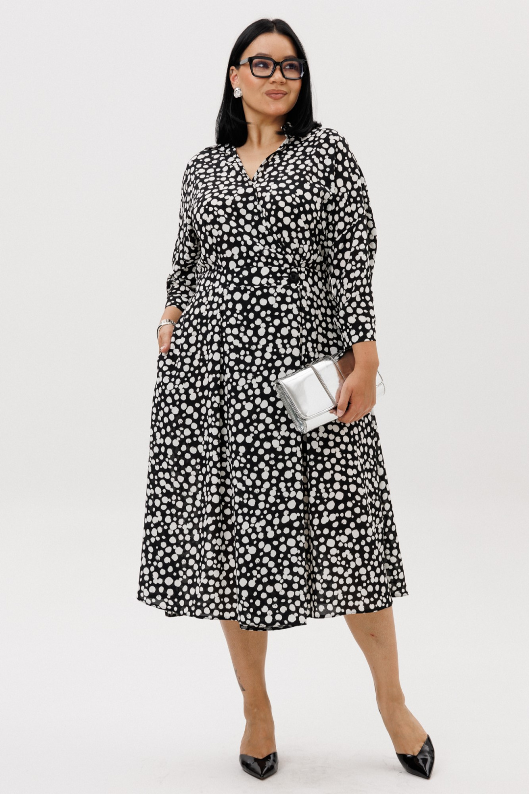 Элегантное женское платье необычного кроя станет изюминкой вашего гардероба. Платье полуприлегающего силуэта, отрезное по линии талии со спущенным плечом. Рукав 3/4 длиный на отрезной манжете. По полочке идут защипы-складки в верхней и нижней частях, запах - на петли и пуговицы по подрезу. По нижней части платья запах идет в виде складки. По спинке кокетка со складкой, по подрезу вставлена резинка. Юбка-полусолнце с односторонними складками по полочке, по бокам карманы. По горловине воротник на отрезной стойке. Платье будет идеально смотреться с туфлями, ботинкаи и сапогами. Длина по спинке: 117см. Длина рукава с манжето 29см.