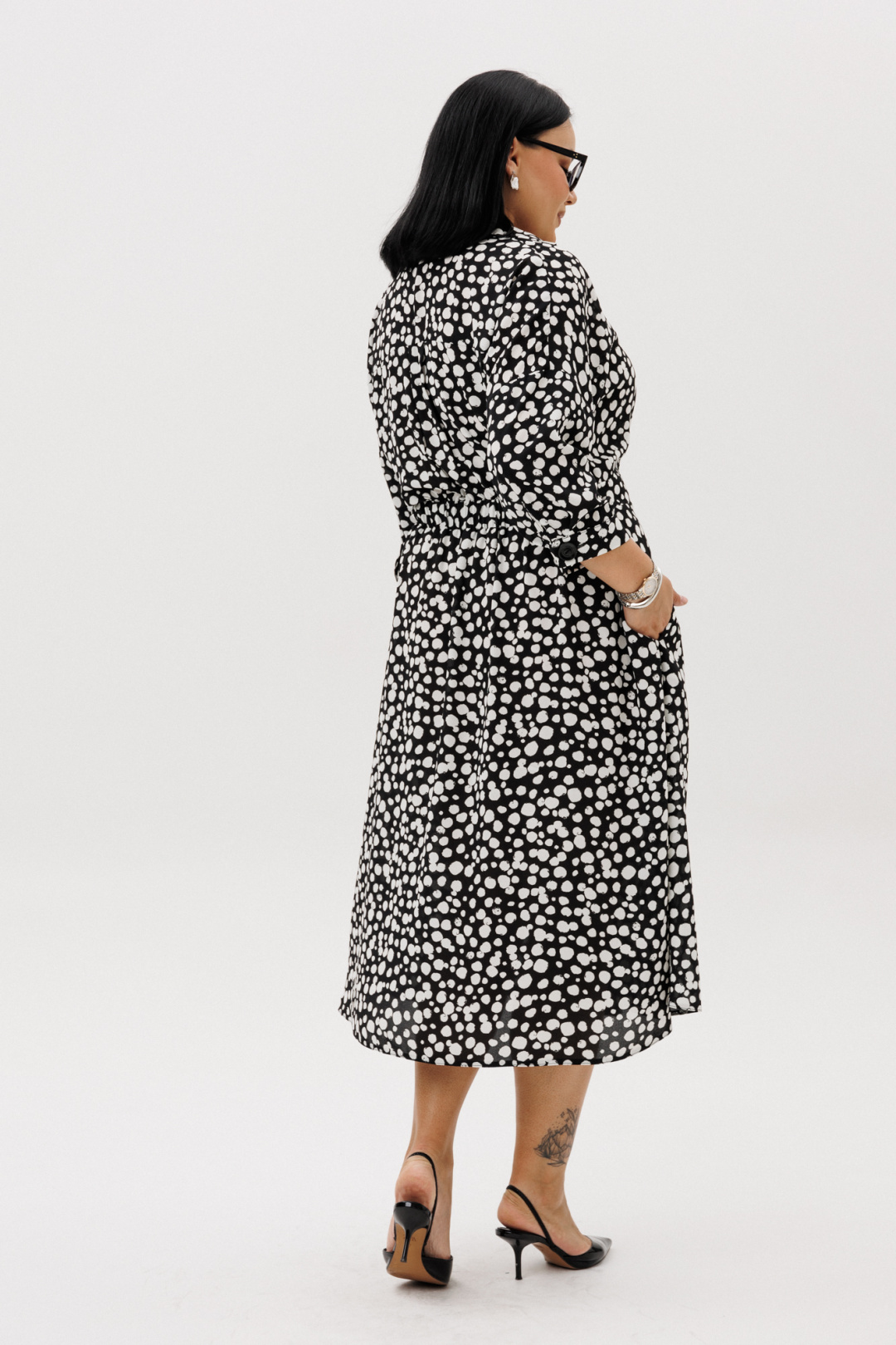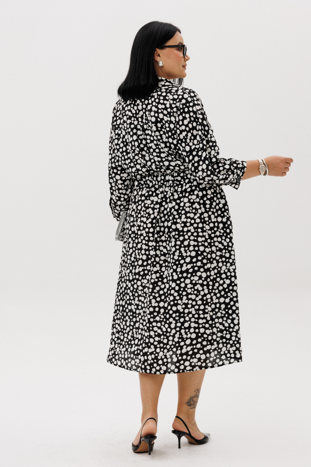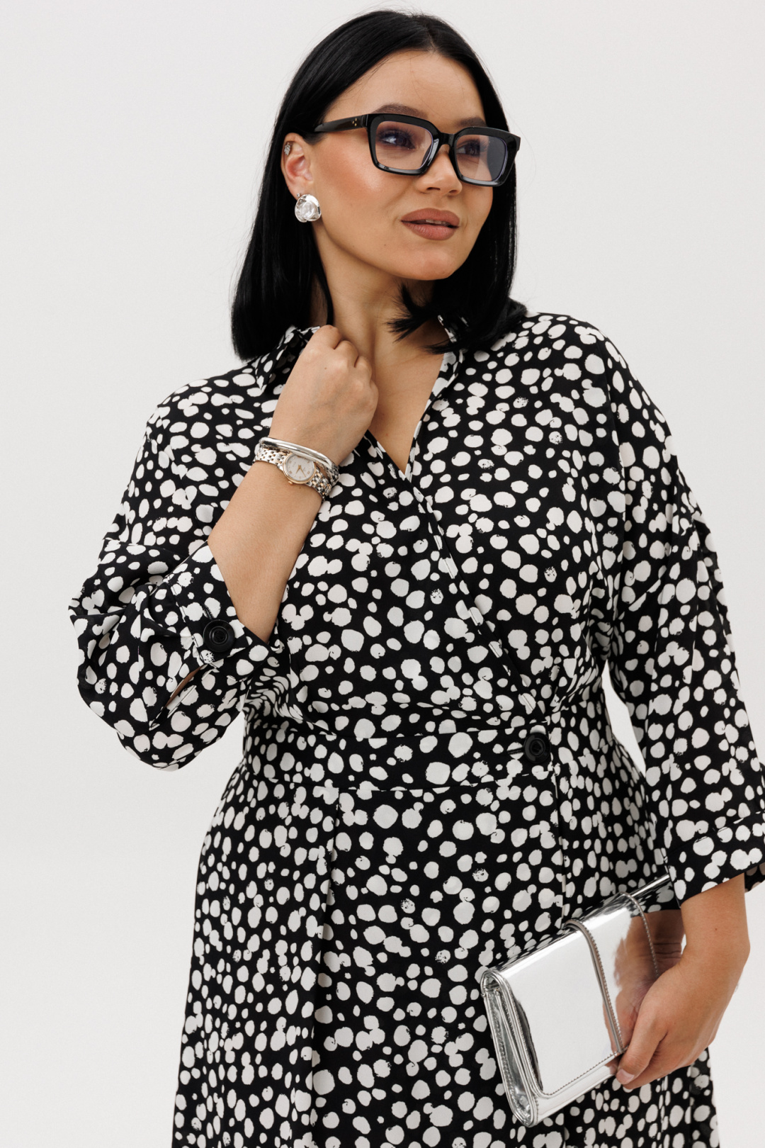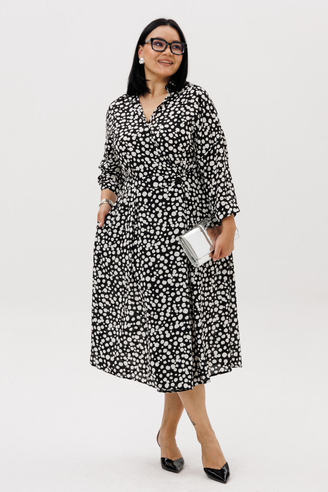 Элегантное женское платье необычного кроя станет изюминкой вашего гардероба. Платье полуприлегающего силуэта, отрезное по линии талии со спущенным плечом. Рукав 3/4 длиный на отрезной манжете. По полочке идут защипы-складки в верхней и нижней частях, запах - на петли и пуговицы по подрезу. По нижней части платья запах идет в виде складки. По спинке кокетка со складкой, по подрезу вставлена резинка. Юбка-полусолнце с односторонними складками по полочке, по бокам карманы. По горловине воротник на отрезной стойке. Платье будет идеально смотреться с туфлями, ботинкаи и сапогами. Длина по спинке: 117см. Длина рукава с манжето 29см.