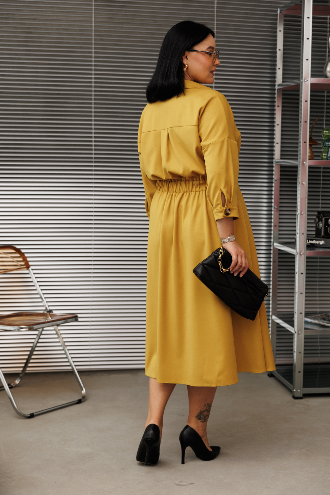 Элегантное женское палтье из костюмной ткани необычного кроя станет изюминкой вашего гардероба. Платье полуприлегающего силуэта, отрезное по линии талии со спущенным плечом. Рукав 3/4 длиный на отрезной манжете. По полочке идут защипы-складки в верхней и нижней частях, запах - на петли и пуговицы по подрезу. По нижней части платья запах идет в виде складки. По спинке кокетка со складкой, по подрезу вставлена резинка. Юбка-полусолнце с односторонними складками по полочке, по бокам карманы. По горловине воротник на отрезной стойке. Платье будет идеально смотреться с туфлями, ботинкаи и сапогами. Длина по спинке: 117см. Длина рукава с манжето 29см.