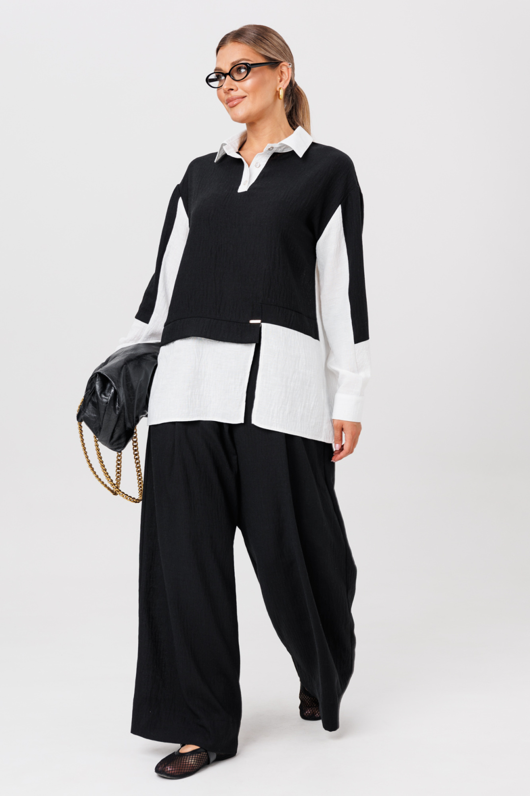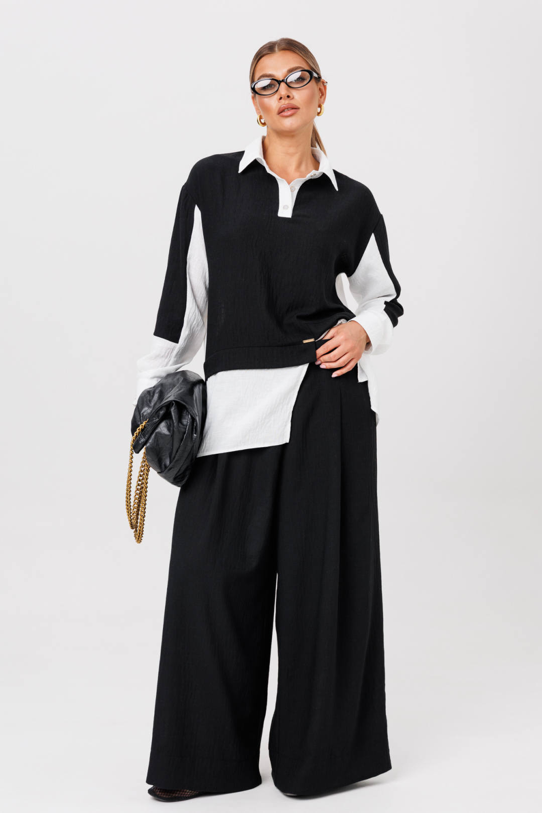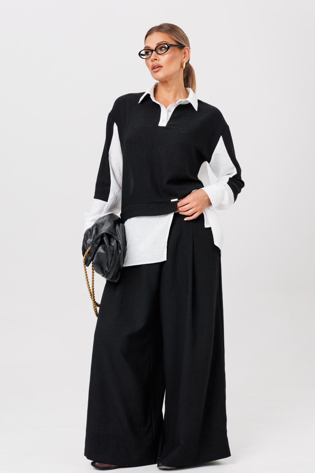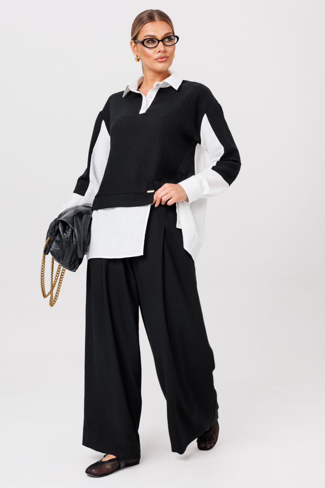 Комплект создан для тех, кто ценит комфорт и элегантность в каждой детали. В комплект входит блузка и штаны палаццо. Оверсайз крой придаёт костюму особый шарм и дает свободу движений. Высокая посадка и резинка по поясу подчёркивает талию и делает силуэт более изящным. Смесь натуральных материалов позволяет пропускать воздух. Ткань не мнется. Благодаря свободному крою костюм подойдёт для разных типов фигуры. Он подчеркнёт вашу индивидупльность. Блузка прямого силуэта, застежка на планку и пуговицы. Воротник на отрезной стойке. По полочке идет ассиметричный подрез со вставками из 2-х видов однотона и разрезом. Плечо спущенное, рукав длинный со вставками, на манжете. По спинке идет кокетка и встречная складка. Брюки полаццо из костюмной ткани, прямые с односторонней складкой и запахом по центру. По низу брюк широкая подгибка.Пояс на резинке . В качестве декора- брендированная металлическая нашивка по подрезу полочки. Длина по спинке (50-54) - 74 см, (56-60) - 76 см. Длина рукава (с манжетой): (50-54) - 57 см, (56-60)-59см. Длина брюк: (50-54) - 98 см, (56-60) - 99 см