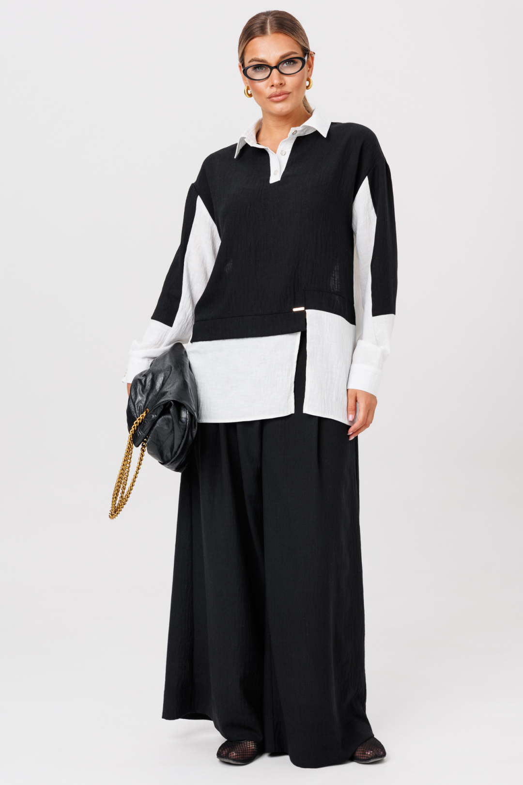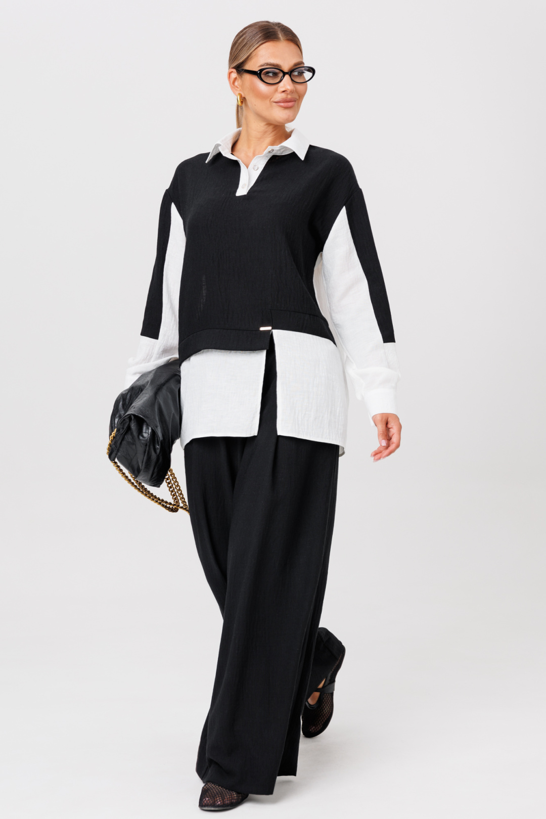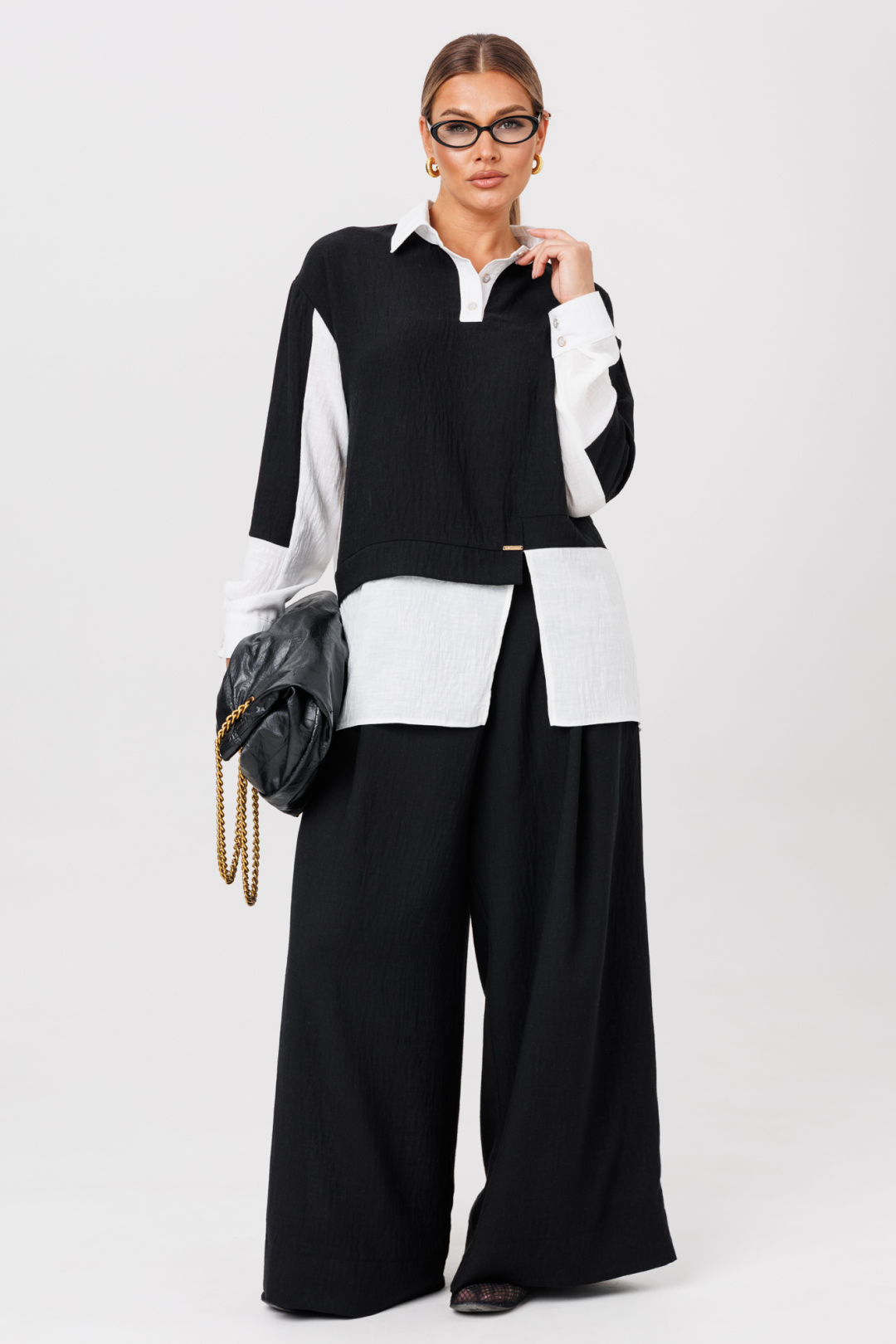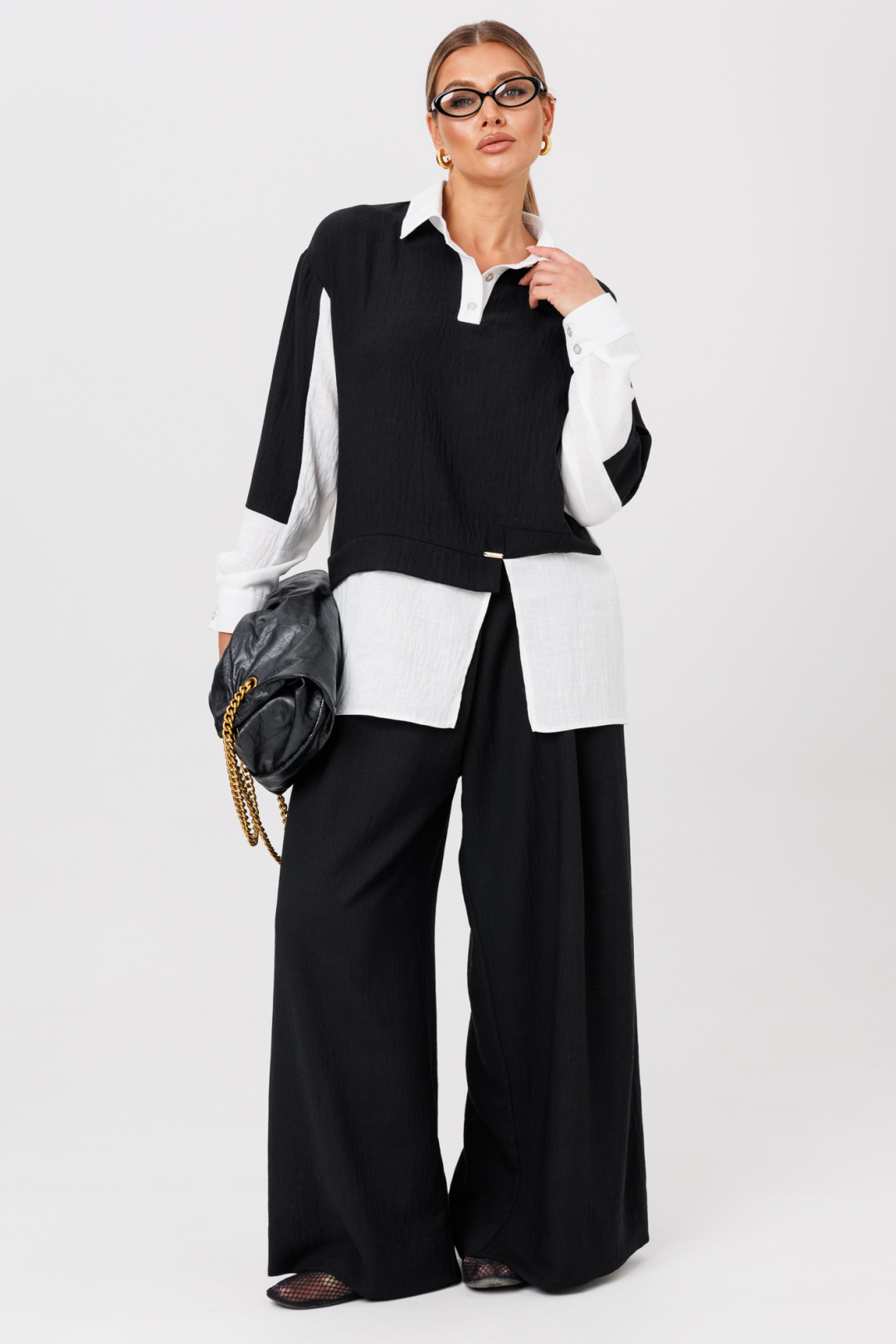Комплект создан для тех, кто ценит комфорт и элегантность в каждой детали. В комплект входит блузка и штаны палаццо. Оверсайз крой придаёт костюму особый шарм и дает свободу движений. Высокая посадка и резинка по поясу подчёркивает талию и делает силуэт более изящным. Смесь натуральных материалов позволяет пропускать воздух. Ткань не мнется. Благодаря свободному крою костюм подойдёт для разных типов фигуры. Он подчеркнёт вашу индивидупльность. Блузка прямого силуэта, застежка на планку и пуговицы. Воротник на отрезной стойке. По полочке идет ассиметричный подрез со вставками из 2-х видов однотона и разрезом. Плечо спущенное, рукав длинный со вставками, на манжете. По спинке идет кокетка и встречная складка. Брюки полаццо из костюмной ткани, прямые с односторонней складкой и запахом по центру. По низу брюк широкая подгибка.Пояс на резинке . В качестве декора- брендированная металлическая нашивка по подрезу полочки. Длина по спинке (50-54) - 74 см, (56-60) - 76 см. Длина рукава (с манжетой): (50-54) - 57 см, (56-60)-59см. Длина брюк: (50-54) - 98 см, (56-60) - 99 см