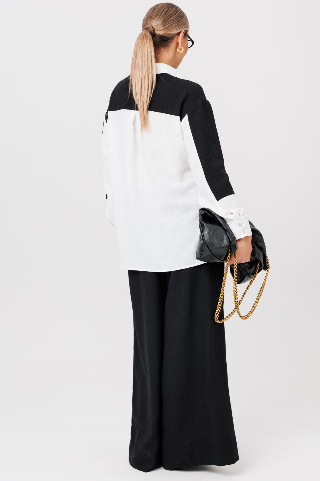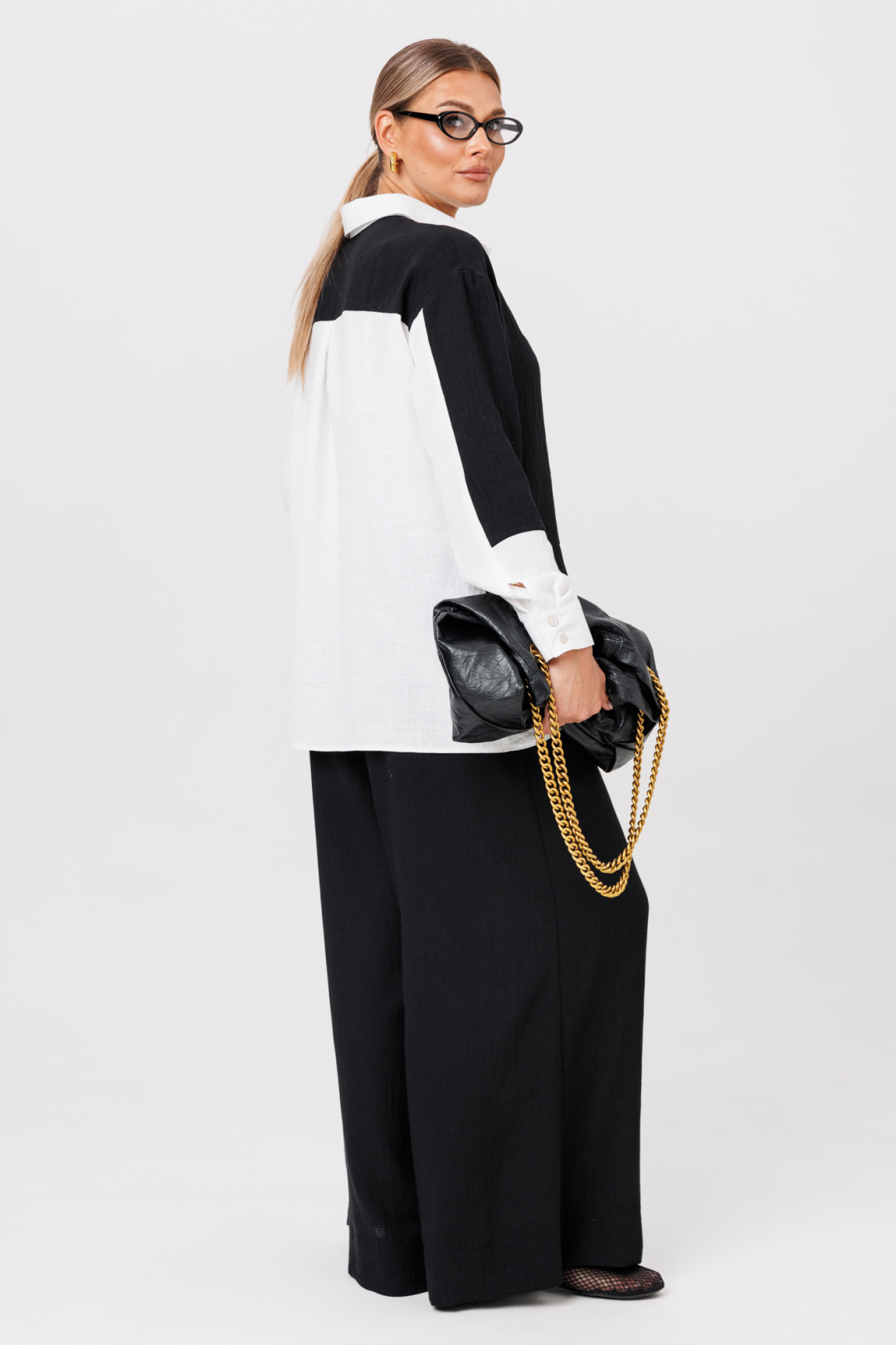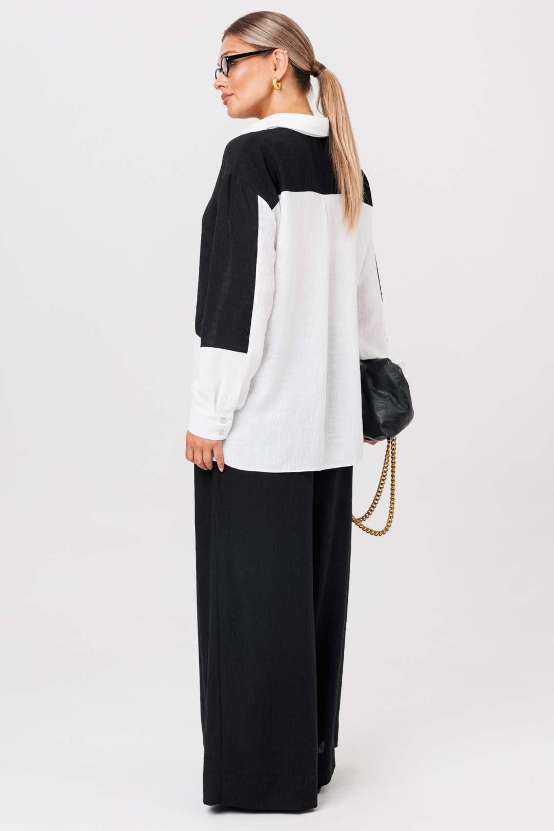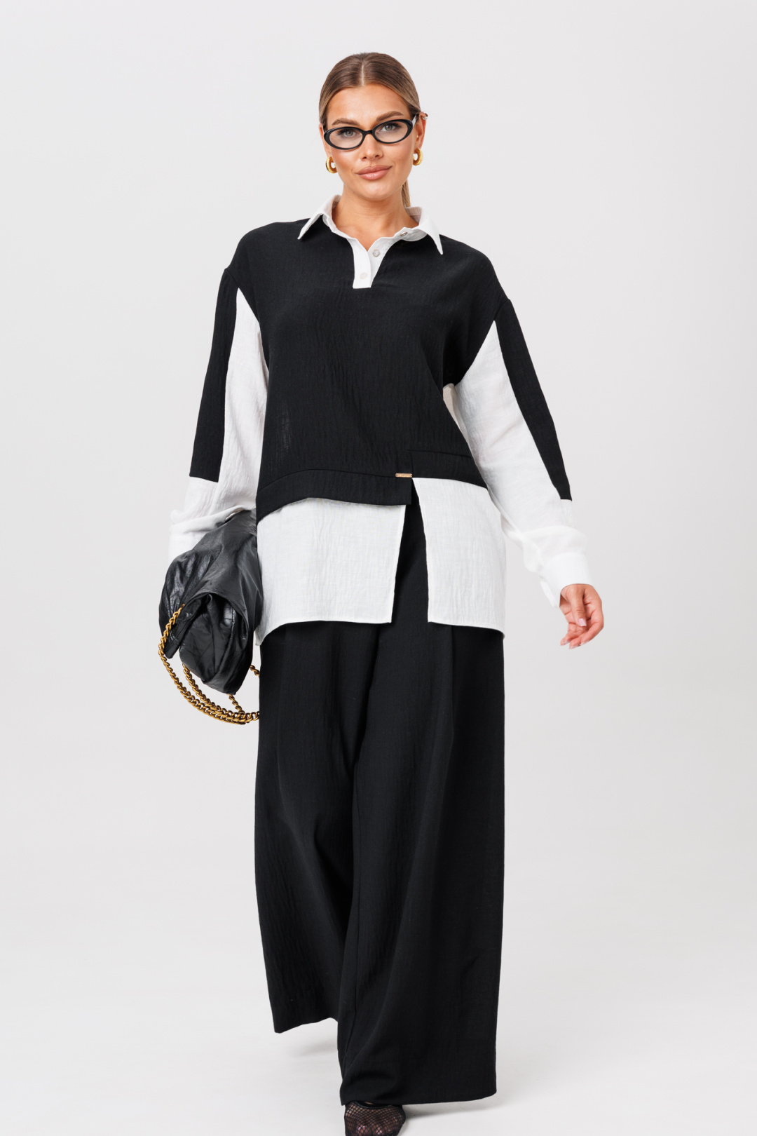 Комплект создан для тех, кто ценит комфорт и элегантность в каждой детали. В комплект входит блузка и штаны палаццо. Оверсайз крой придаёт костюму особый шарм и дает свободу движений. Высокая посадка и резинка по поясу подчёркивает талию и делает силуэт более изящным. Смесь натуральных материалов позволяет пропускать воздух. Ткань не мнется. Благодаря свободному крою костюм подойдёт для разных типов фигуры. Он подчеркнёт вашу индивидупльность. Блузка прямого силуэта, застежка на планку и пуговицы. Воротник на отрезной стойке. По полочке идет ассиметричный подрез со вставками из 2-х видов однотона и разрезом. Плечо спущенное, рукав длинный со вставками, на манжете. По спинке идет кокетка и встречная складка. Брюки полаццо из костюмной ткани, прямые с односторонней складкой и запахом по центру. По низу брюк широкая подгибка.Пояс на резинке . В качестве декора- брендированная металлическая нашивка по подрезу полочки. Длина по спинке (50-54) - 74 см, (56-60) - 76 см. Длина рукава (с манжетой): (50-54) - 57 см, (56-60)-59см. Длина брюк: (50-54) - 98 см, (56-60) - 99 см