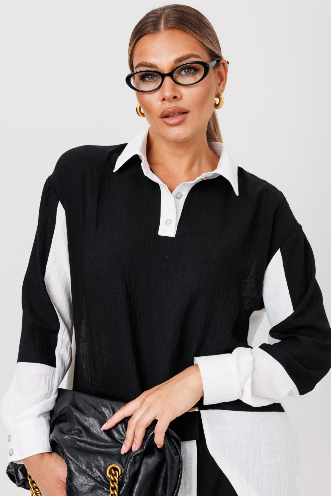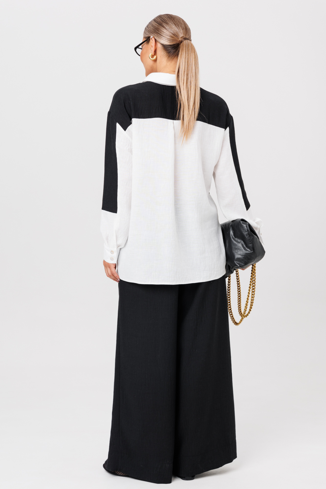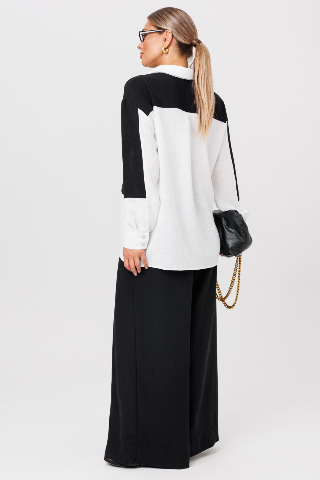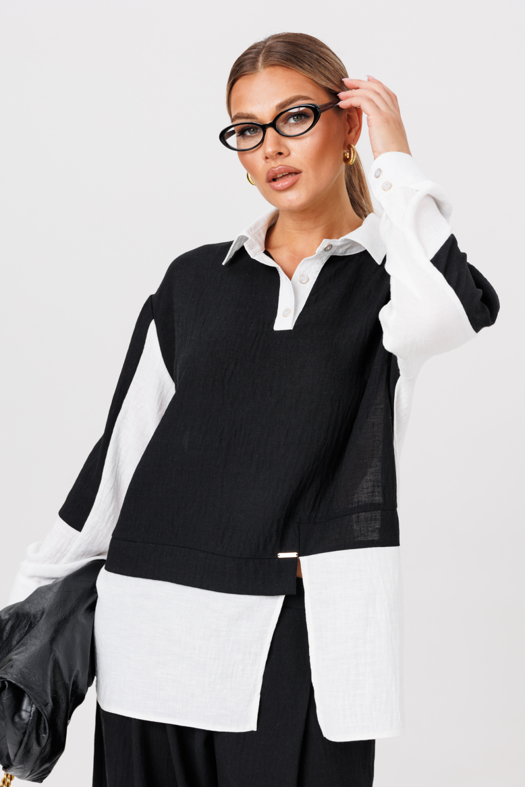Комплект создан для тех, кто ценит комфорт и элегантность в каждой детали. В комплект входит блузка и штаны палаццо. Оверсайз крой придаёт костюму особый шарм и дает свободу движений. Высокая посадка и резинка по поясу подчёркивает талию и делает силуэт более изящным. Смесь натуральных материалов позволяет пропускать воздух. Ткань не мнется. Благодаря свободному крою костюм подойдёт для разных типов фигуры. Он подчеркнёт вашу индивидупльность. Блузка прямого силуэта, застежка на планку и пуговицы. Воротник на отрезной стойке. По полочке идет ассиметричный подрез со вставками из 2-х видов однотона и разрезом. Плечо спущенное, рукав длинный со вставками, на манжете. По спинке идет кокетка и встречная складка. Брюки полаццо из костюмной ткани, прямые с односторонней складкой и запахом по центру. По низу брюк широкая подгибка.Пояс на резинке . В качестве декора- брендированная металлическая нашивка по подрезу полочки. Длина по спинке (50-54) - 74 см, (56-60) - 76 см. Длина рукава (с манжетой): (50-54) - 57 см, (56-60)-59см. Длина брюк: (50-54) - 98 см, (56-60) - 99 см