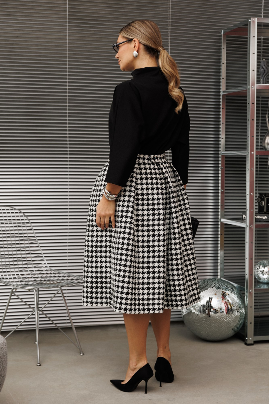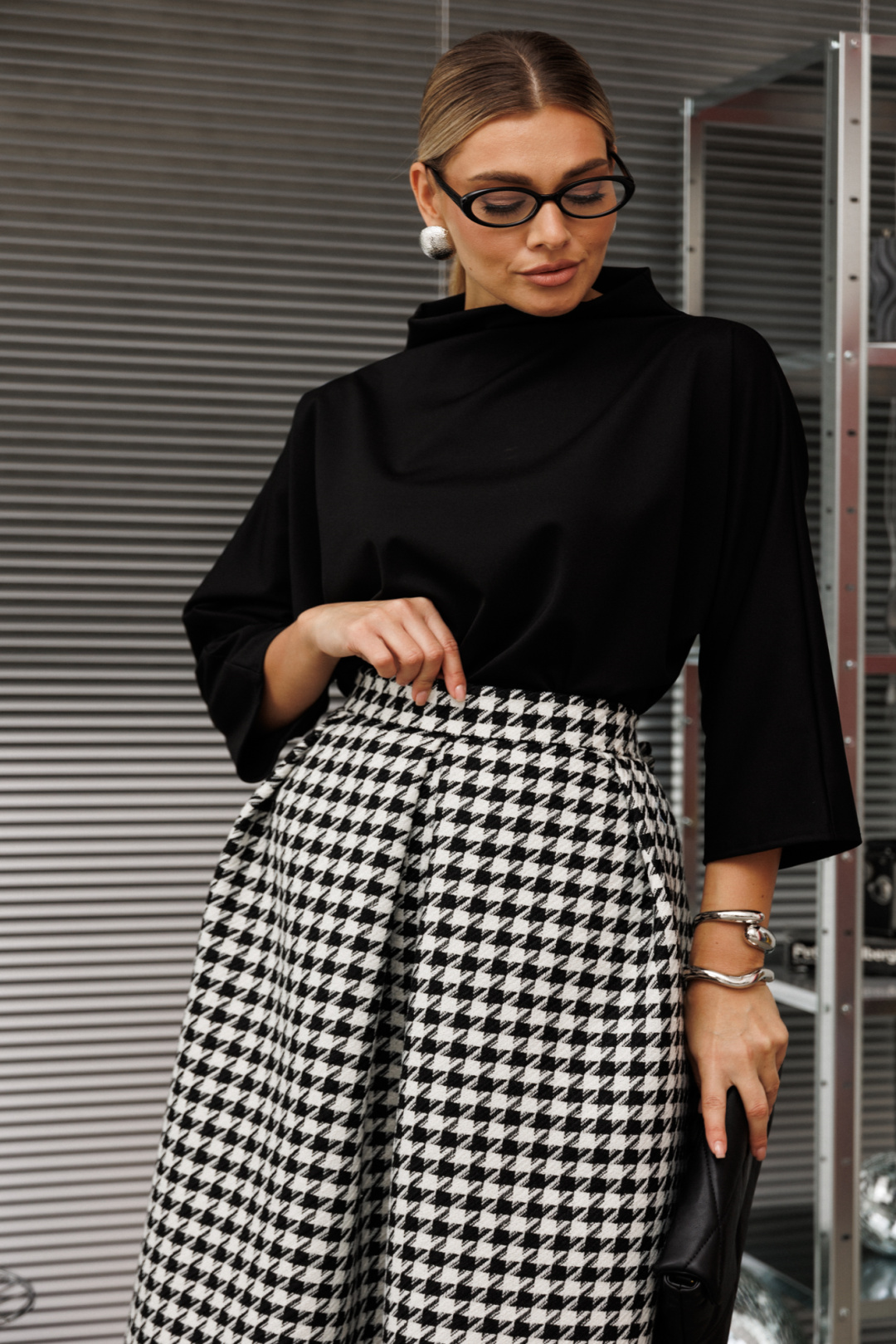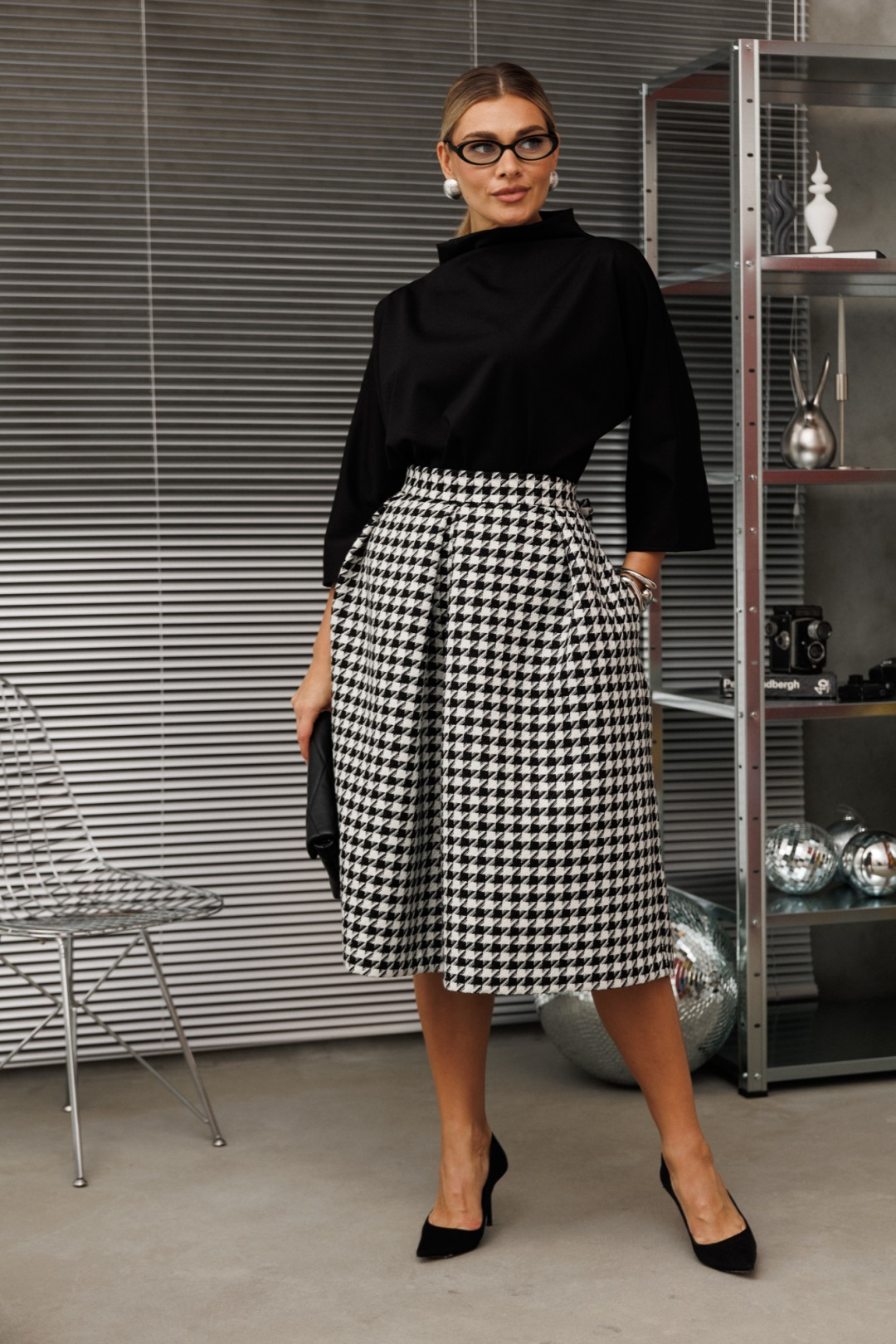 Представляем вашему вниманию стильный и уютный комплект, который станет настоящим маст-хэвом в вашем гардеробе. Классический дизайн в стиле олд мани создает атмосферу расслабленности и уюта, что особенно приятно в прохладные осенние и зимние дни. Этот комплект станет вашим верным спутником в любой ситуации, добавляя нотки элегантности и шарма в вашу повседневную жизнь. Отражает роскошь, придает элегантность и изысканность, будет великолепно смотреться на любой фигуре и привлечет к вам внимание окружающих. Комплект женский 2-х предметный (блузка, юбка).Блузка женская ,прямого силуэта, из трикотажного полотна , со спущенным плечом. Рукав "летучая мышь", 3/4 длины. Горловина цельнокроенная в виде стойки. Юбка из фактурной ткани в рубкик с принтом гусиная лапка - теплая, плотная и качественная, практически не мнется. В верхней части идут складки: по центру-встречная, по бокам - односторонние. Пояс отрезной, по бокам карманы. Застежка по спинке на потайную молнию и пуговицу. Юбка на подкладке. Отдельные части комлекта будут легко сочитаться с вещеми из вашего гардероба. Длина блузки(по спинке): (50-56)-65 см. Длина рукава от головины: (50-56) -56 см. Длина юбки - 72см.