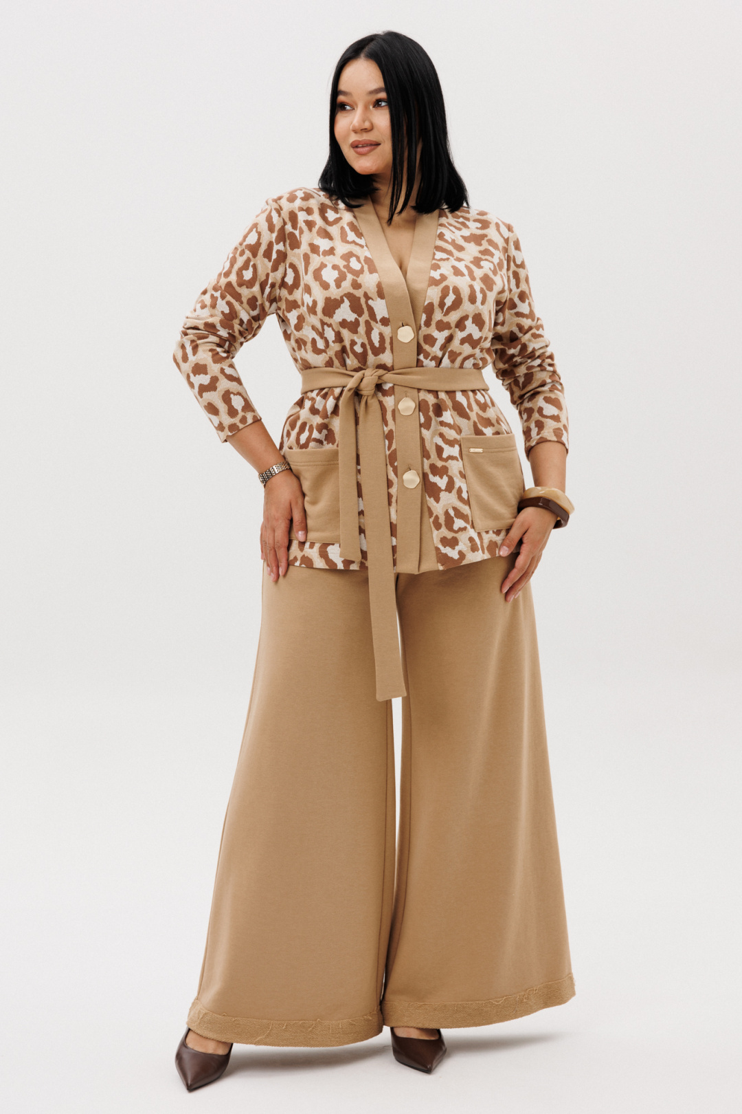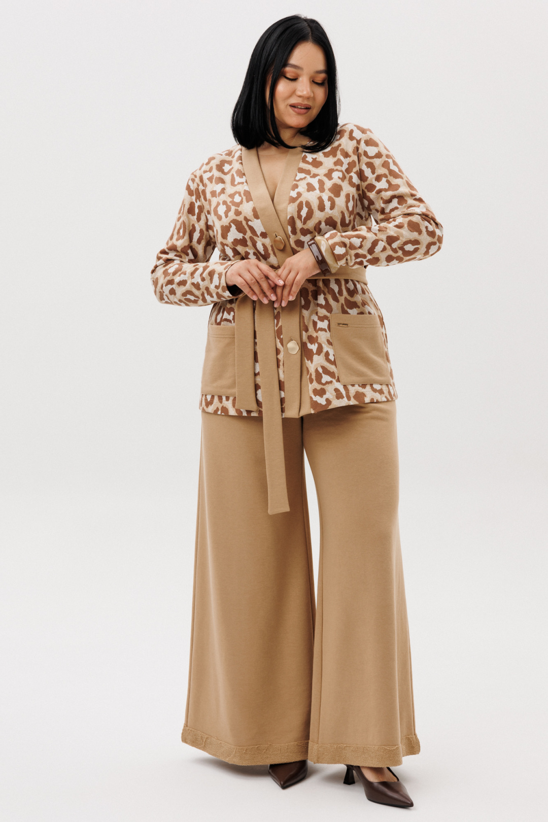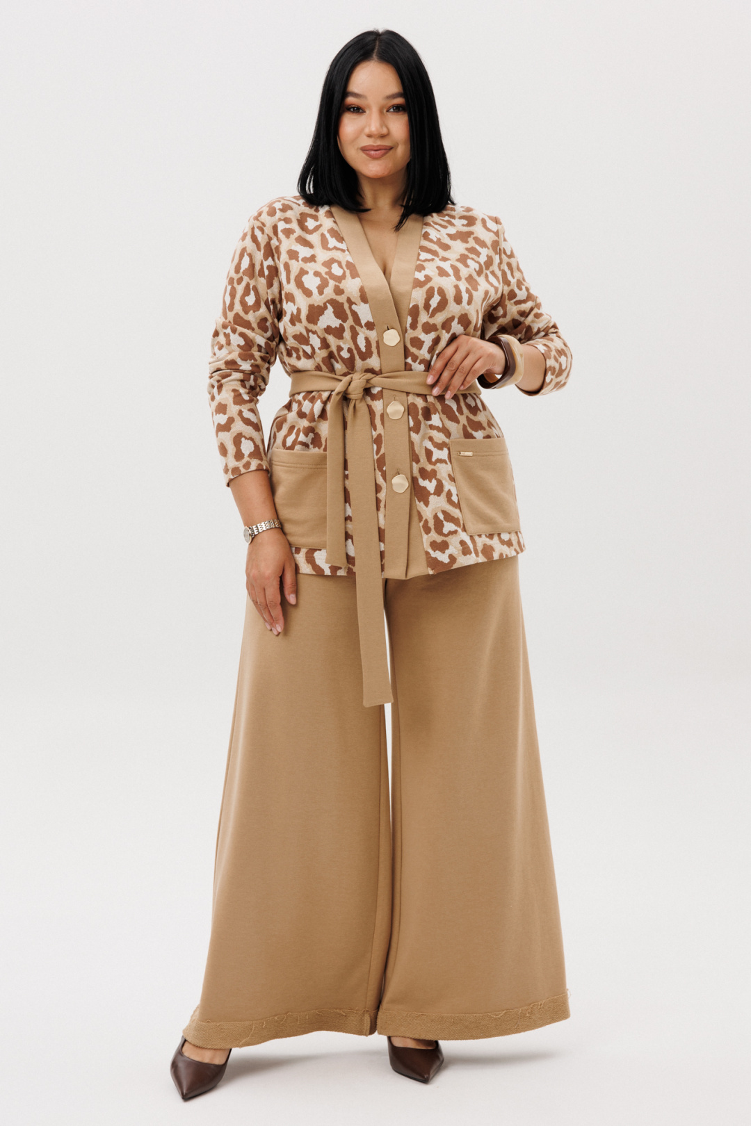 Шикарный трикотажный женский комплект от бренда Anastasia, идеальный для любого случая. Этот комплект сочетает в себе элегантность и комфорт, что делает его подходящим как для деловых встреч или прогулок. Комплект состоит из жакета и брюк. Жакет прямого силуэта. Застежка- планка с пуговицами. По полочке идут накладные карманы. Рукав втачной, одношовный. Подчеркнуть талию можно съемным поясом. В качестве декора- брендированная нашивка на кармане, перекликающаяся с золотыми пуговицами. Стильный комплект отлично подойдет для долгих прогулок или для работы, для офиса. Брюки, расширенные к низу, пояс на резинке, по бокам карманы. Отворот по низу на изнанку. Отдельный части костюма легко будут сочетаться с вещами из Вашего гардероба. Модель можно отнести к стилю кэжуал. Костюм можно носить с туфлями, кроссовками или ботинками. Обязательно добавьте наш бренд в избранное и следите за новинками, распродажами, скидками и акциями! Хороших покупок от «Анастасия». Длина (по спинке):(50-54)- 68см, (56-60)-71 см. Длина рукава: (50-60)- 60см. Длина брюк: (50-54):- 101см, (56-60)- 104см.
