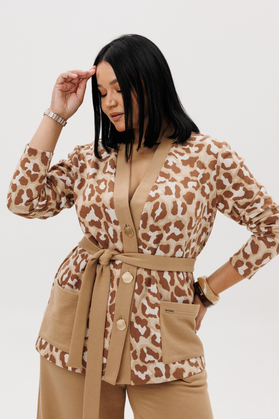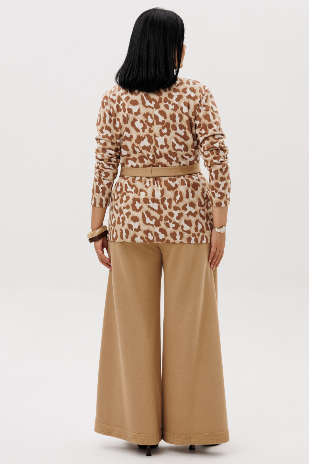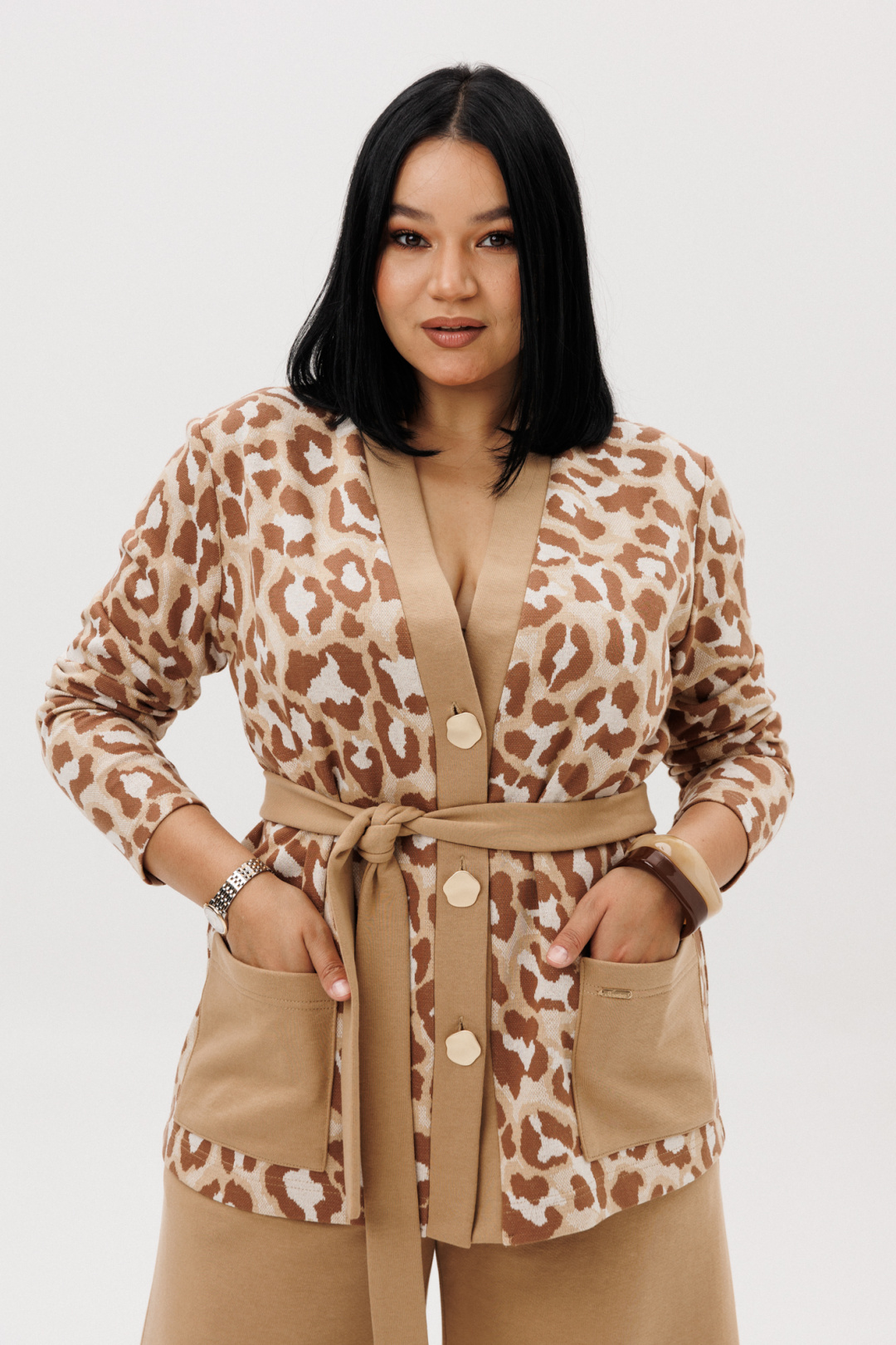 Шикарный трикотажный женский комплект от бренда Anastasia, идеальный для любого случая. Этот комплект сочетает в себе элегантность и комфорт, что делает его подходящим как для деловых встреч или прогулок. Комплект состоит из жакета и брюк. Жакет прямого силуэта. Застежка- планка с пуговицами. По полочке идут накладные карманы. Рукав втачной, одношовный. Подчеркнуть талию можно съемным поясом. В качестве декора- брендированная нашивка на кармане, перекликающаяся с золотыми пуговицами. Стильный комплект отлично подойдет для долгих прогулок или для работы, для офиса. Брюки, расширенные к низу, пояс на резинке, по бокам карманы. Отворот по низу на изнанку. Отдельный части костюма легко будут сочетаться с вещами из Вашего гардероба. Модель можно отнести к стилю кэжуал. Костюм можно носить с туфлями, кроссовками или ботинками. Обязательно добавьте наш бренд в избранное и следите за новинками, распродажами, скидками и акциями! Хороших покупок от «Анастасия». Длина (по спинке):(50-54)- 68см, (56-60)-71 см. Длина рукава: (50-60)- 60см. Длина брюк: (50-54):- 101см, (56-60)- 104см.