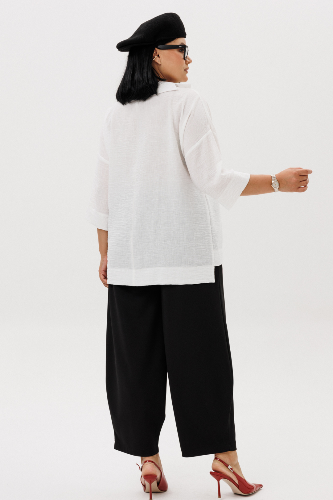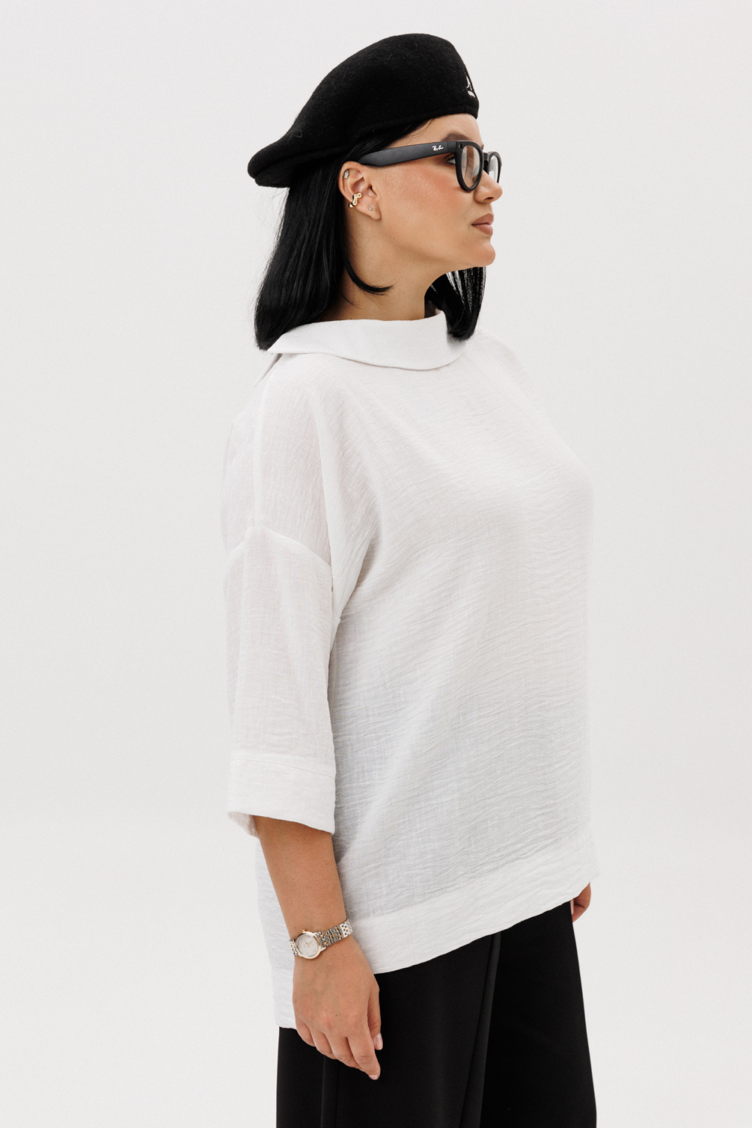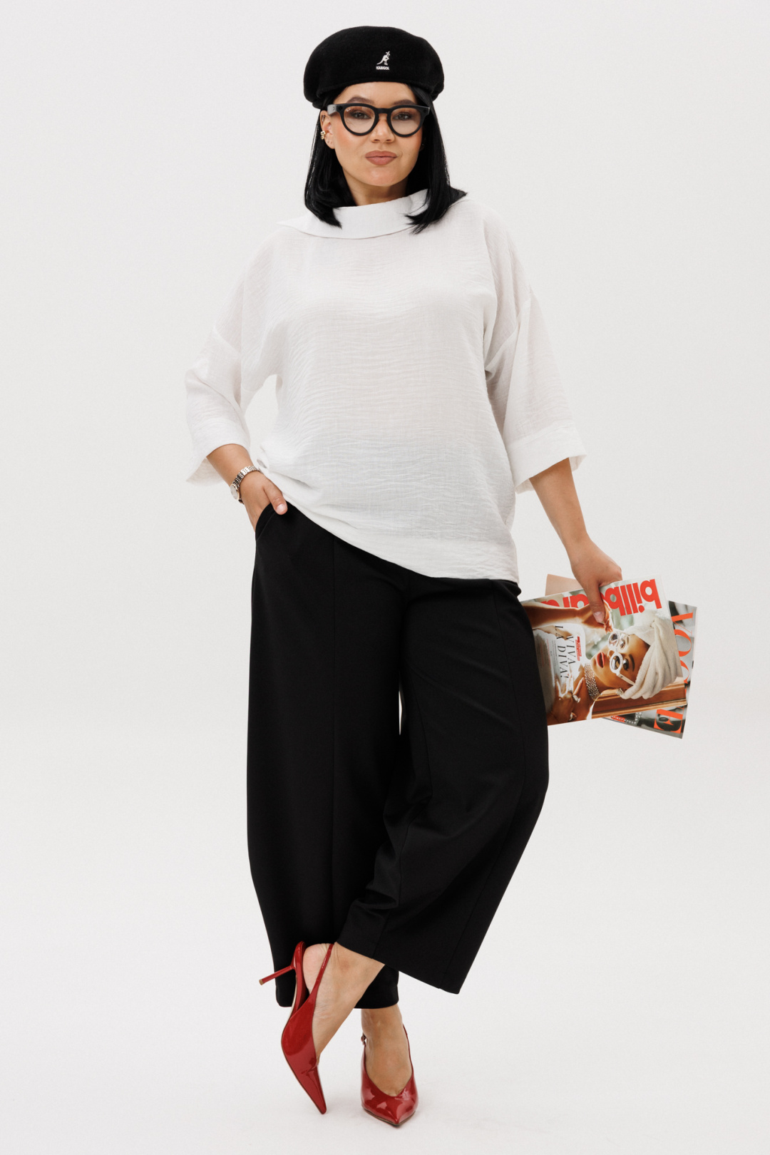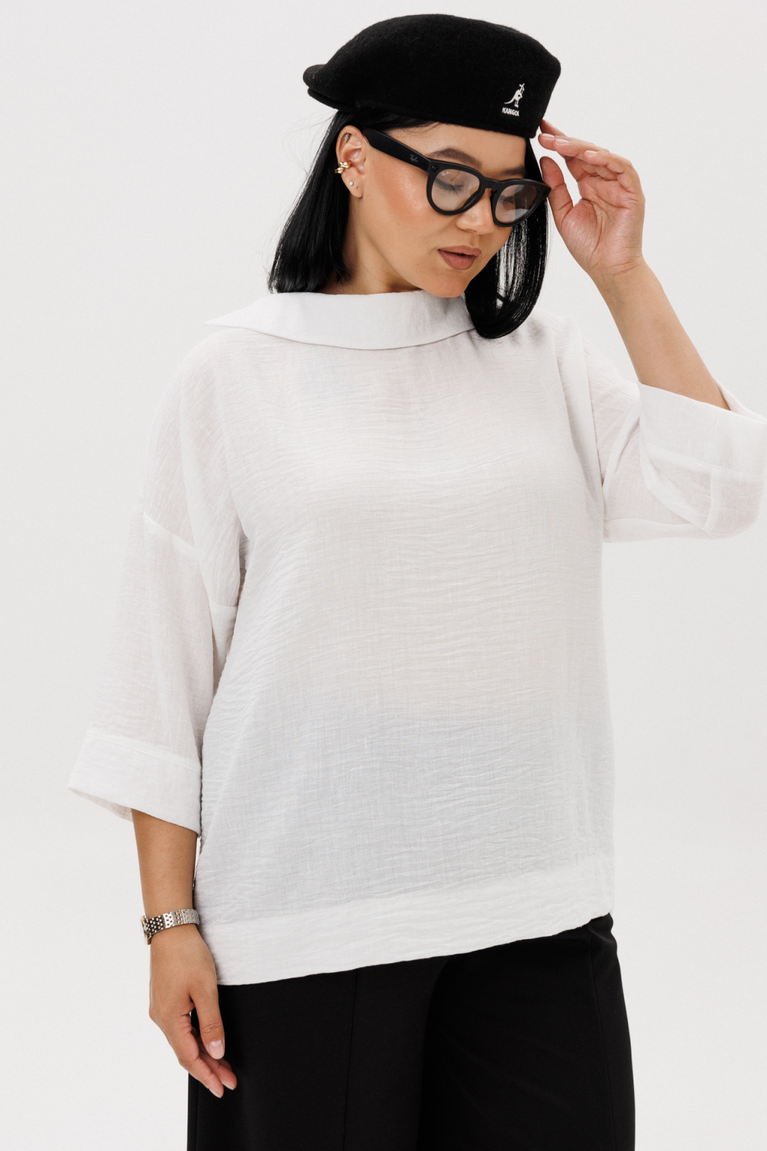 Комплект женский кэжуал (casual) свободного кроя, который создает расслабленный силуэт - это отличный выбор для активных и стильных девушек и женщин, которые ценят моду и комфорт! Комплект женский 2-х предметный (блузка, брюки). Блузка прямого силуэта со спущенным плечом. Рукав 3/4 длины с манжетой. Спинка длиннее полочки. Воротник стояче-отложной на отрезной стойке. Брюки - алладины из трикотажного полотна. Свободный фасон от бедра и лёгкое заужение книзу визуально делают ноги стройнее и длиннее. Эластичный пояс и удобные глубокие карманы придают брюкам не только стиль, но и функциональность. По бокам карманы. Благодаря мягкой резинке модель удачно садится практически на любую фигуру. По передней части от пояса идут рельефы, визуально удлинняющие фигуру. Благодаря крою и ткани брюки идеально подойдут как демисезонный вариант. А также в них комфортно весной и летом - практически универсальный вариант. Длина блузки (по спинке ) -69см. Длина рукава с манжетой - 27см. Длина брюк: (48-52)-94см, (54-58)-96см