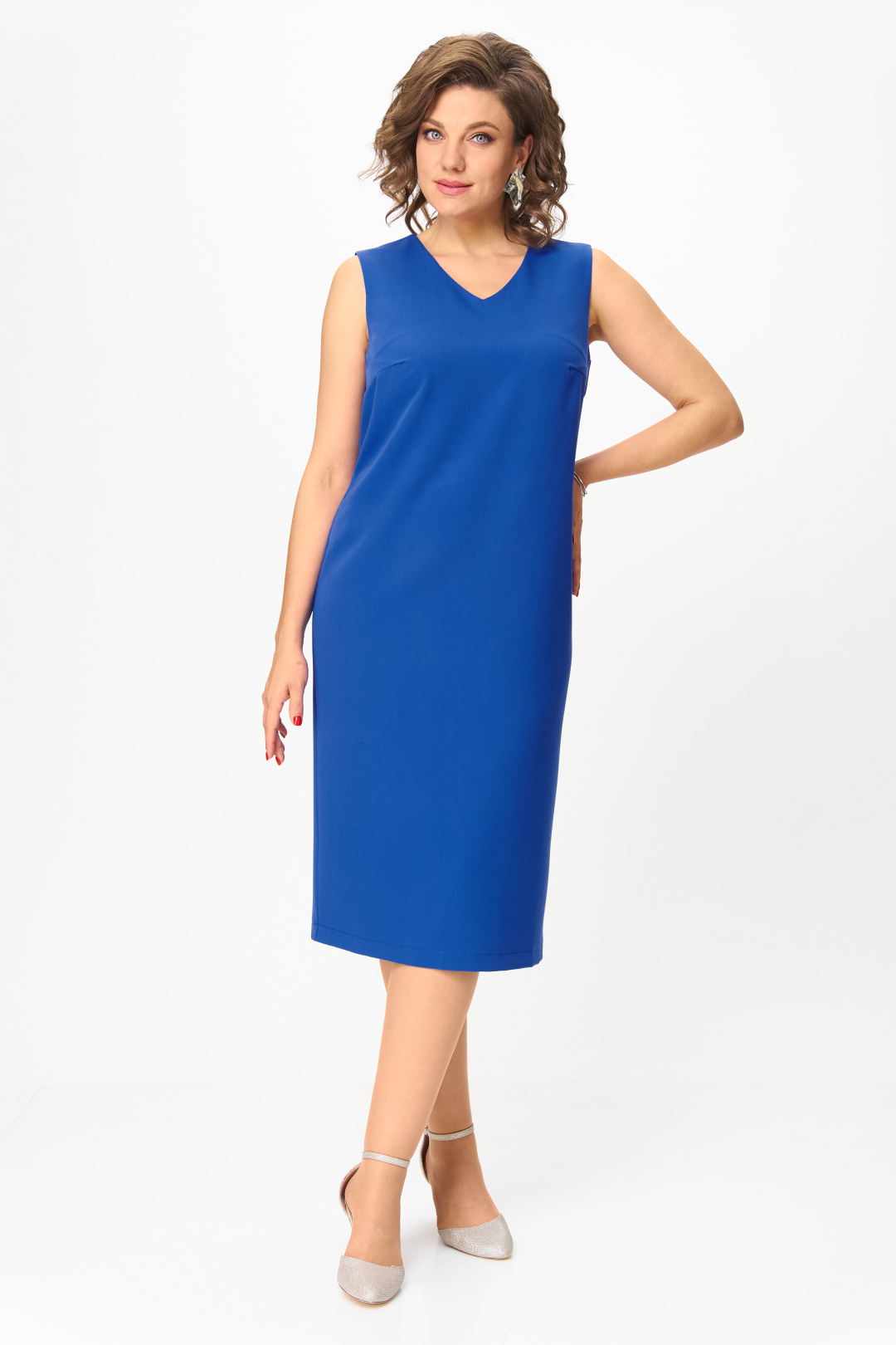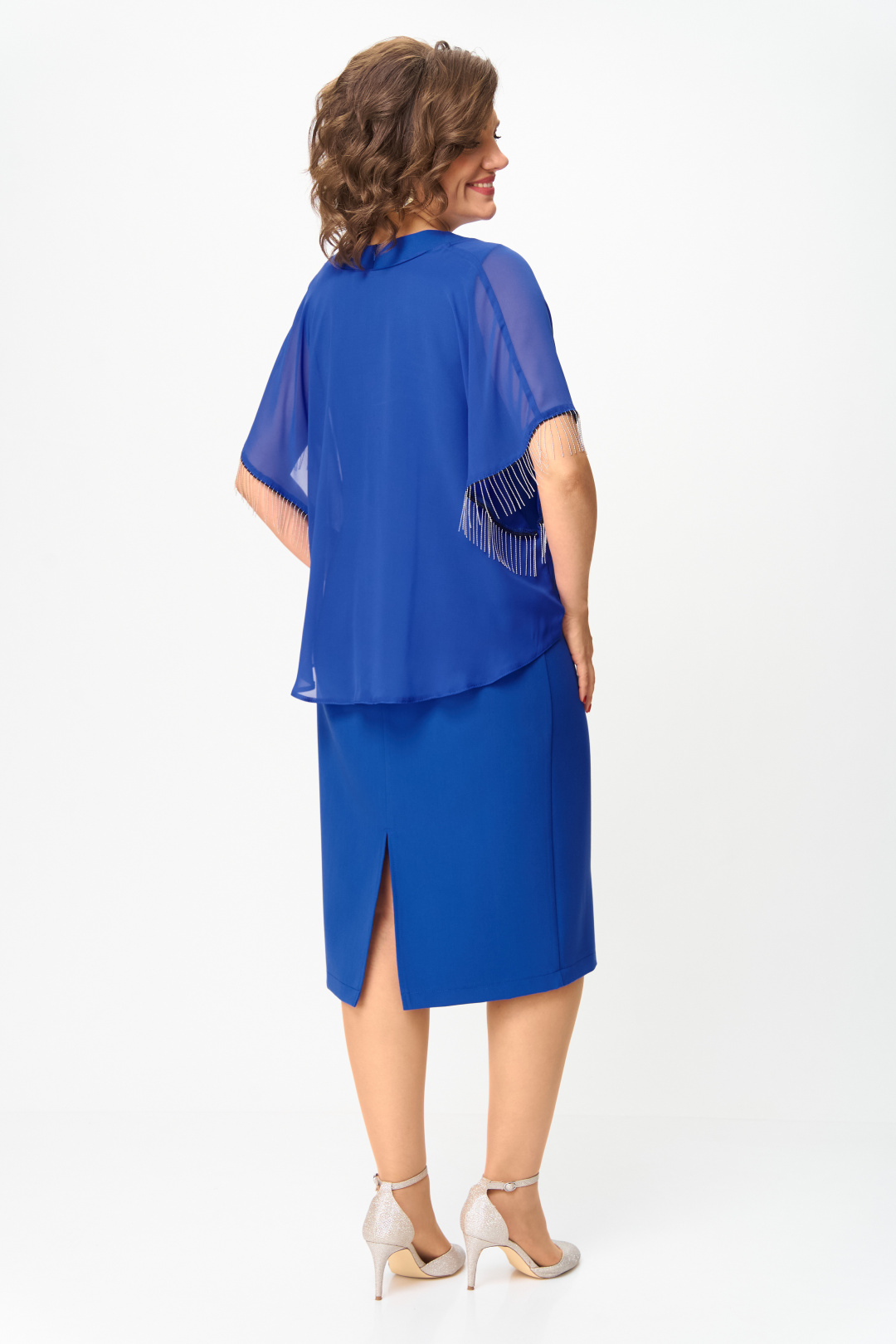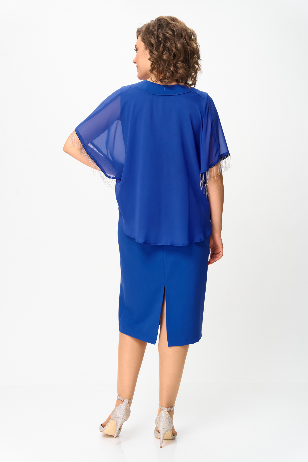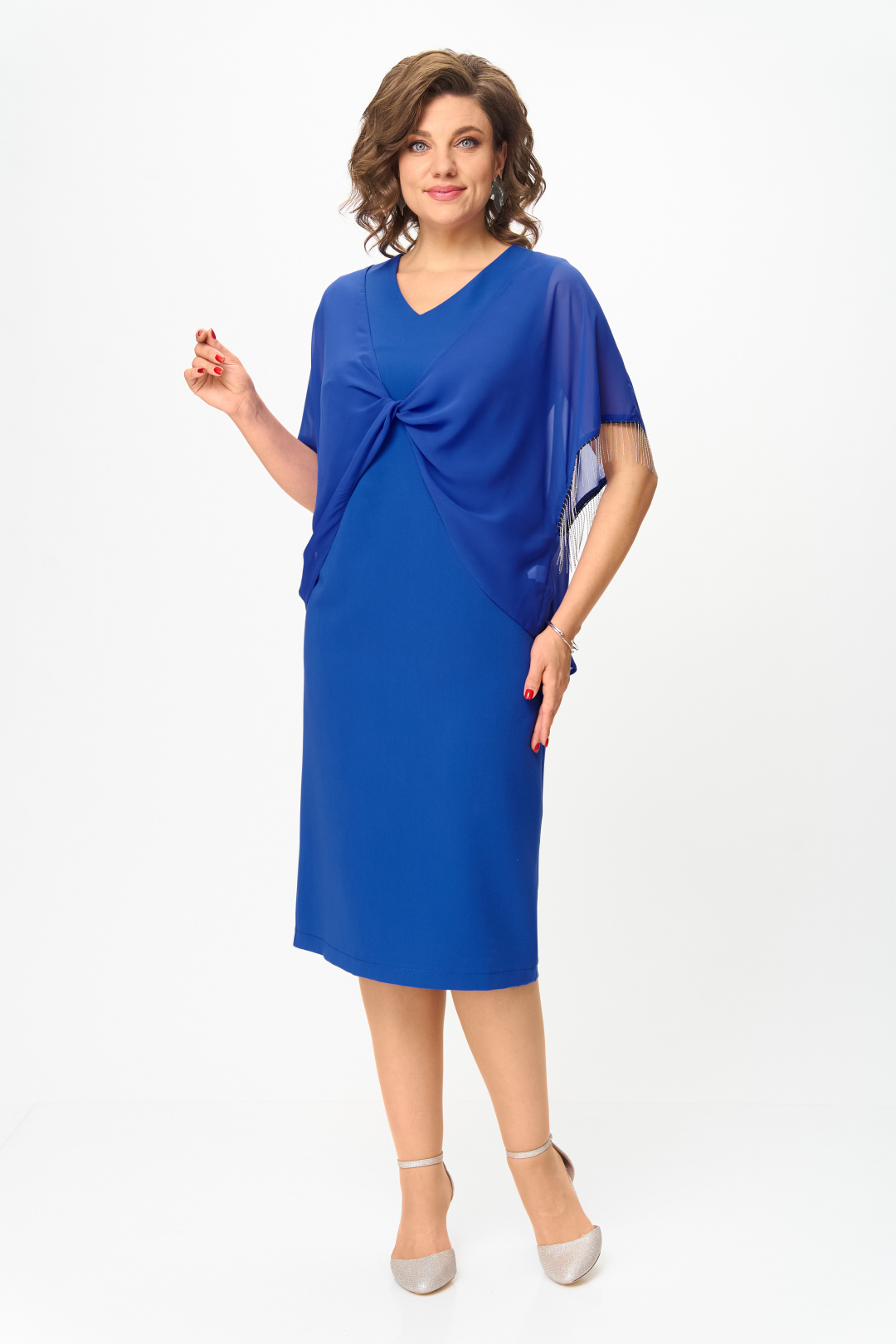 Платье полуприлегающего силуэта, двухслойное выполнено из однотонной ткани, в качестве отделки использован шифон. Платье длиной за колено. Полочка платья с нагрудными вытачками. Горловина полочки V-образной формы. Спинка платья со средним швом, в верхней части которого обработана потайная молния, в нижней части разрез. Платье без рукавов.