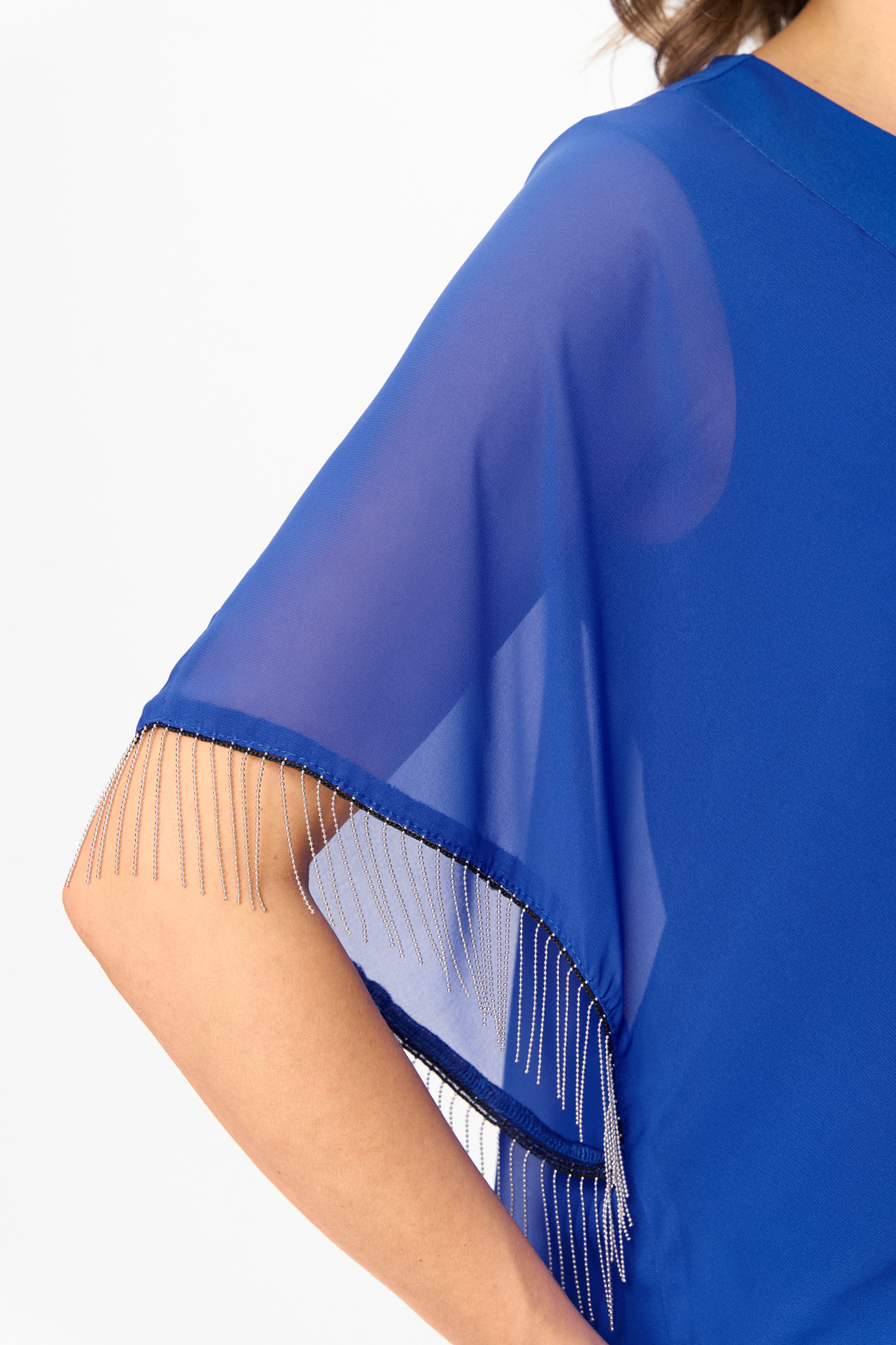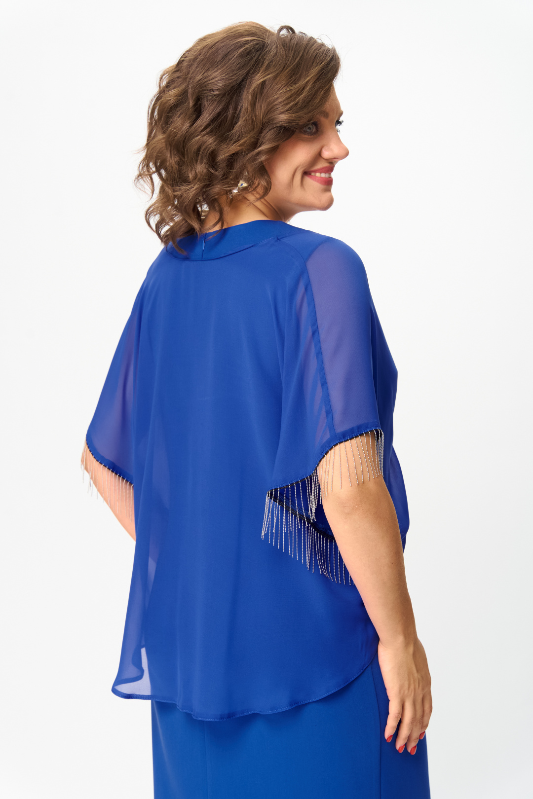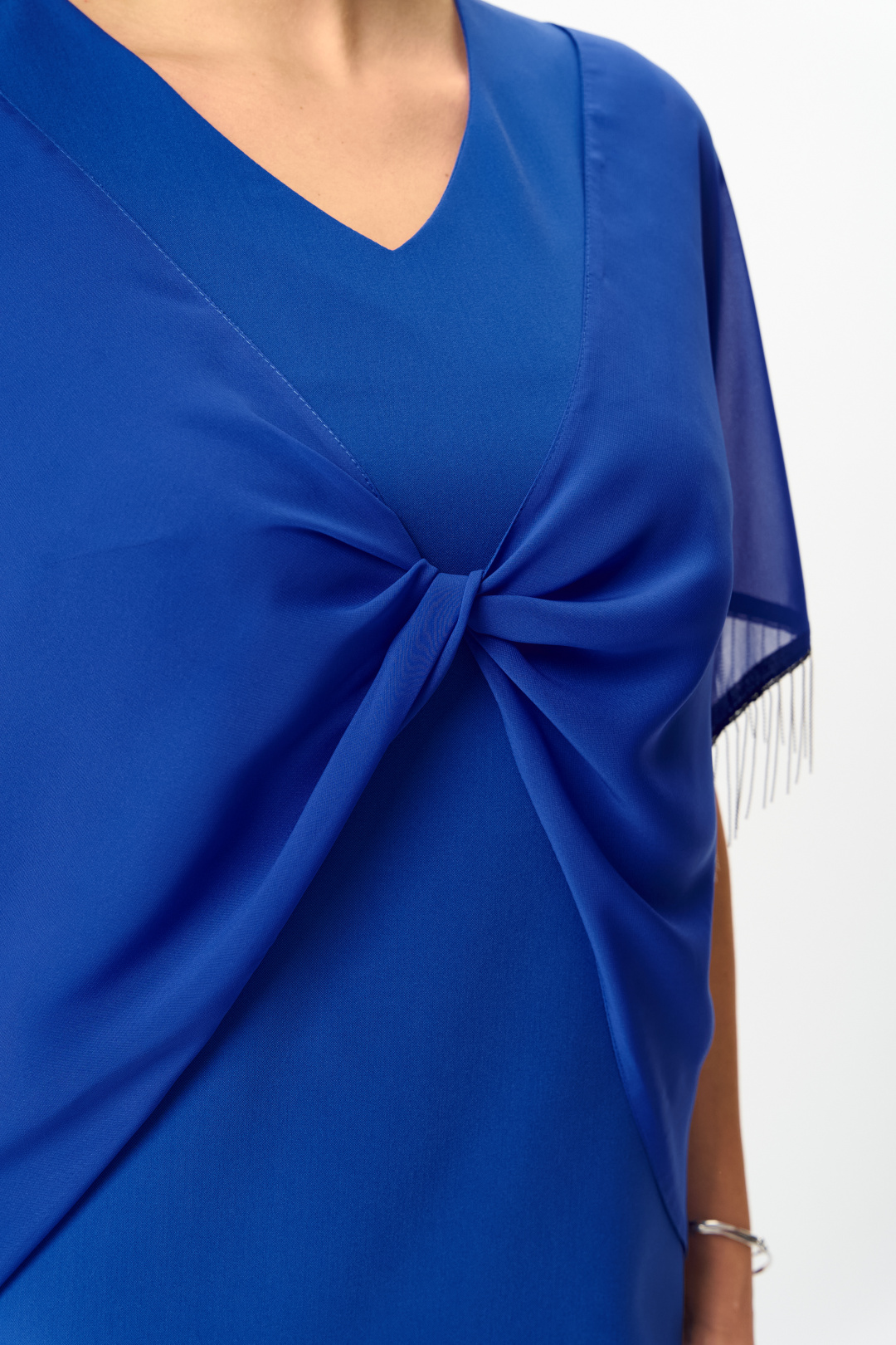 Верхняя часть платья сьемная, выполнена из шифона. Полочка с конструктивным элементом в виде узла и V-образной горловиной. Спинка цельная. Линия плеча удлененная, образующая цельнокроеный рукав, длиной до локтя. Пройма обработана декоративной тесьмой.