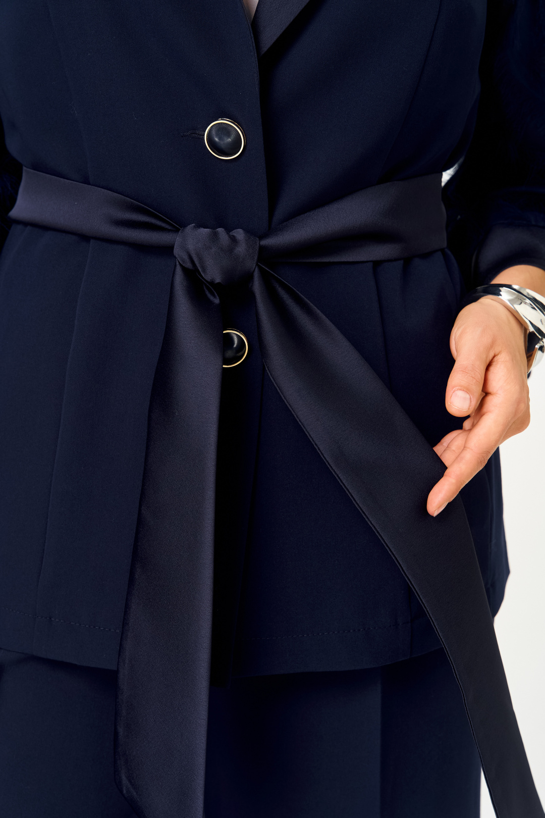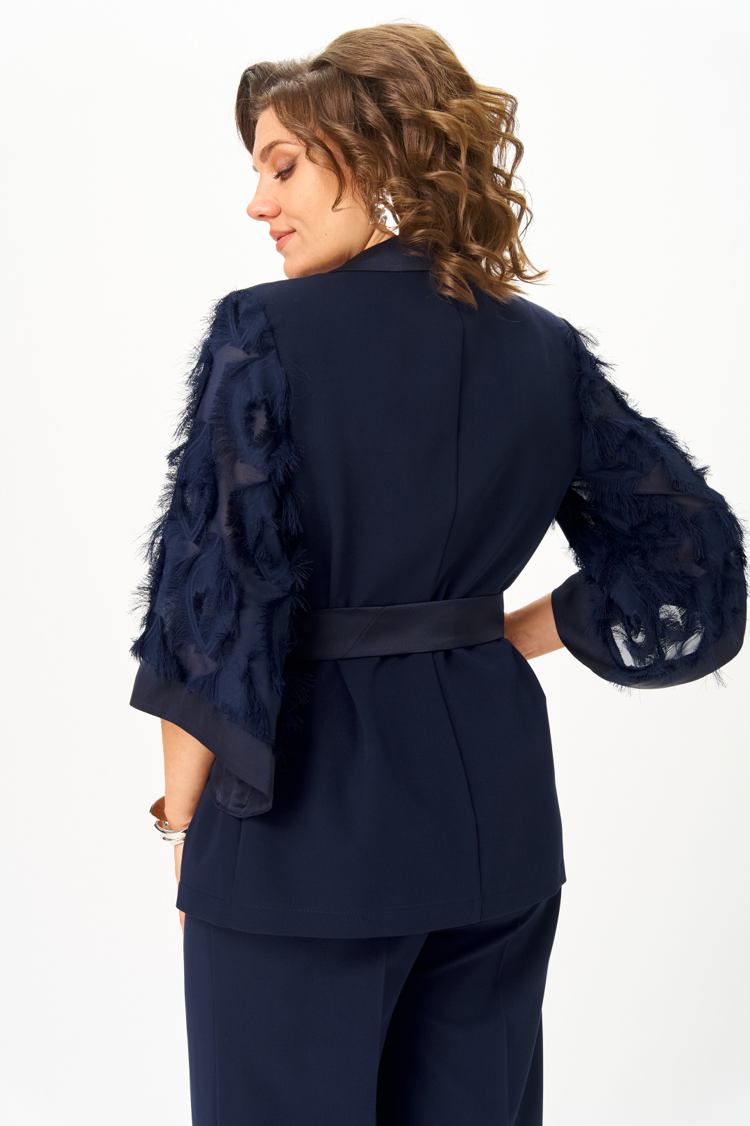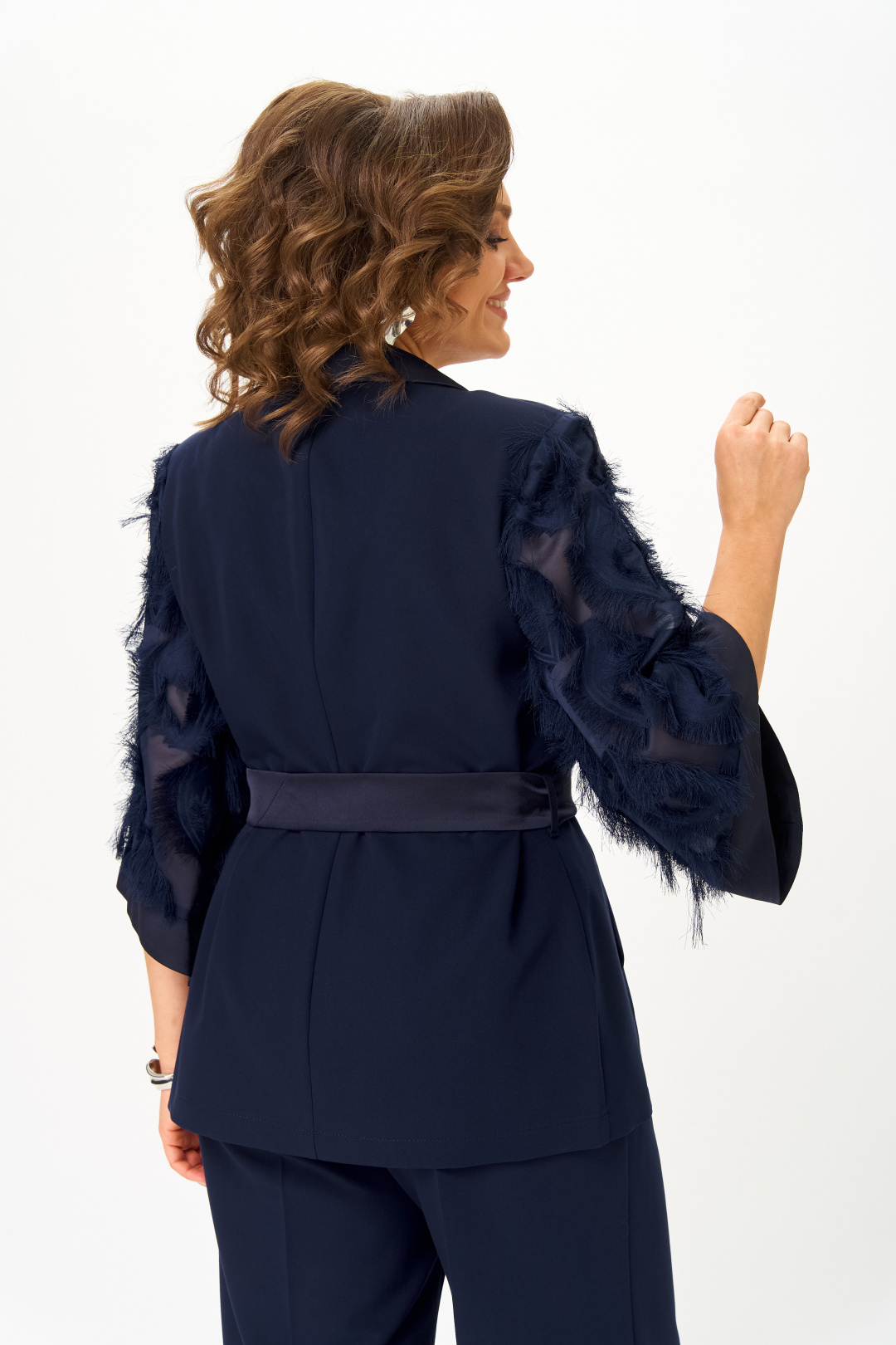Полочка жакета с застежкой на две петли и пуговицы, с вертикальными рельефами и прорезными карманами. Горловина V-образной формы с отложными лацканами и воротником пиджачного типа. Спинка со средним швом. В области талии по боковым швам настрочены шлевки через которые продет пояс, завязывающийся спереди. Рукав одношовный, длиной 3/4, расширенный книзу. Низ рукава обработан притачной планкой.