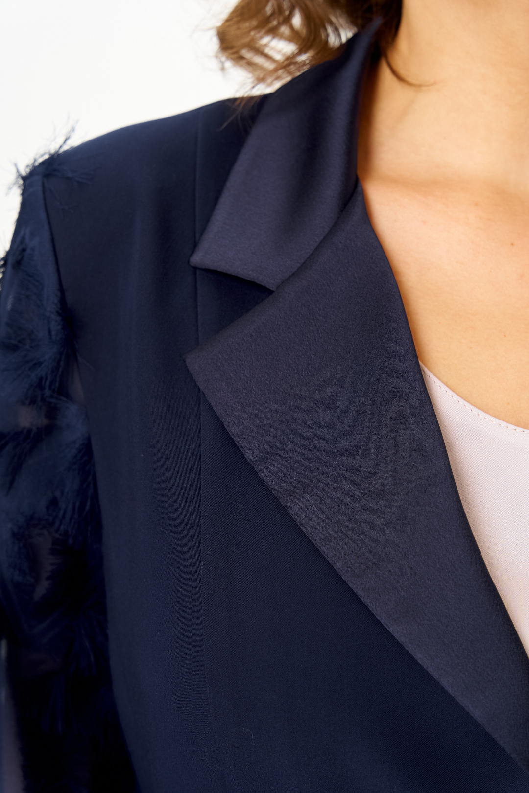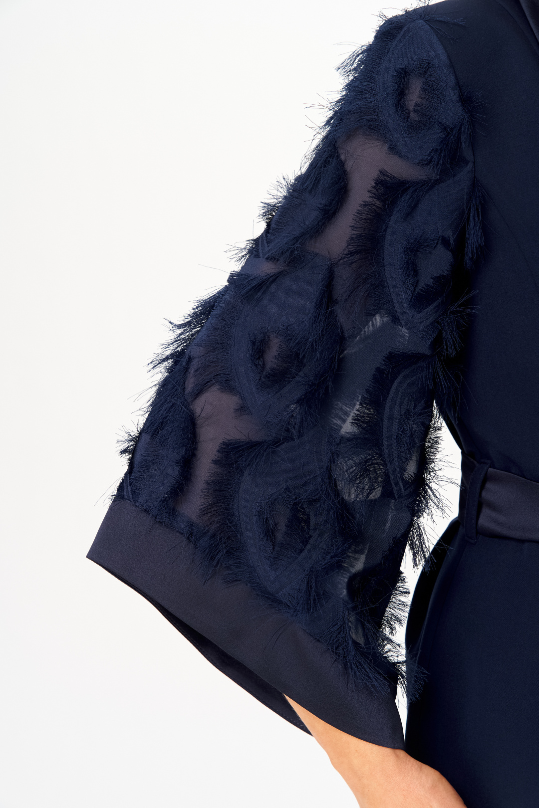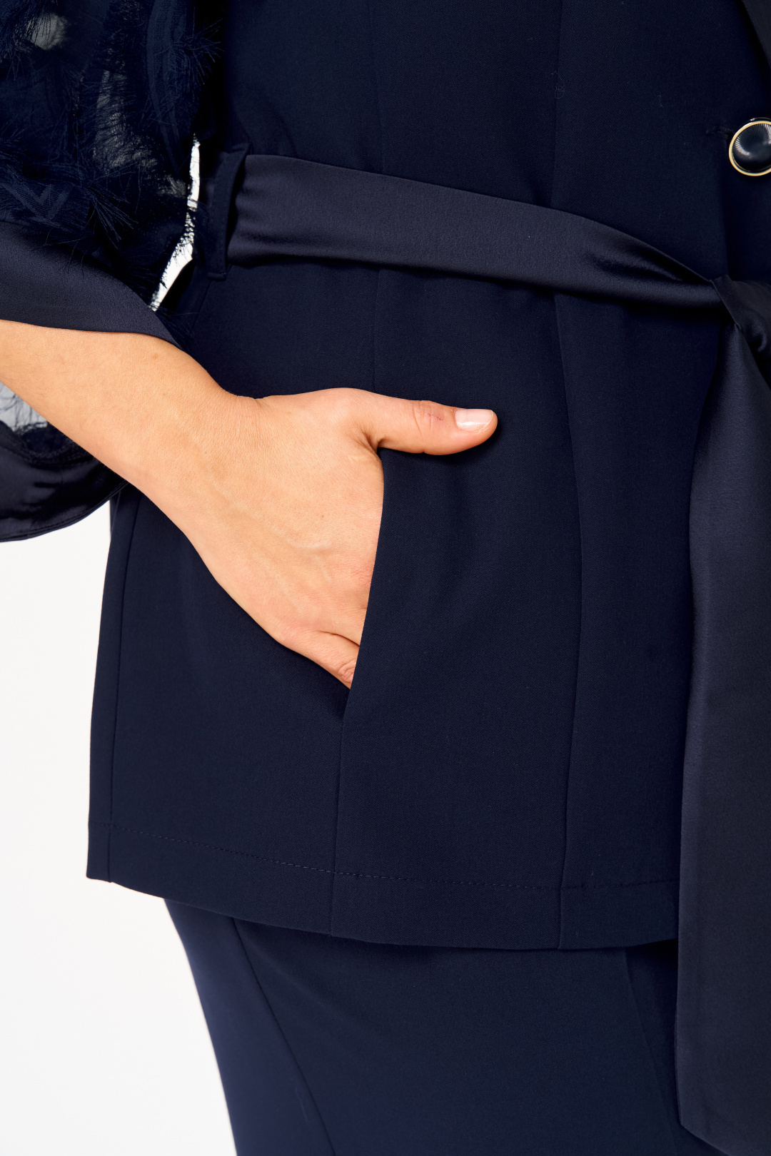 Полочка жакета с застежкой на две петли и пуговицы, с вертикальными рельефами и прорезными карманами. Горловина V-образной формы с отложными лацканами и воротником пиджачного типа. Спинка со средним швом. В области талии по боковым швам настрочены шлевки через которые продет пояс, завязывающийся спереди. Рукав одношовный, длиной 3/4, расширенный книзу. Низ рукава обработан притачной планкой.