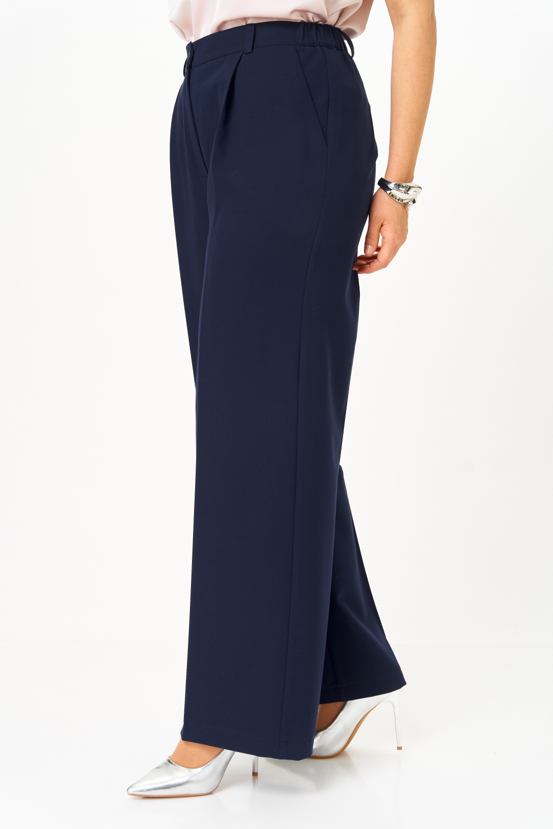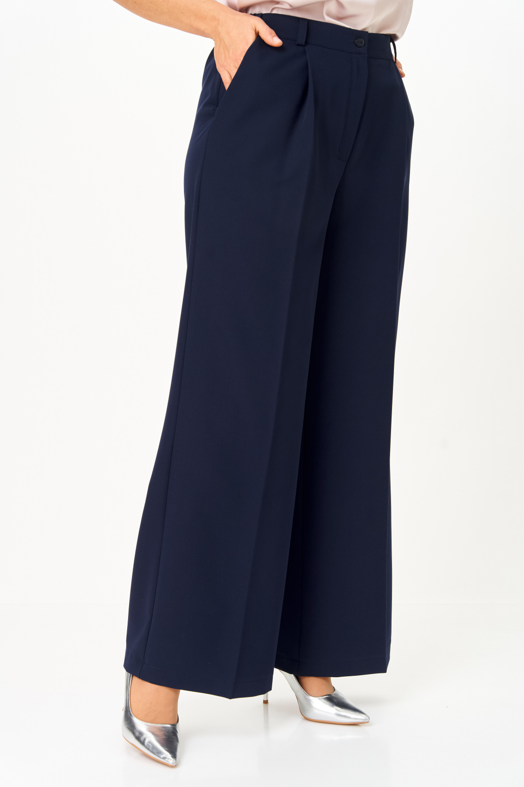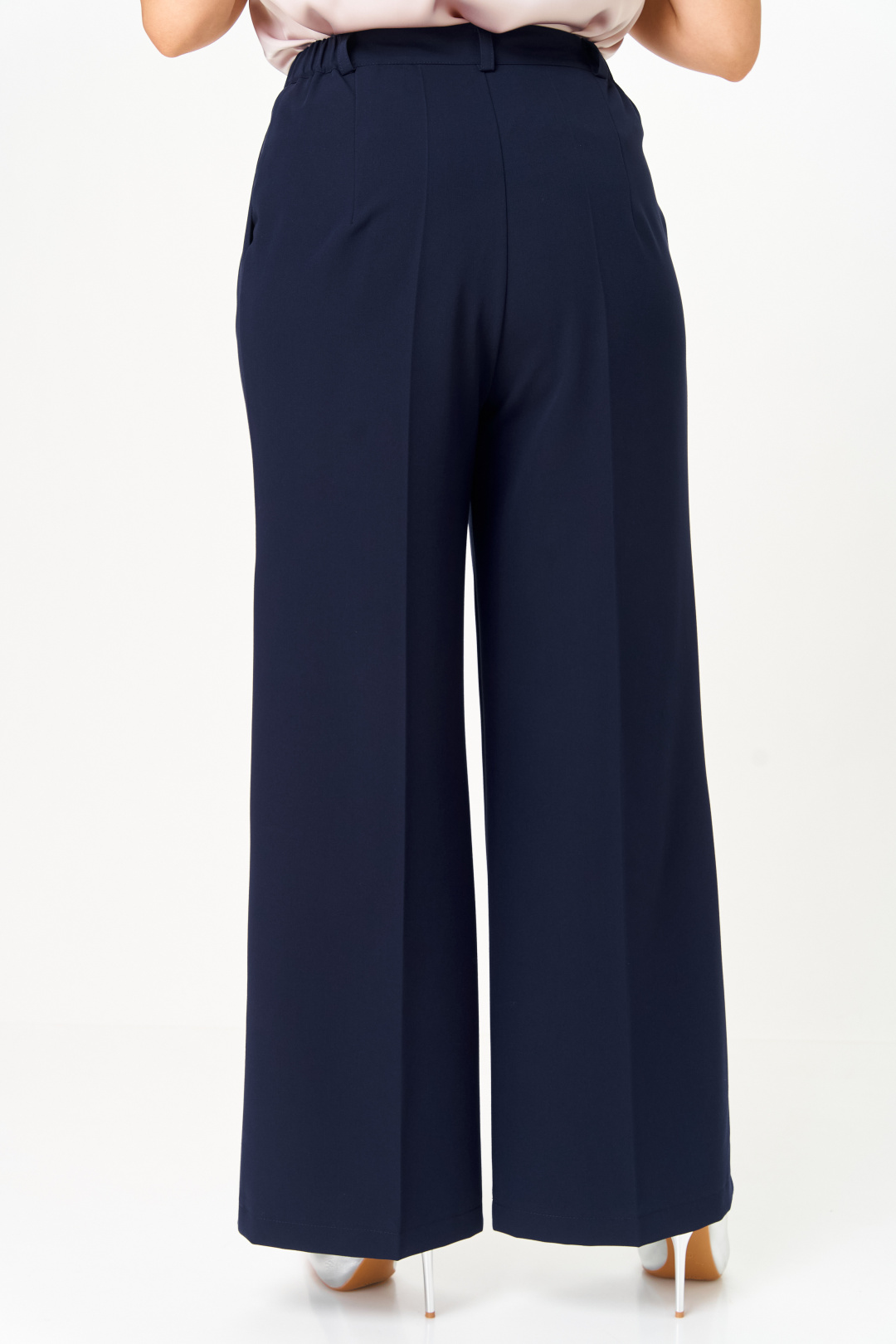 Брюки классические, со стрелками, полной длины, выполнены из однотонной ткани. В области бедер полуприлегающие, в колене и по низу прямые. По передним половинкам обработаны складки по линии талии и наклонные карманы, в среднем шве застежка на молнию. По задним половинкам обработаны талиевые вытачки. Брюки на притачном поясе с эластичной тесьмой и застежкой на петлю и пуговицу.