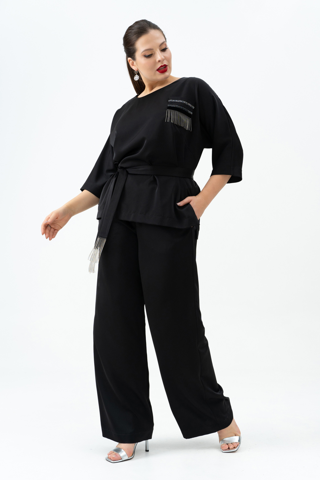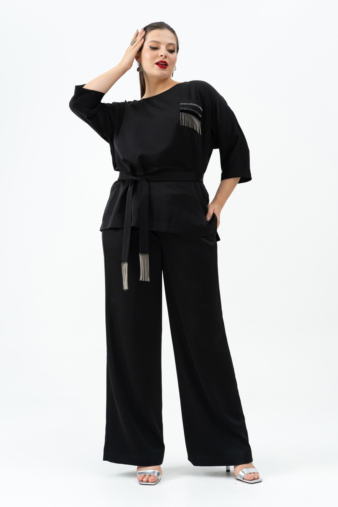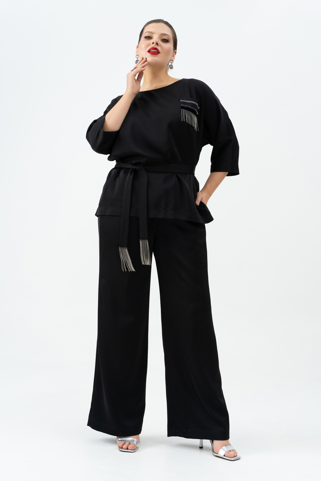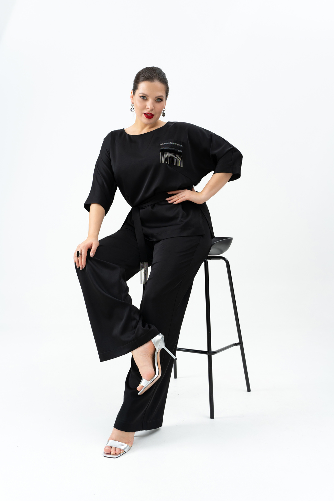 Изысканный женский брючный костюм черного цвета - идеальный выбор для любого мероприятия. Элегантная туника прямого силуэта с уникальными нагрудными вытачками и декоративным карманом, украшенным сверкающими фрагментами. Боковые разрезы добавляют комфорта и изящества силуэту. К тунике идеально дополняют ансамбль прямые брюки с комфортным поясом на резинке по спинке и притачным поясом спереди. Практичность и стиль подчеркиваются за счет карманов, вшитых в передние швы. Этот костюм не только подчеркнет ваш изысканный вкус, но и обеспечит удобство на протяжении всего дня.
