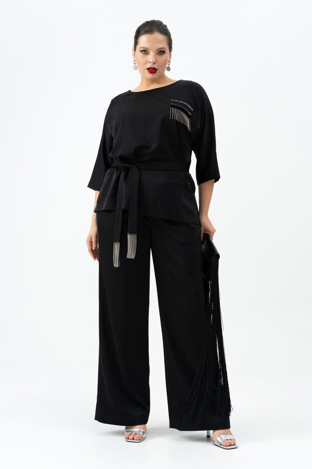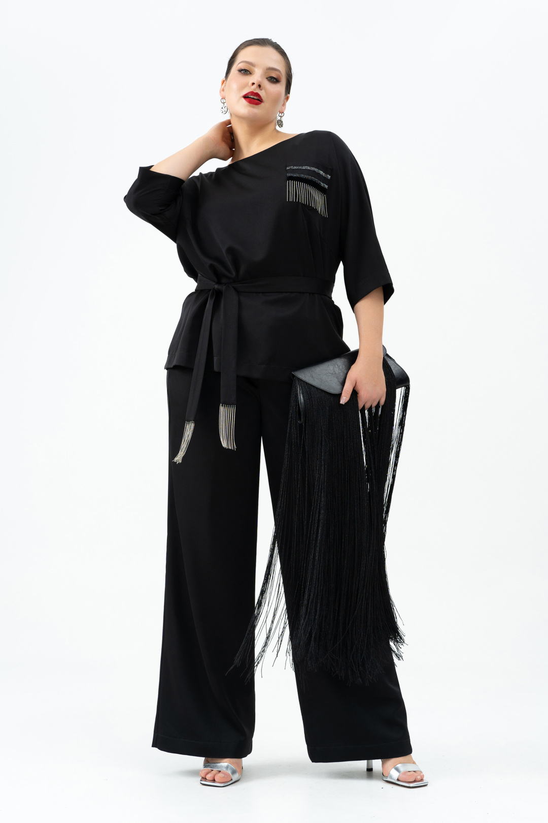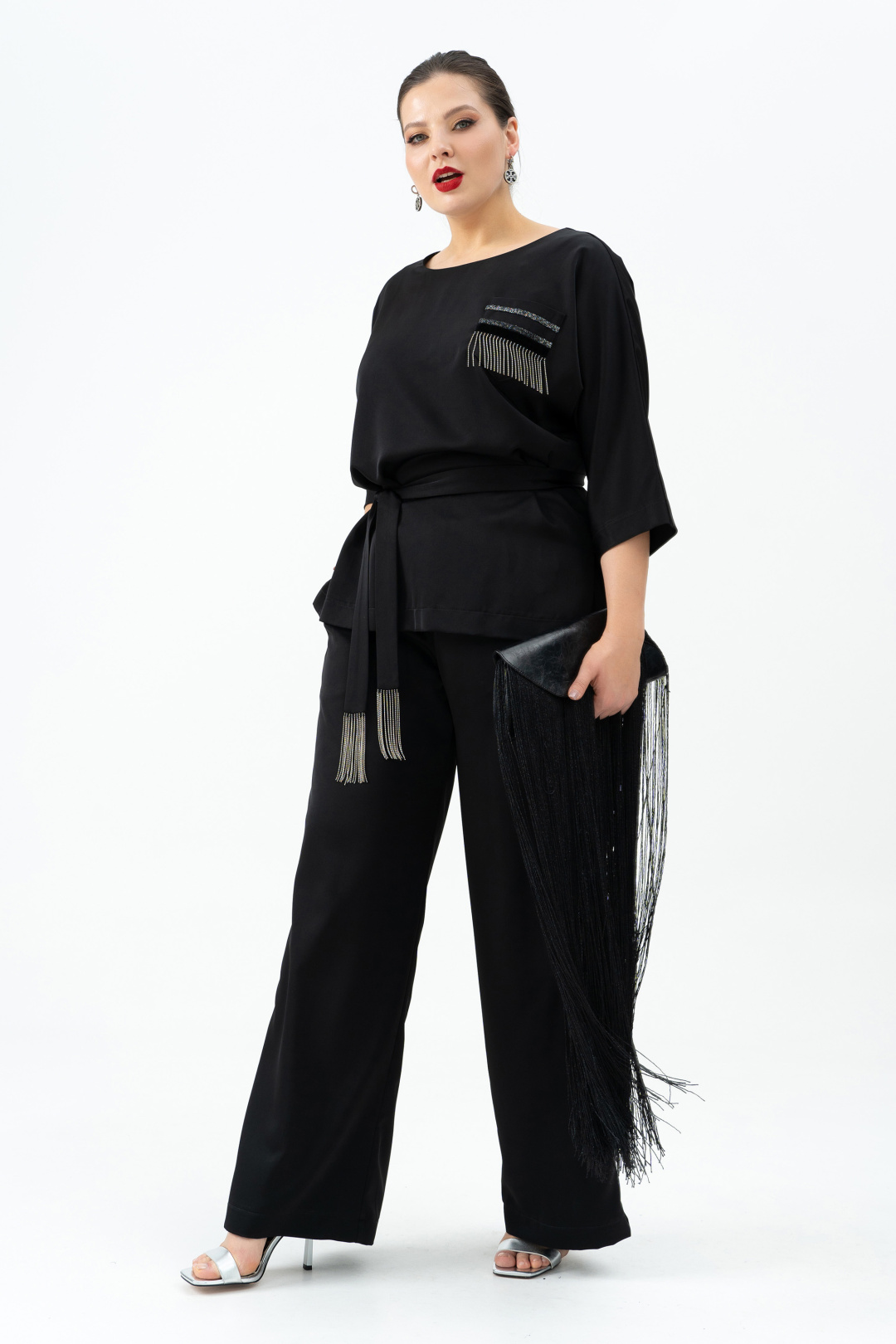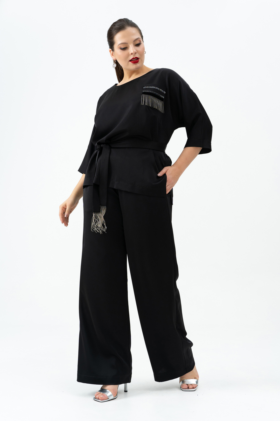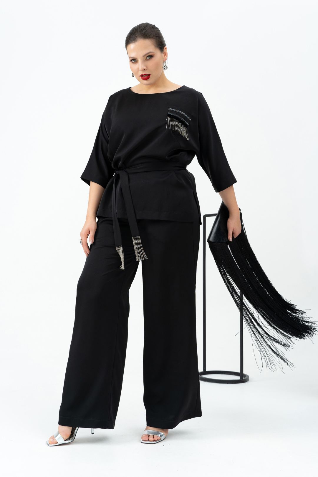Изысканный женский брючный костюм черного цвета - идеальный выбор для любого мероприятия. Элегантная туника прямого силуэта с уникальными нагрудными вытачками и декоративным карманом, украшенным сверкающими фрагментами. Боковые разрезы добавляют комфорта и изящества силуэту. К тунике идеально дополняют ансамбль прямые брюки с комфортным поясом на резинке по спинке и притачным поясом спереди. Практичность и стиль подчеркиваются за счет карманов, вшитых в передние швы. Этот костюм не только подчеркнет ваш изысканный вкус, но и обеспечит удобство на протяжении всего дня.