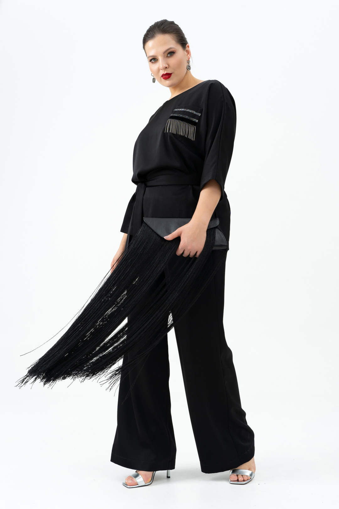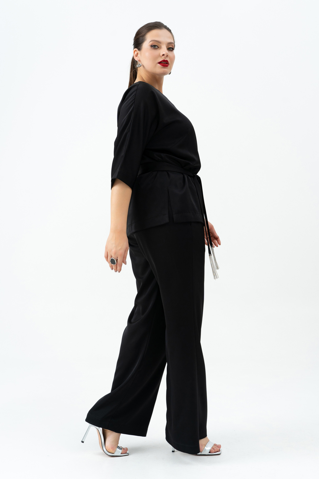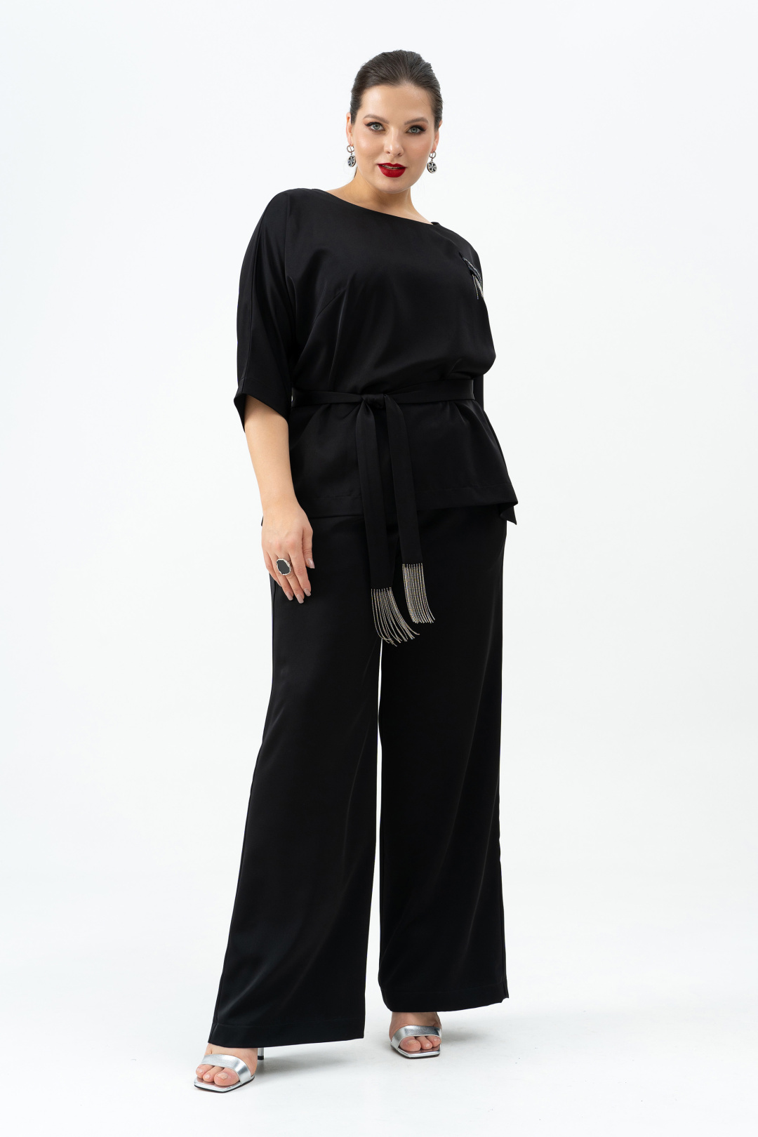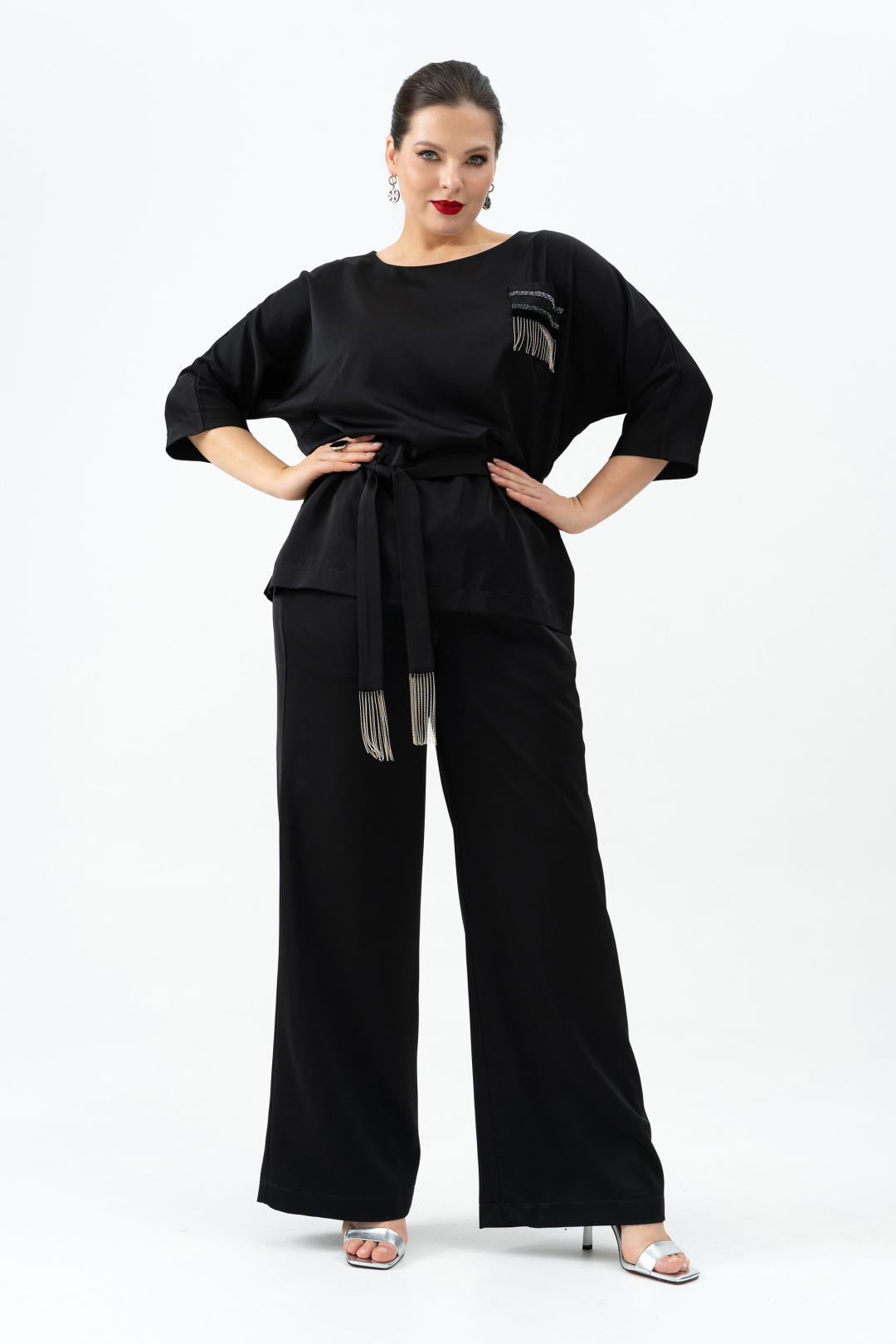 Изысканный женский брючный костюм черного цвета - идеальный выбор для любого мероприятия. Элегантная туника прямого силуэта с уникальными нагрудными вытачками и декоративным карманом, украшенным сверкающими фрагментами. Боковые разрезы добавляют комфорта и изящества силуэту. К тунике идеально дополняют ансамбль прямые брюки с комфортным поясом на резинке по спинке и притачным поясом спереди. Практичность и стиль подчеркиваются за счет карманов, вшитых в передние швы. Этот костюм не только подчеркнет ваш изысканный вкус, но и обеспечит удобство на протяжении всего дня.