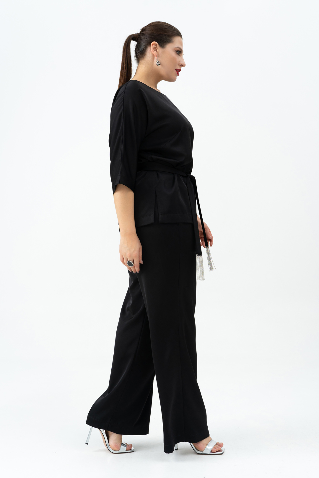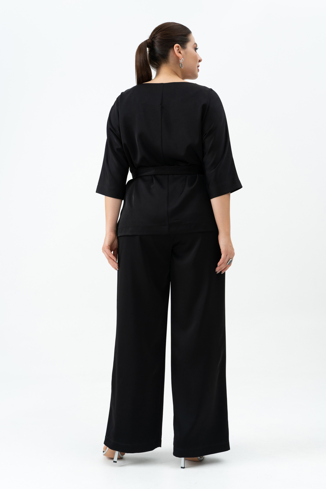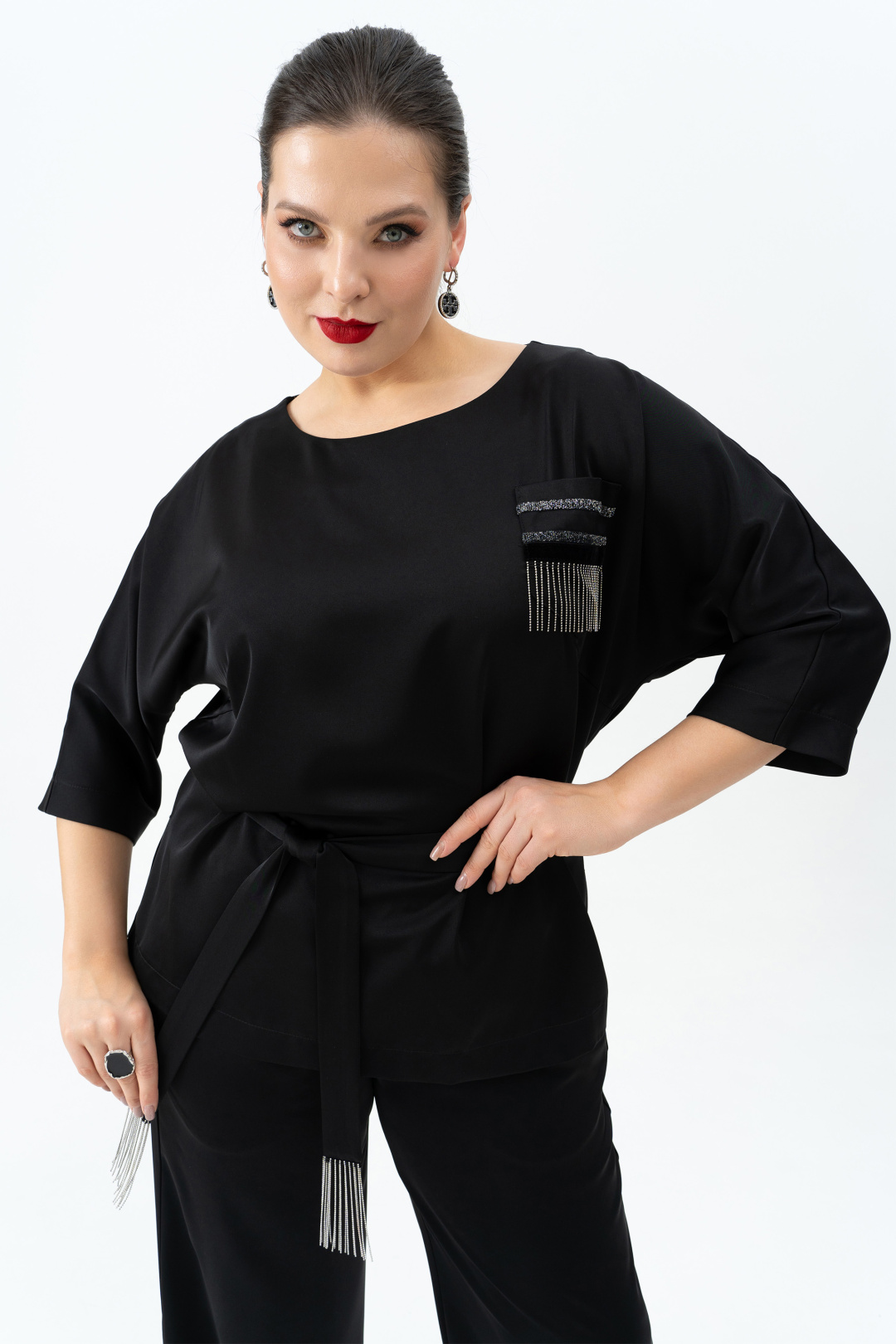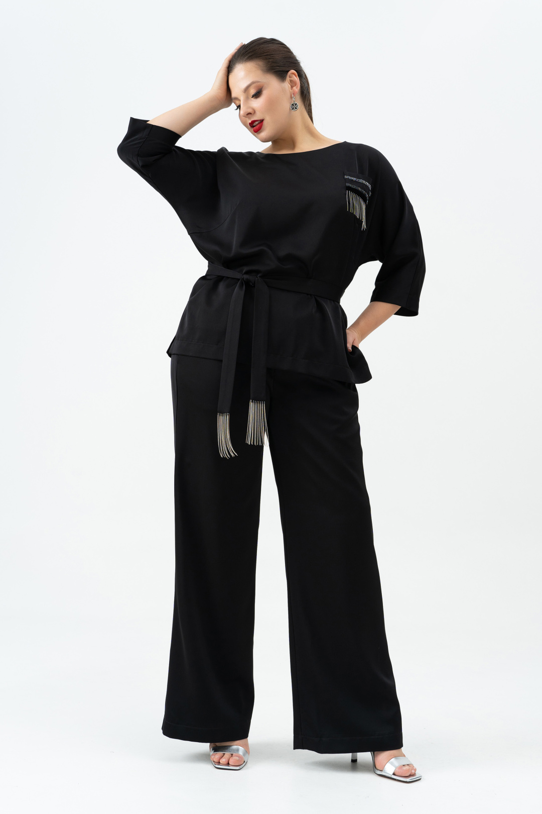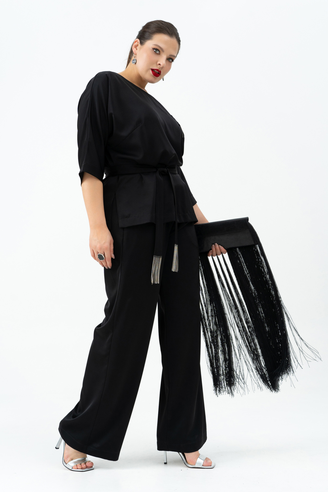 Изысканный женский брючный костюм черного цвета - идеальный выбор для любого мероприятия. Элегантная туника прямого силуэта с уникальными нагрудными вытачками и декоративным карманом, украшенным сверкающими фрагментами. Боковые разрезы добавляют комфорта и изящества силуэту. К тунике идеально дополняют ансамбль прямые брюки с комфортным поясом на резинке по спинке и притачным поясом спереди. Практичность и стиль подчеркиваются за счет карманов, вшитых в передние швы. Этот костюм не только подчеркнет ваш изысканный вкус, но и обеспечит удобство на протяжении всего дня.