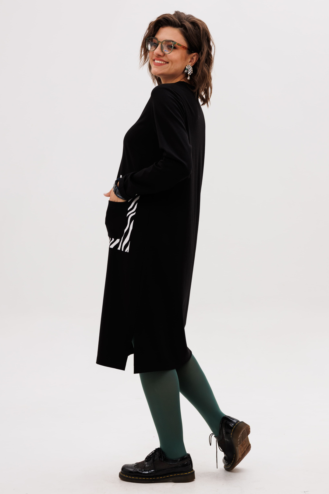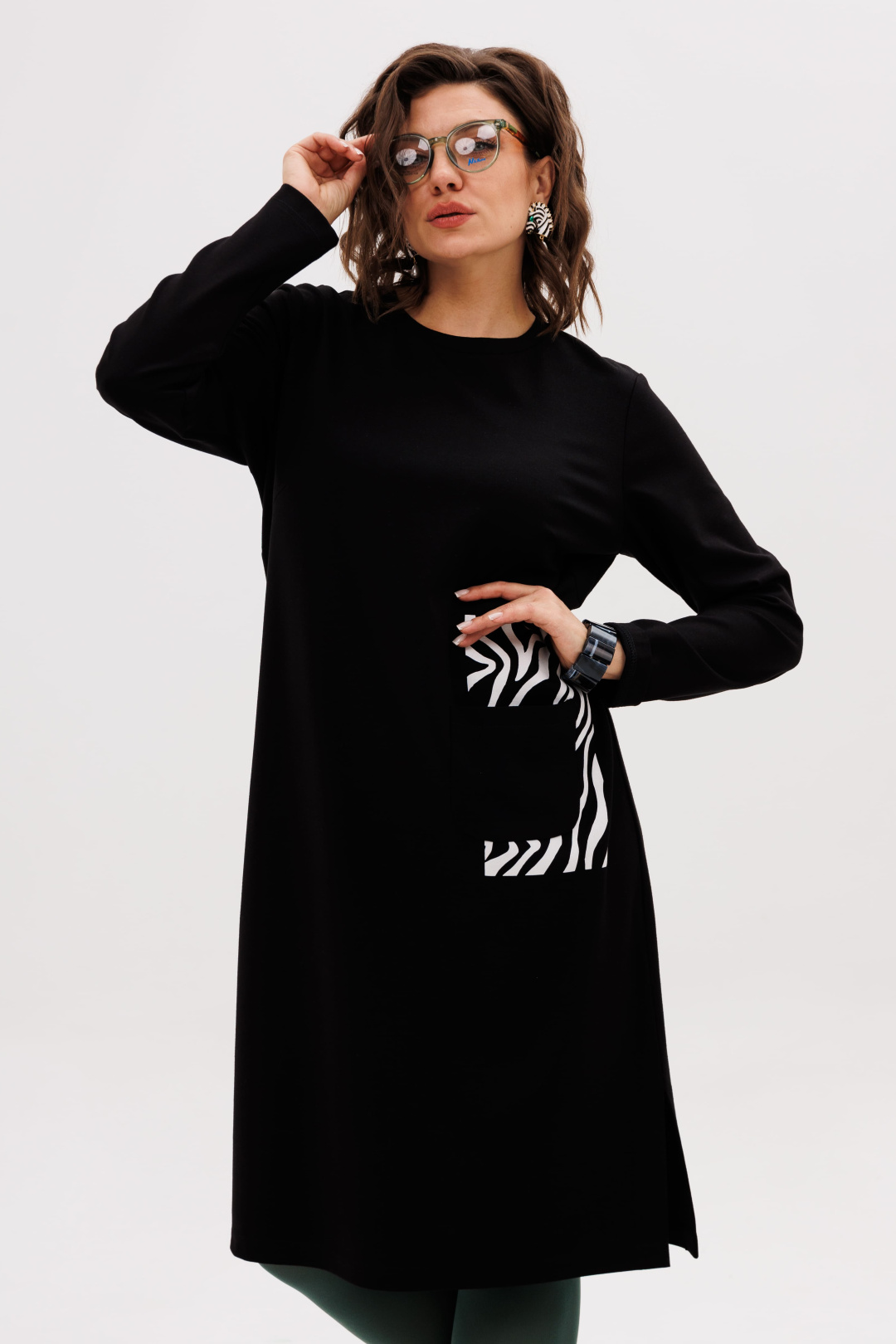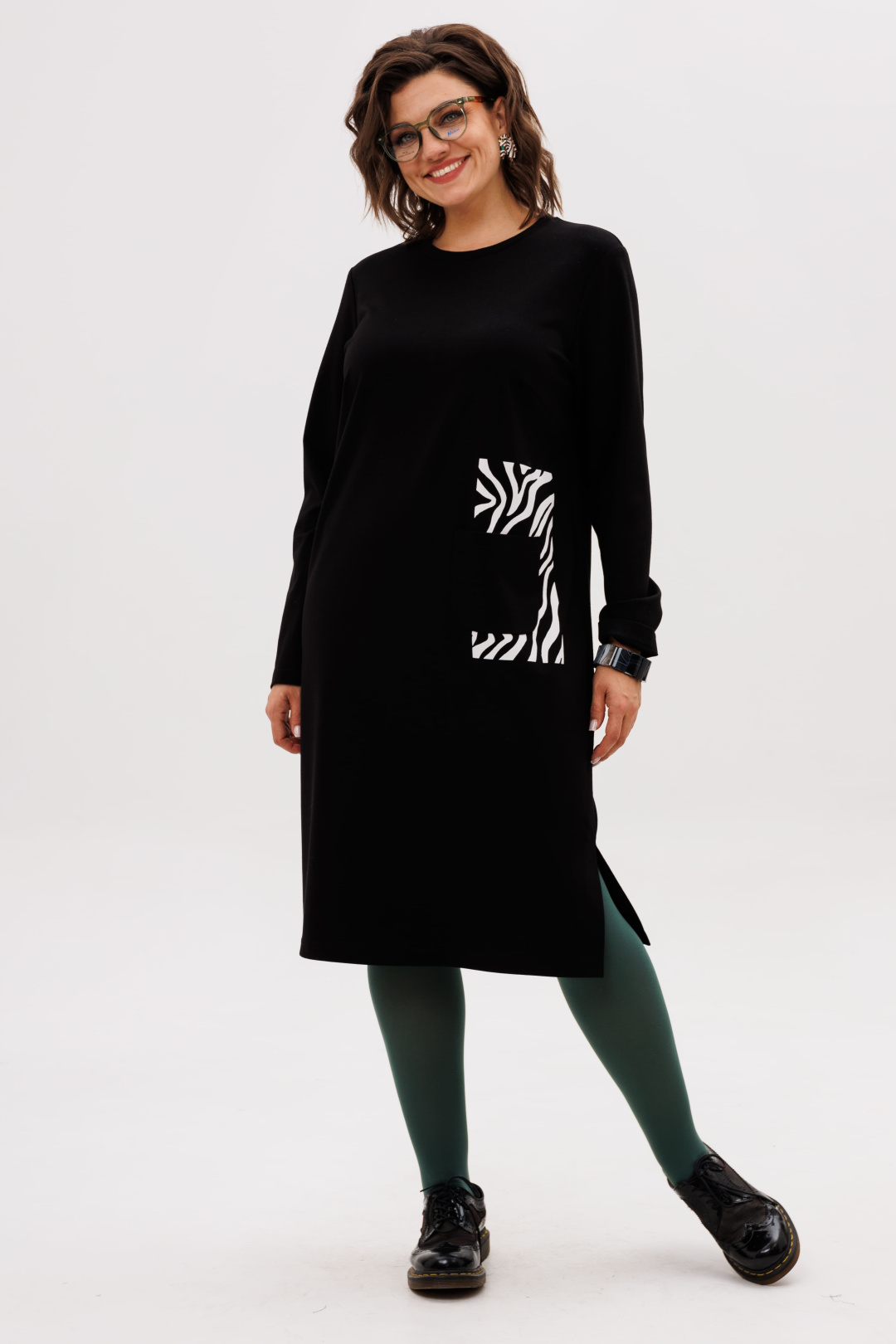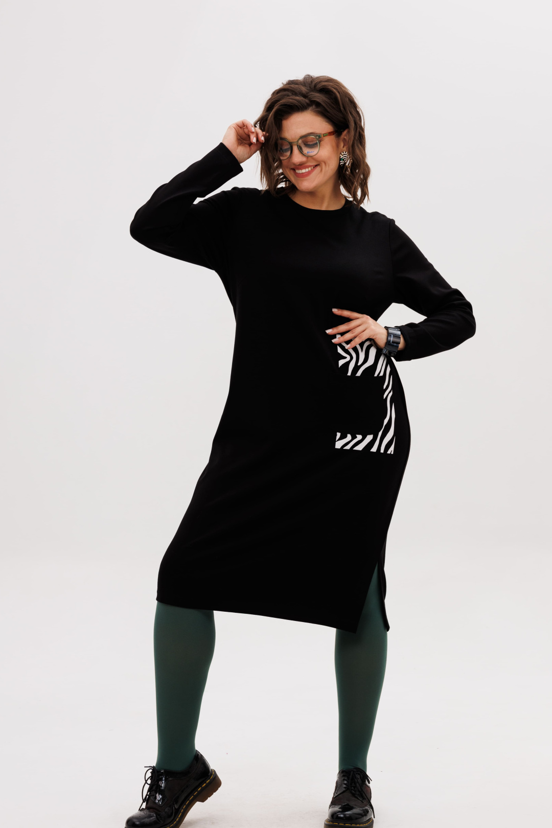 Полуприлегающий силуэт платья скрывает недостатки и дарит ощущение комфорта. Втачной длинный рукав и круглый вырез горловины делают это платье классическим, однако изюминка этого платья — принт с зеброй и разрез способны выделить вас.