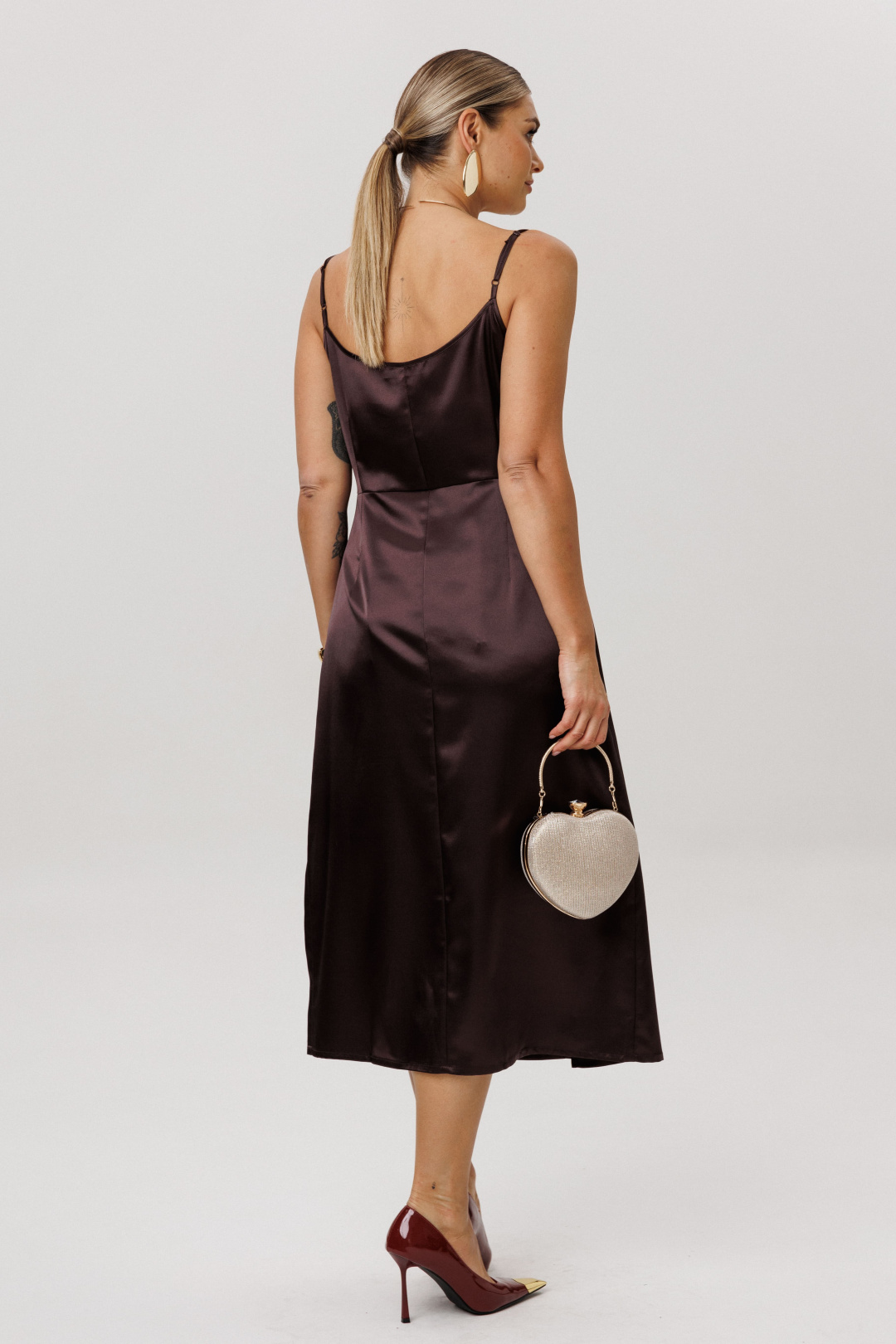 Платье актуальной во все времена длины миди с игривым разрезом изящно струится во время движения, приковывая взгляды. В правом боковом шве спрятана потайная молния. Вырез платья-качели нежно ниспадает, подчеркивая декольте и делая образ соблазнительным.