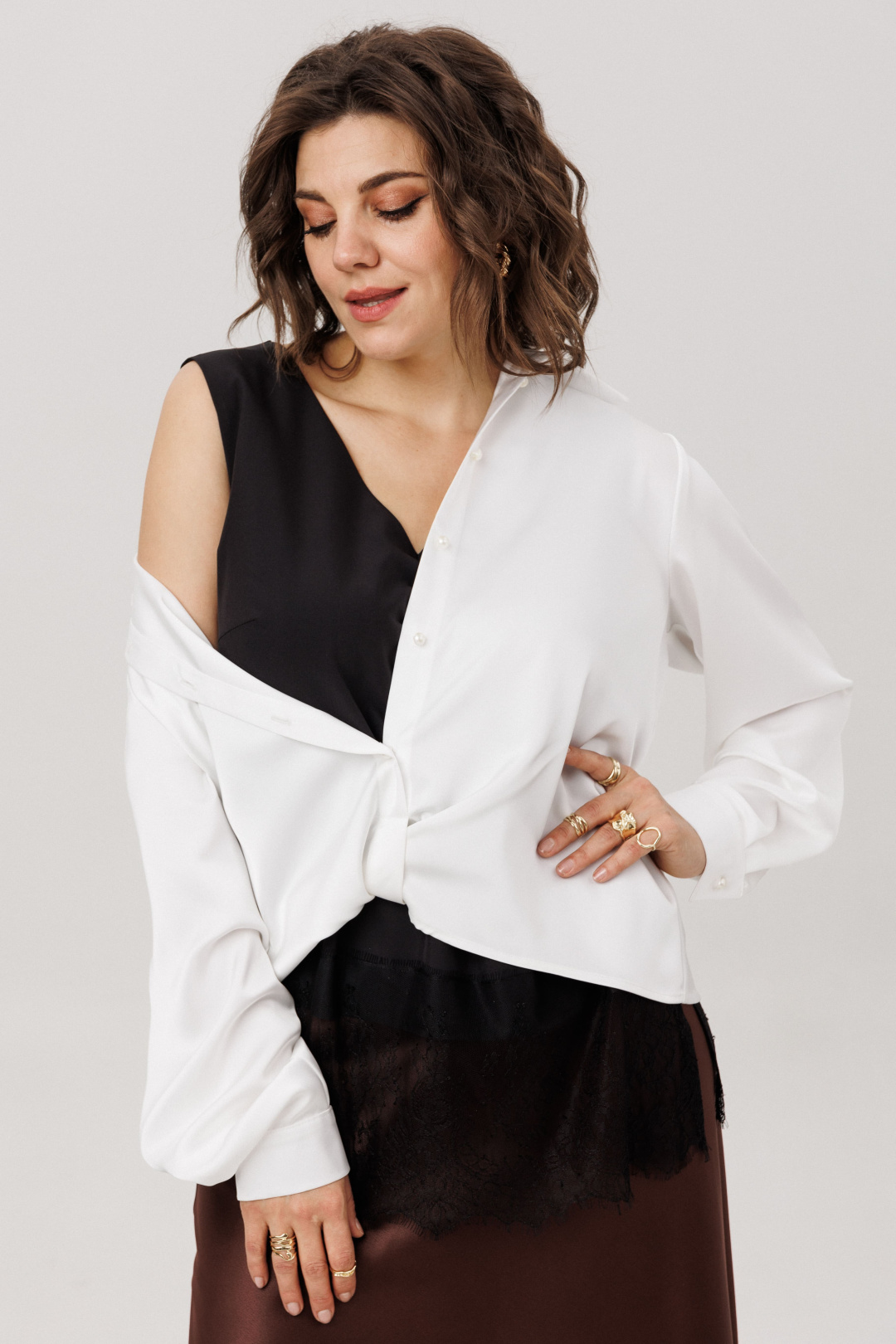 Тон задают безупречные детали: строгий отложной воротник на стойке, чёткая линия застёжки на пуговицах и идеальные втачные рукава, собранные у запястья в изящные манжеты. Их совершенство оттеняет смелая игра кроя - асимметричный низ, и та самая изысканная деталь в виде мягкого узла, которая придаёт силуэту запоминающийся художественный штрих