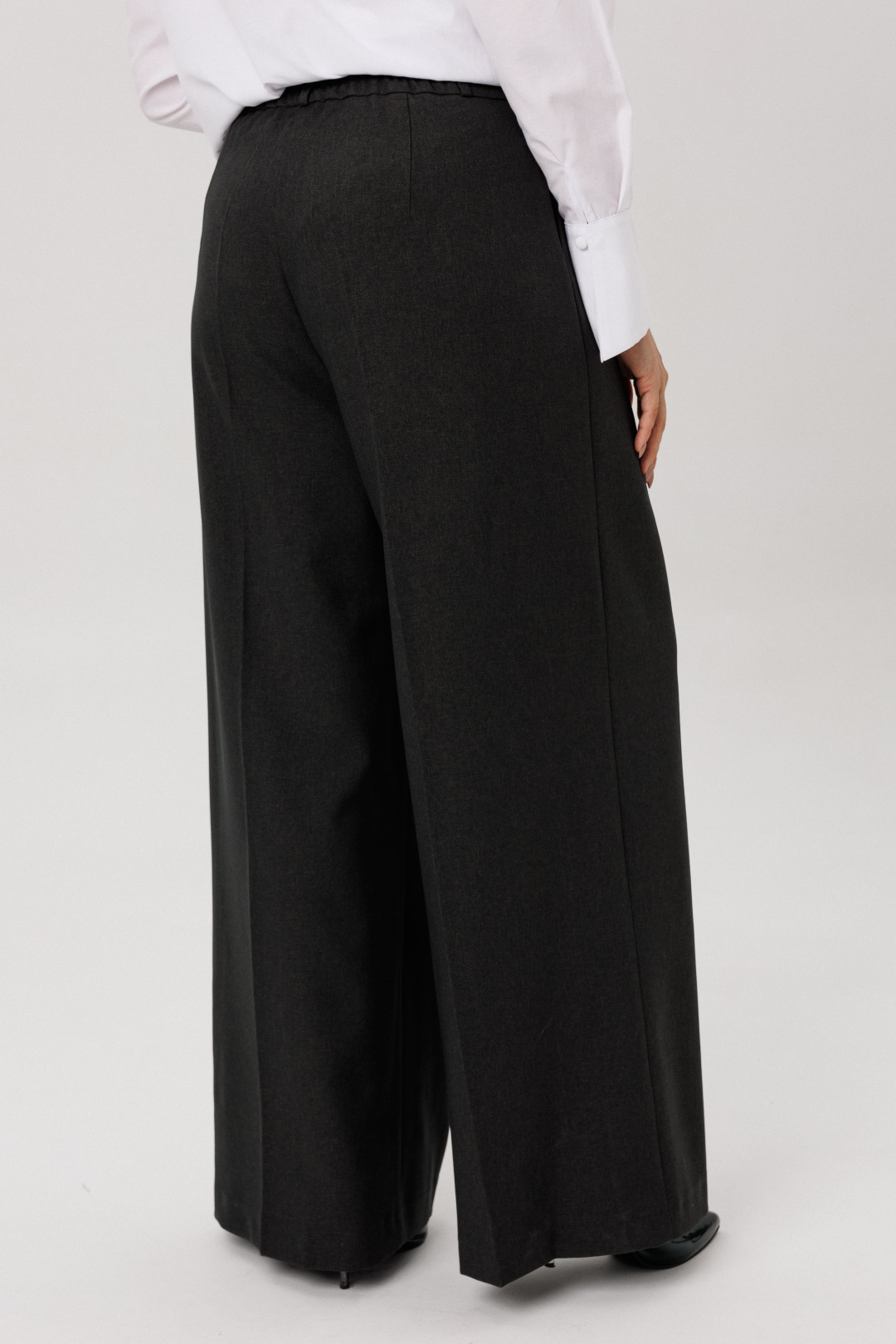 Идеальная посадка достигнута за счет эластичной резинки по спинке, которая мягко облегает фигуру, подчеркивая линию талии и обеспечивая комфорт в течение всего дня. Широкие штанины визуально удлиняют ноги, добавляя образу женственности и грации.