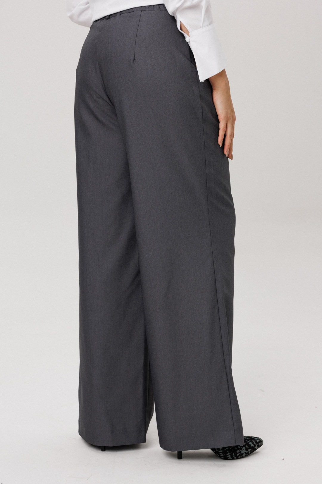 Идеальная посадка достигнута за счет эластичной резинки по спинке, которая мягко облегает фигуру, подчеркивая линию талии и обеспечивая комфорт в течение всего дня. Широкие штанины визуально удлиняют ноги, добавляя образу женственности и грации.