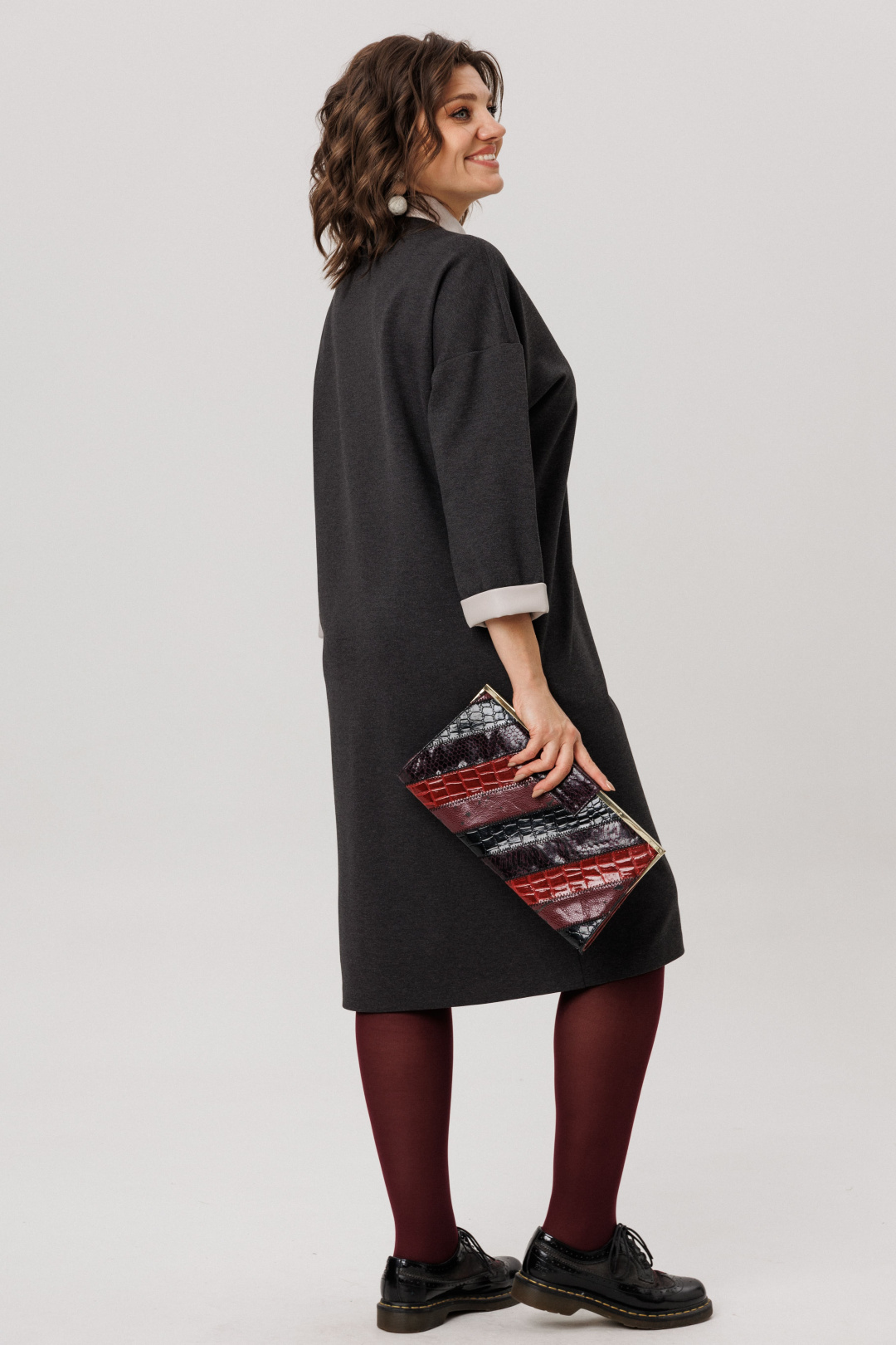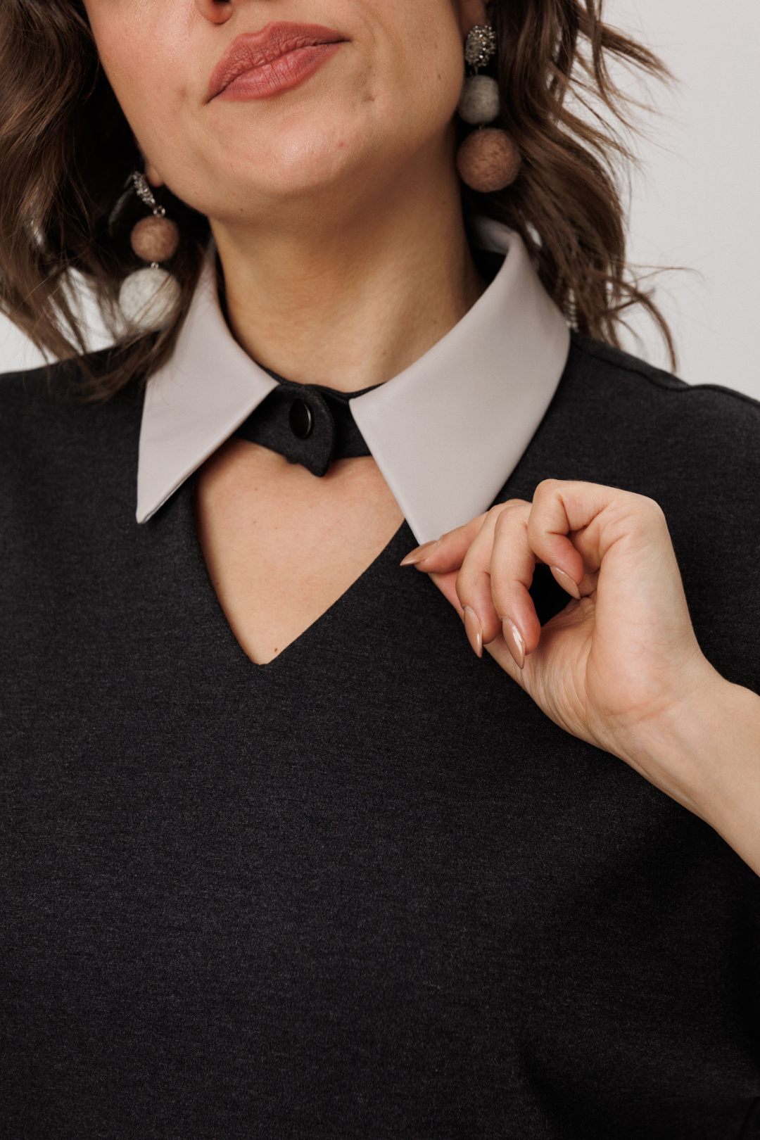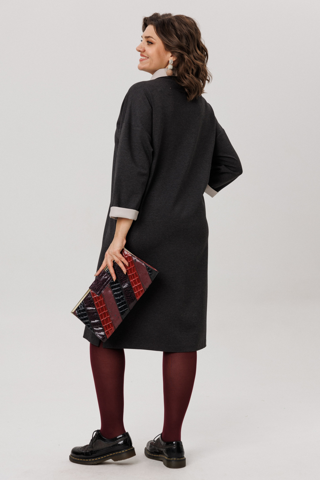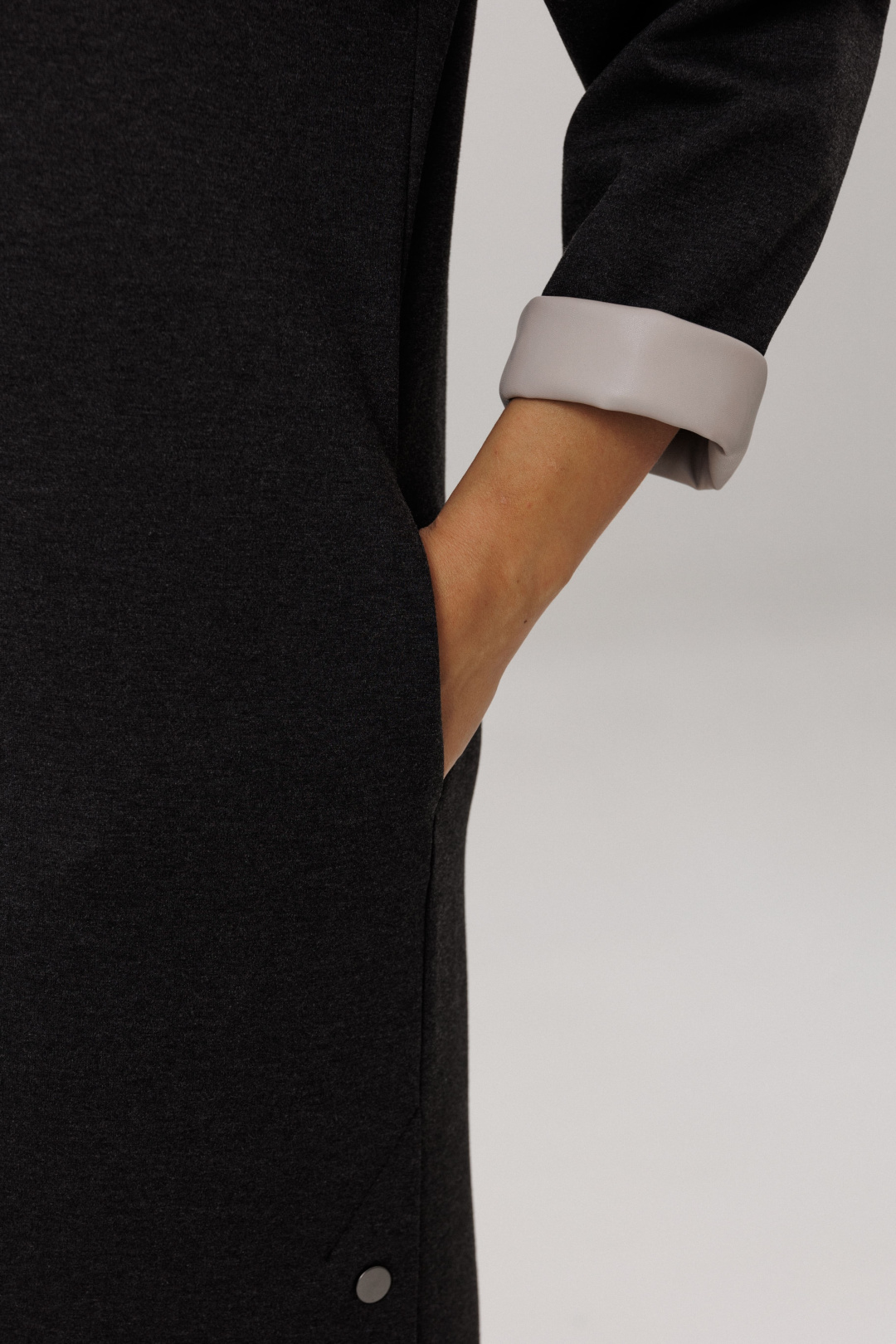 Особую харизму платью придают детали из экокожи, контрастно подчёркивающие воротник и манжеты. Эта яркая, но сдержанная изюминка сразу выделяет его среди обыденных моделей. Практичность скрыта в деталях: два кармана, неприметная застёжка и небольшая шлица, обеспечивающая лёгкость движения.