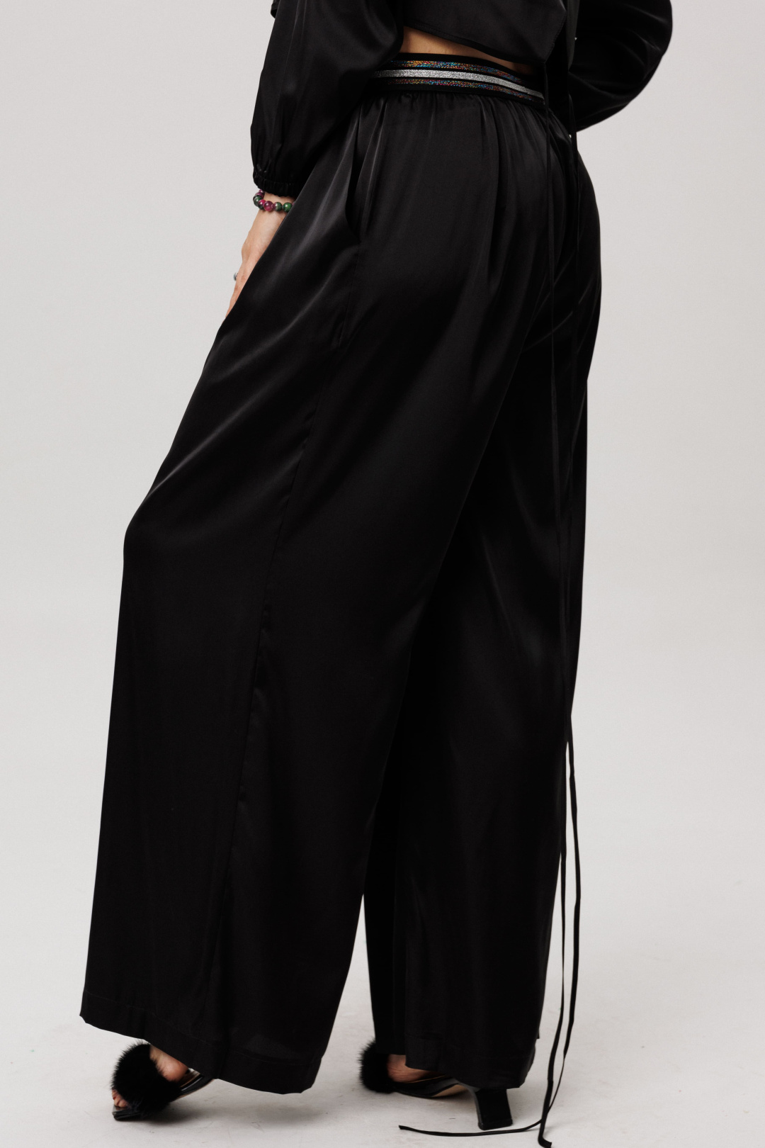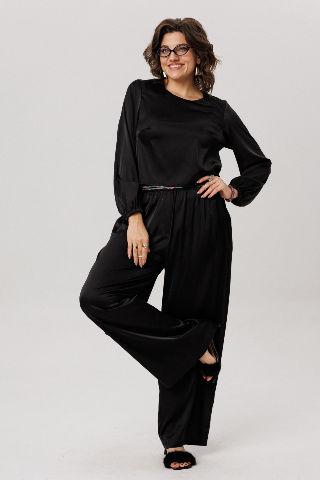 На модели в брюках в цвете «блестящий черный» блуза 1716.