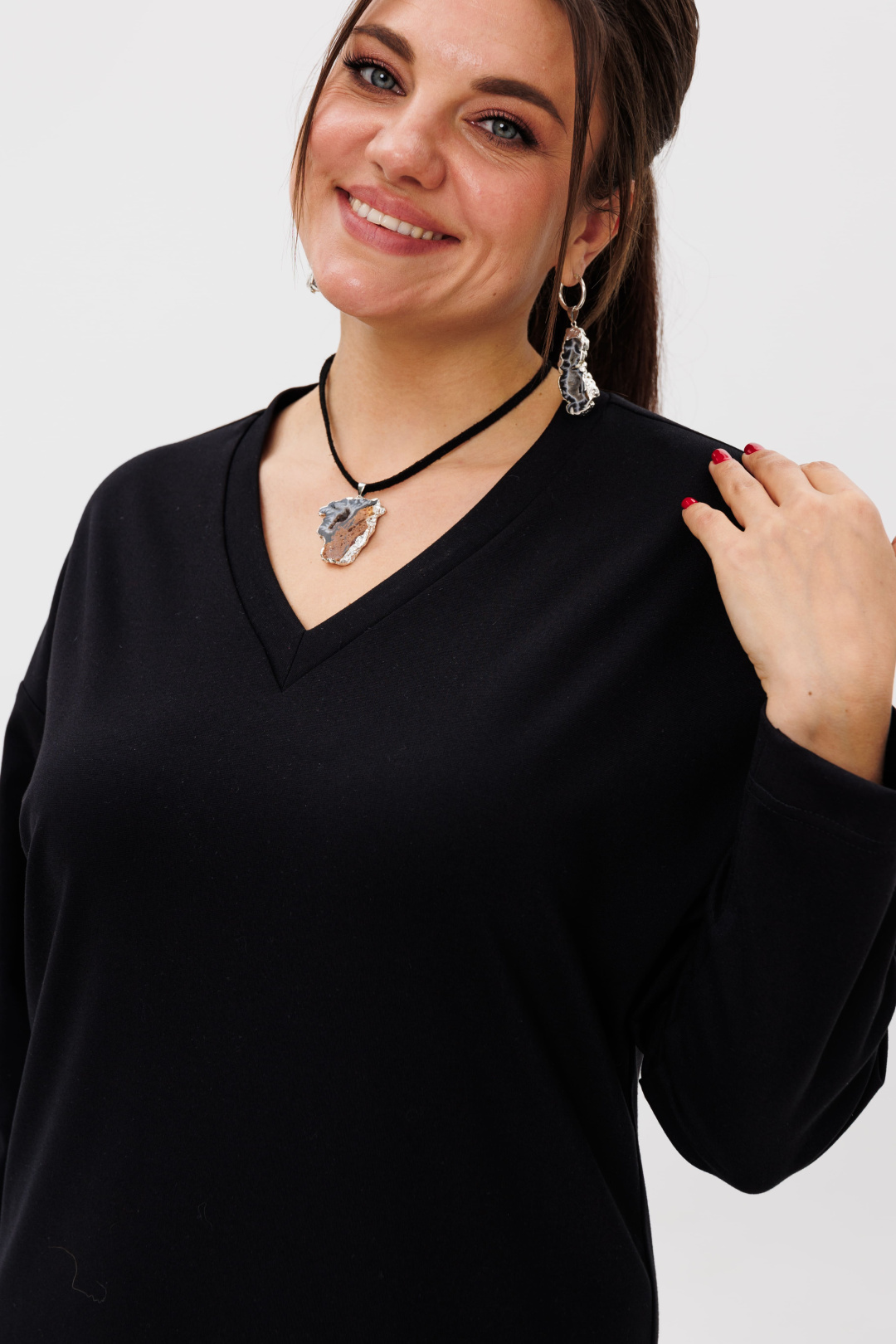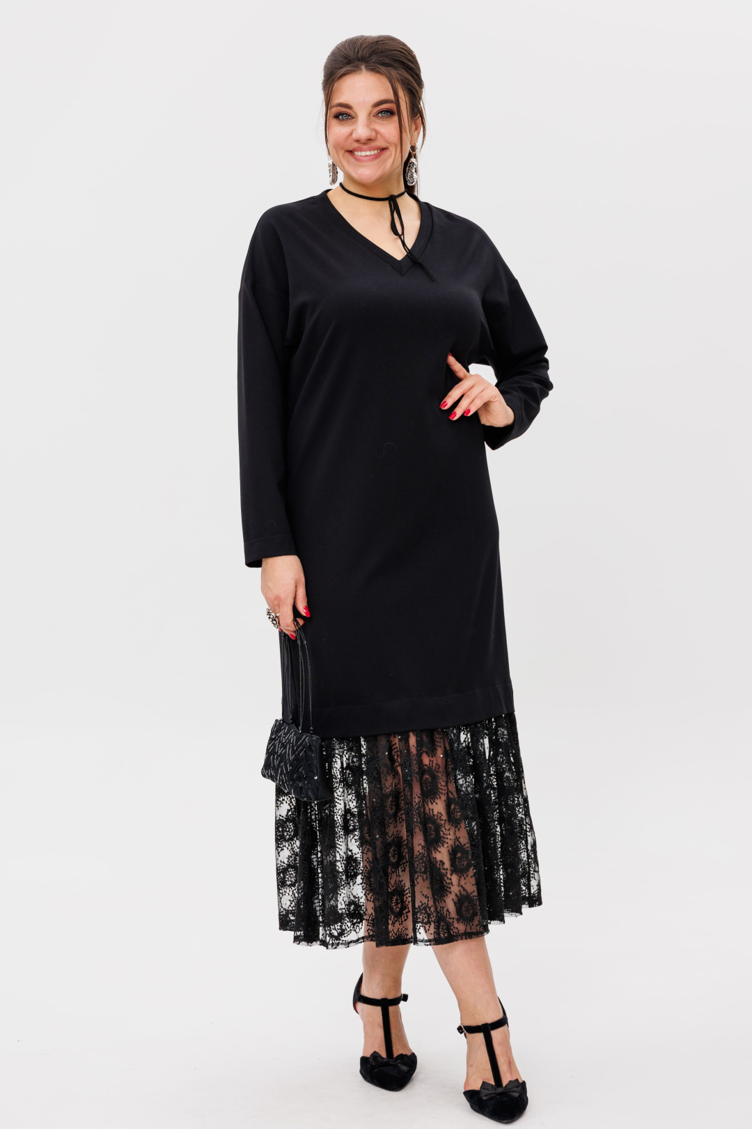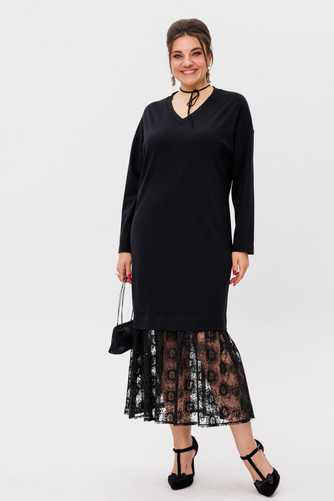 V-образный вырез подчеркивает линию шеи и декольте, добавляя образу женственности и утонченности.