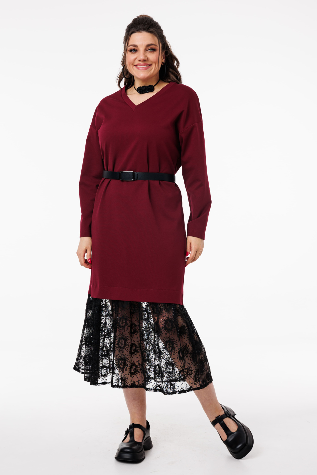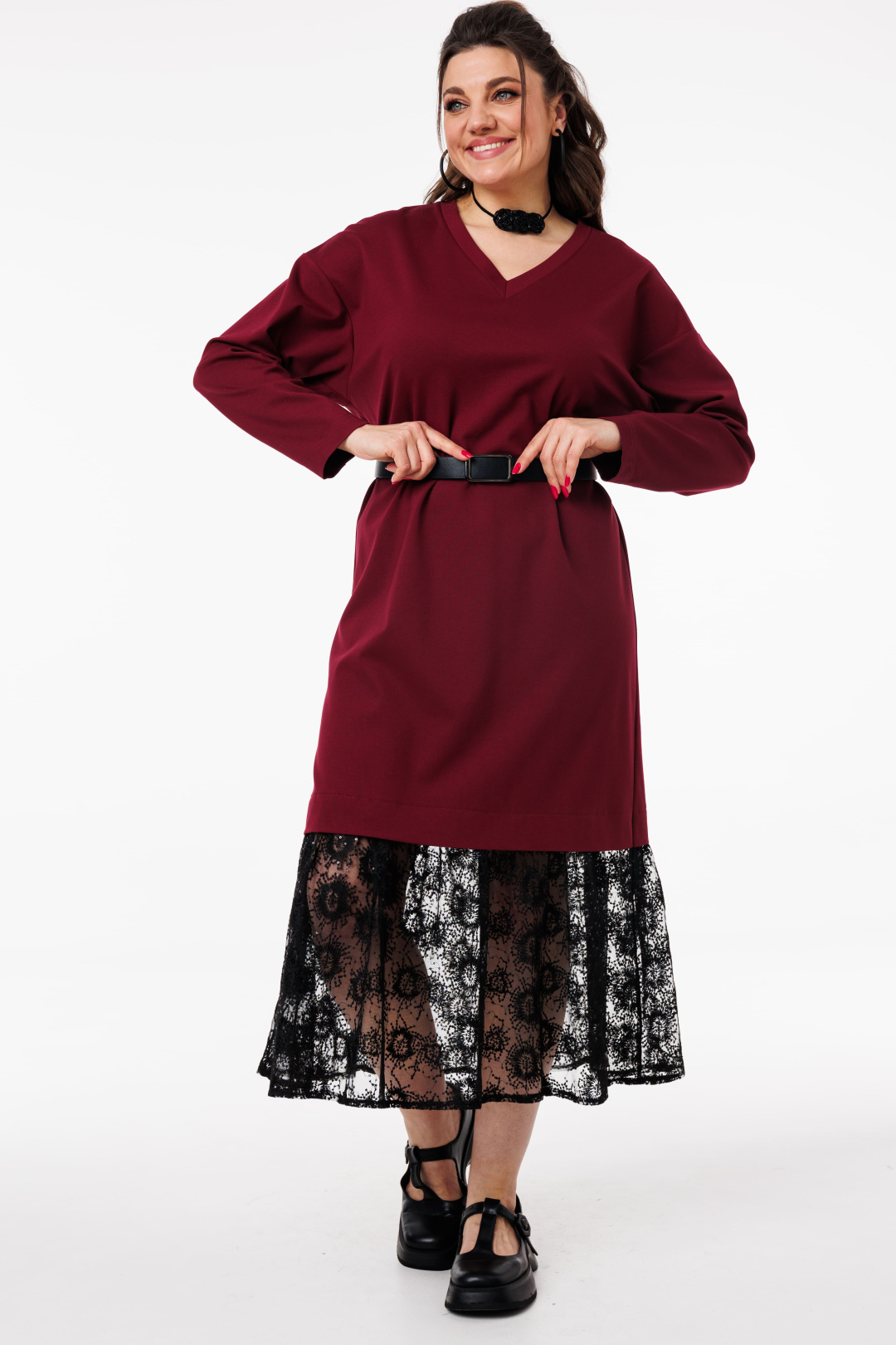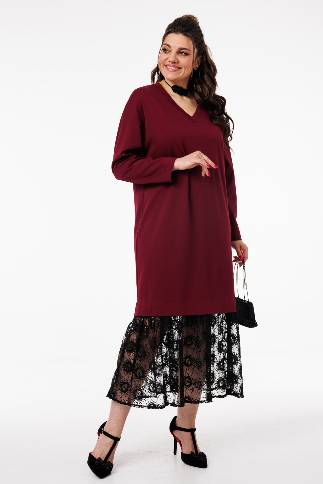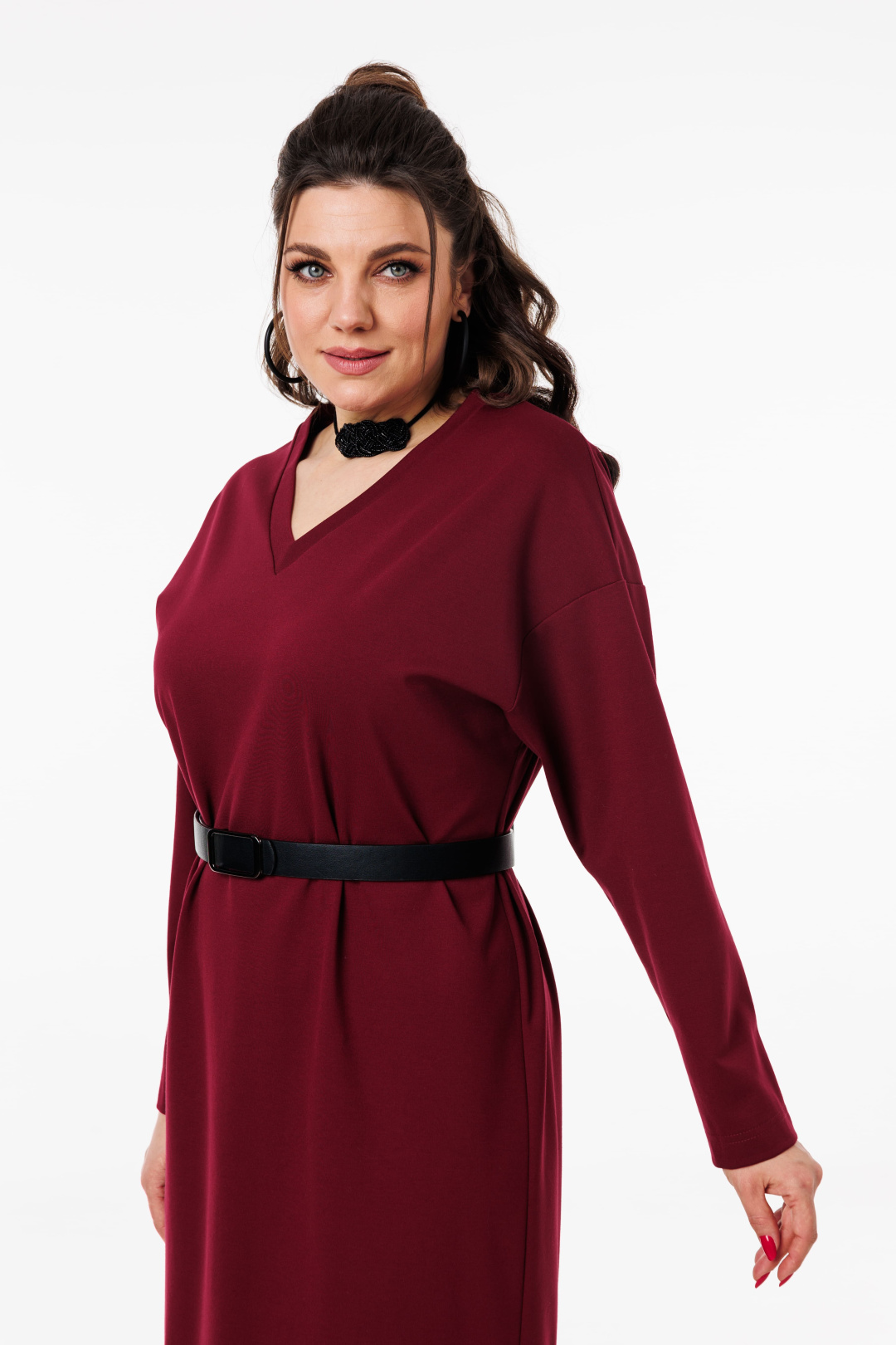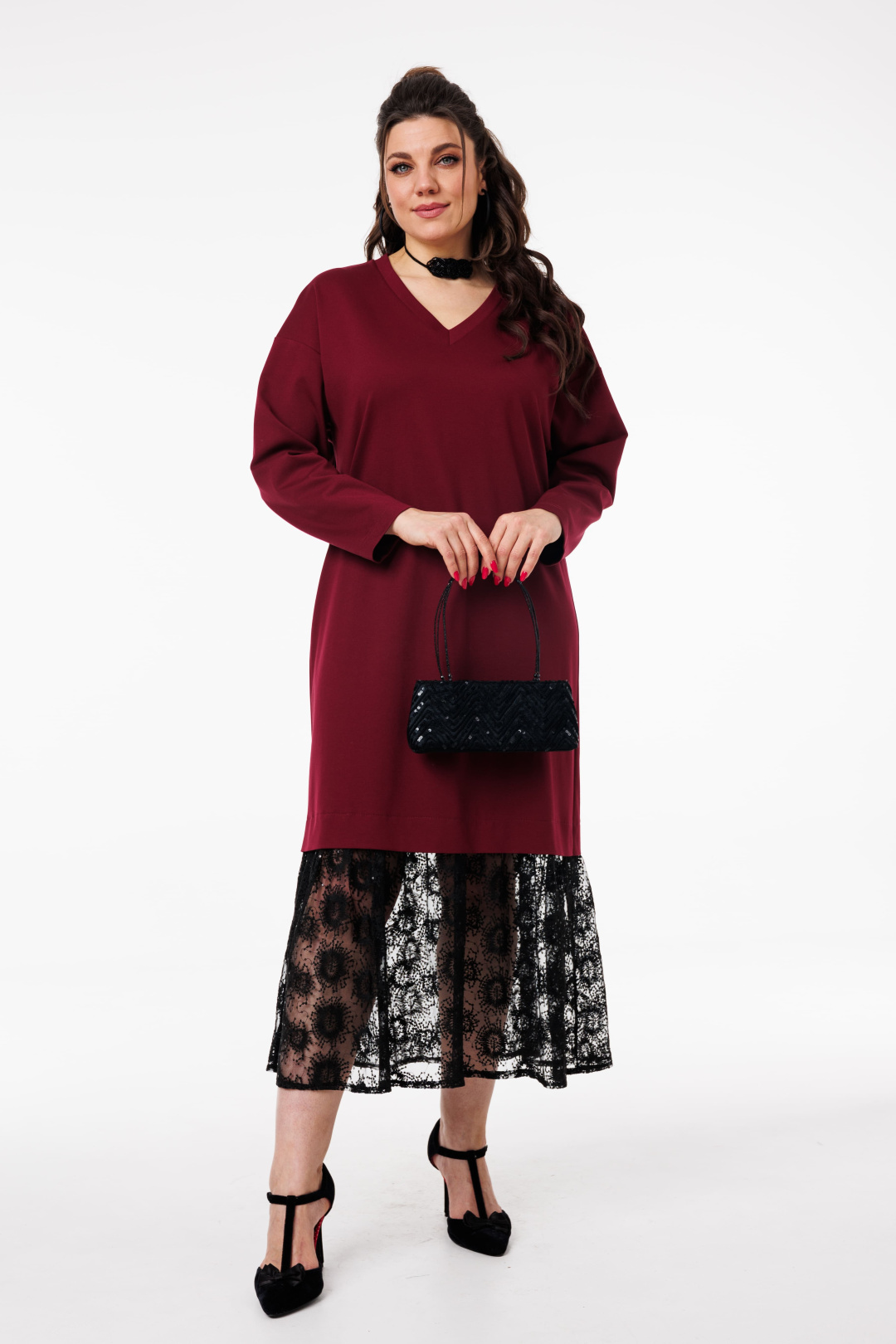 V-образный вырез подчеркивает линию шеи и декольте, добавляя образу женственности и утонченности.