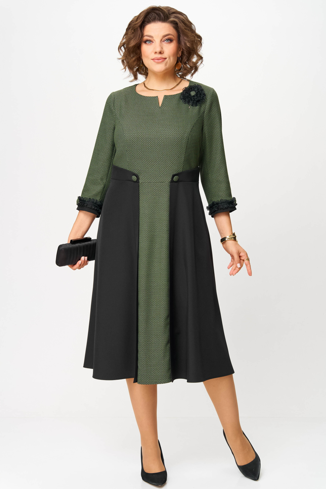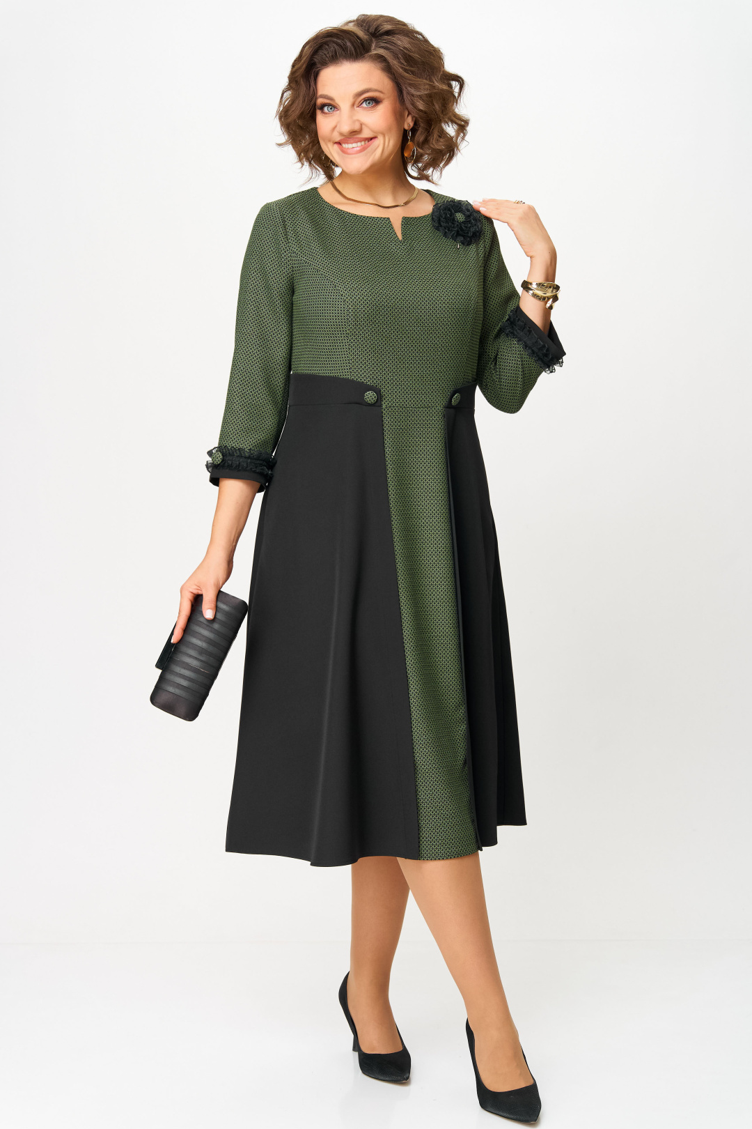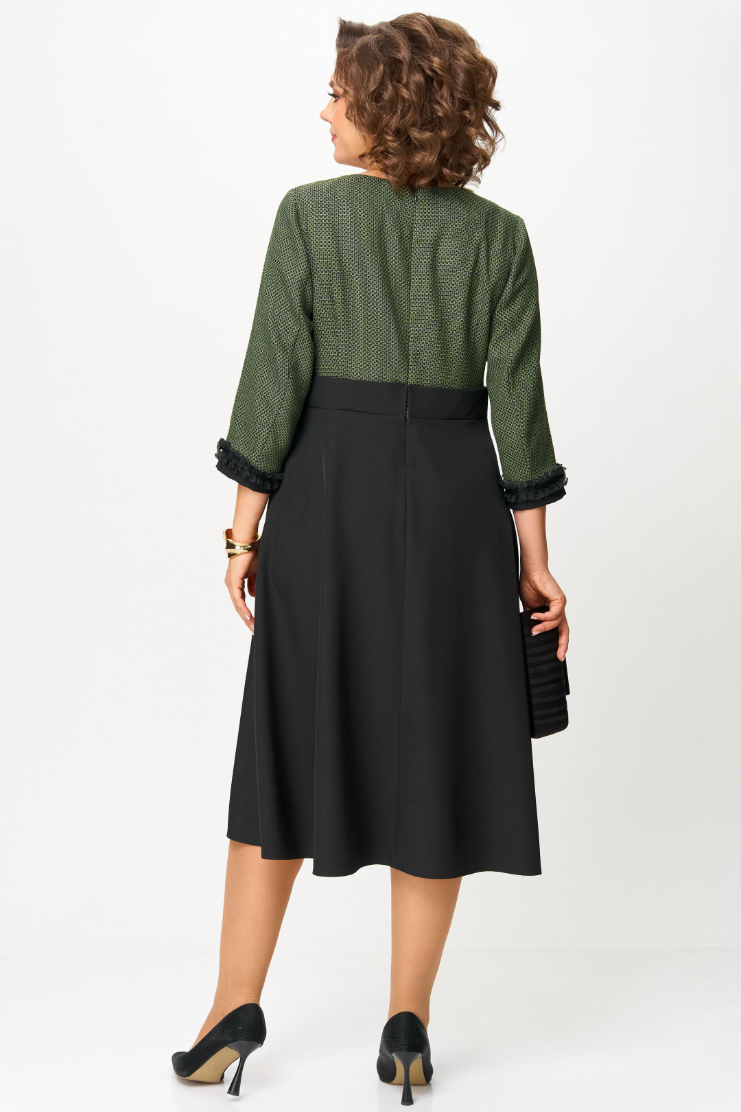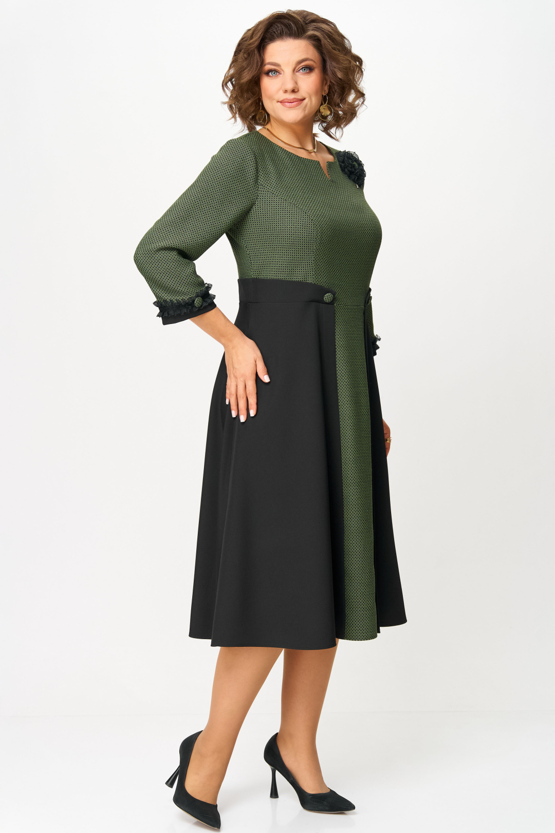 Платье полуприлегающего силуэта, отрезное по линии талии. Горловина с фигурным вырезом, обработана обтачкой. По переду лифа — рельефные швы. По спинке лифа талиевые вытачки и средний шов, в котором обработана потайная молния. Юбка платья "клеш", с вертикальной вставкой по переду и средним швом по спинке. Подрез по талии закрывается декоративным поясом с пуговицами. Добавят комфорта при носке функциональные карманы в боковых швах. Рукав втачной прямой, длиной ¾, по низу — манжет, декорированный тесьмой и пуговицой. В комплекте к платью прилагается съемное украшение из тесьмы. Длина платья: 118 см