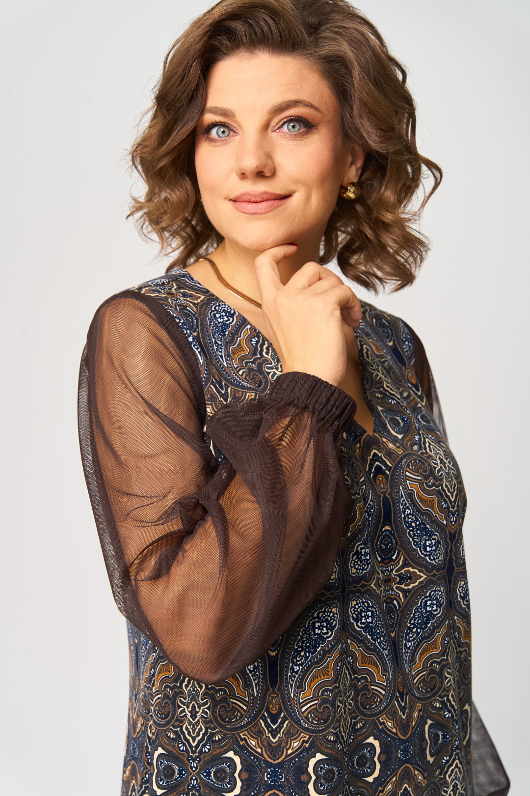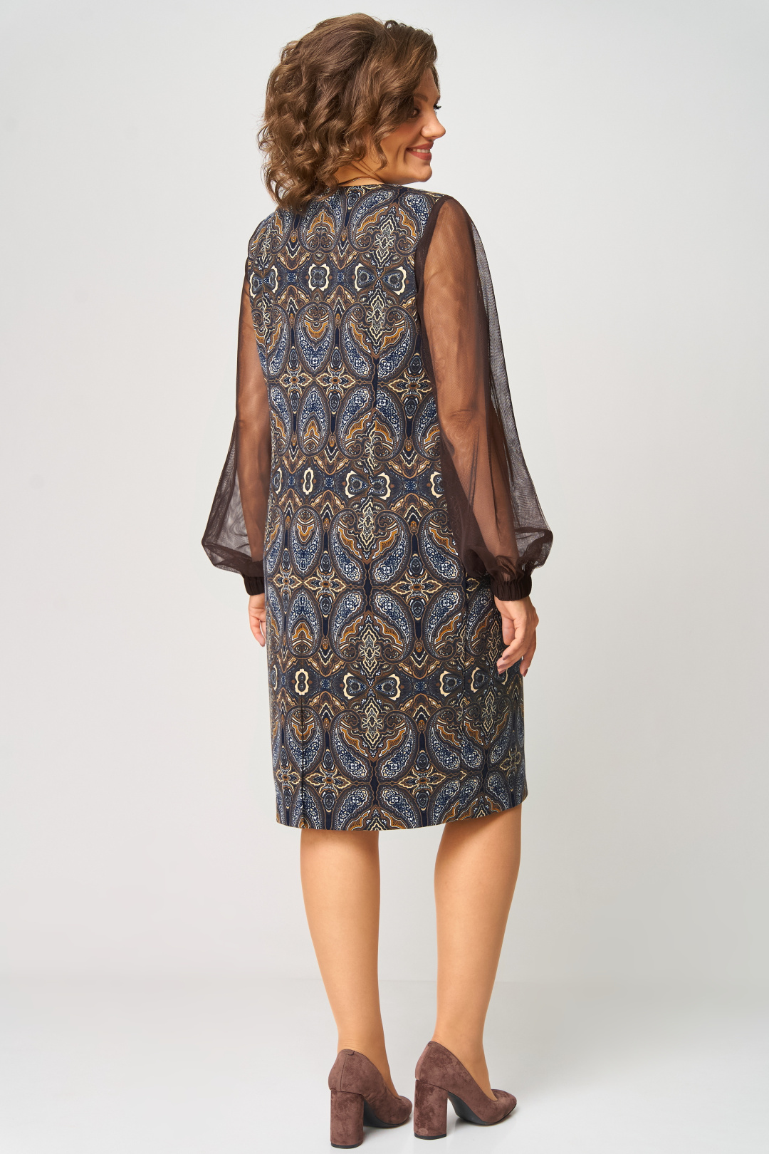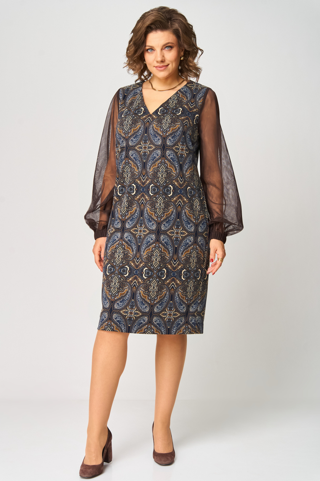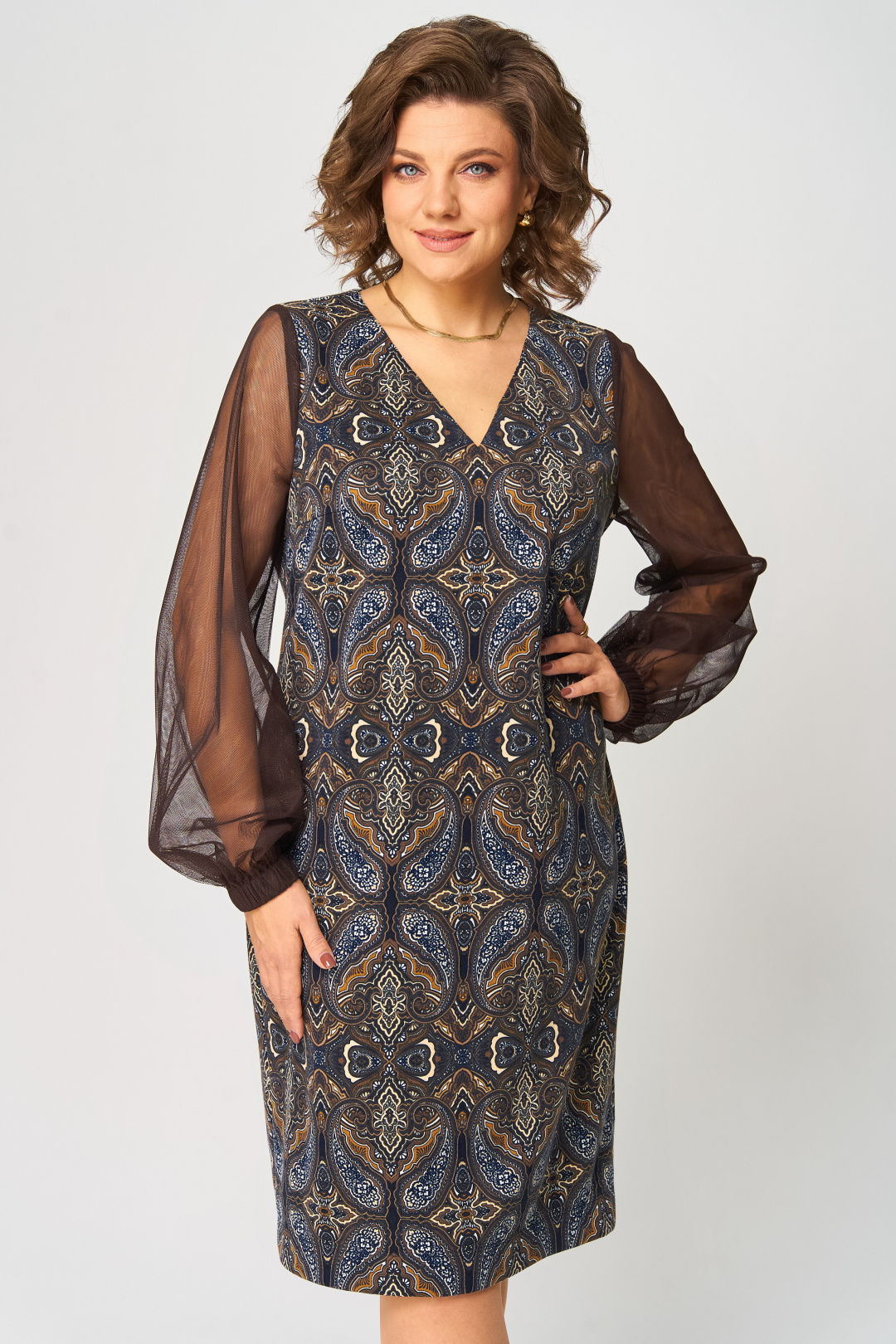 Платье полуприлегающего силуэта с горловиной V-образной формы. Перед с нагрудными вытачками. Спинка с талиевыми вытачками и разрезом в среднем шве. Рукав прозрачный из сетки, втачной прямой длинный, на резинке по низу. Длина платья: 103 см