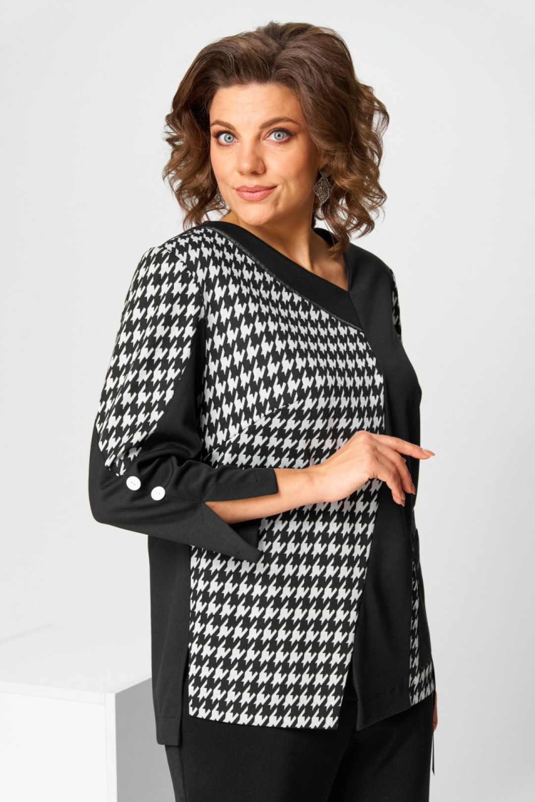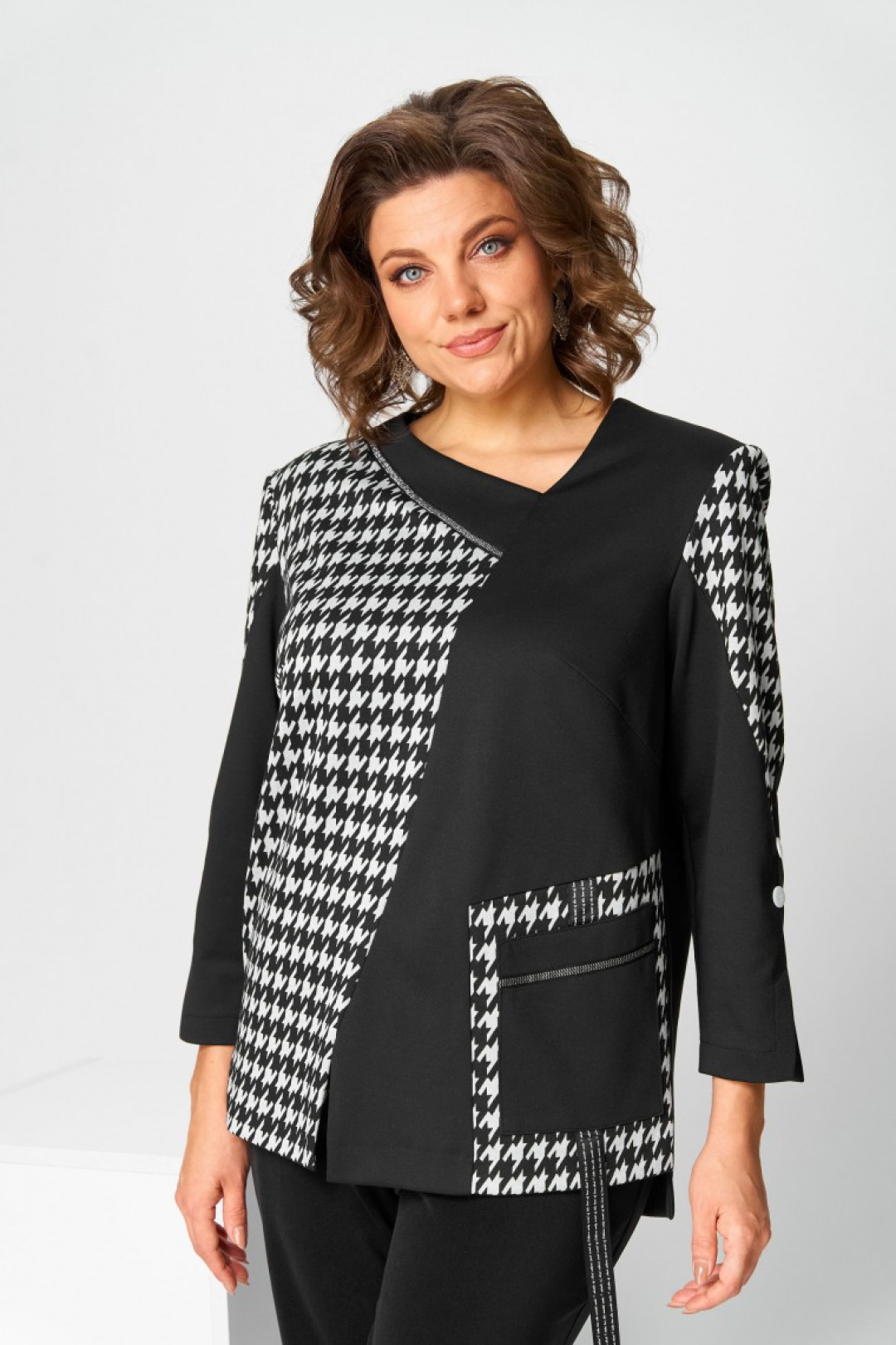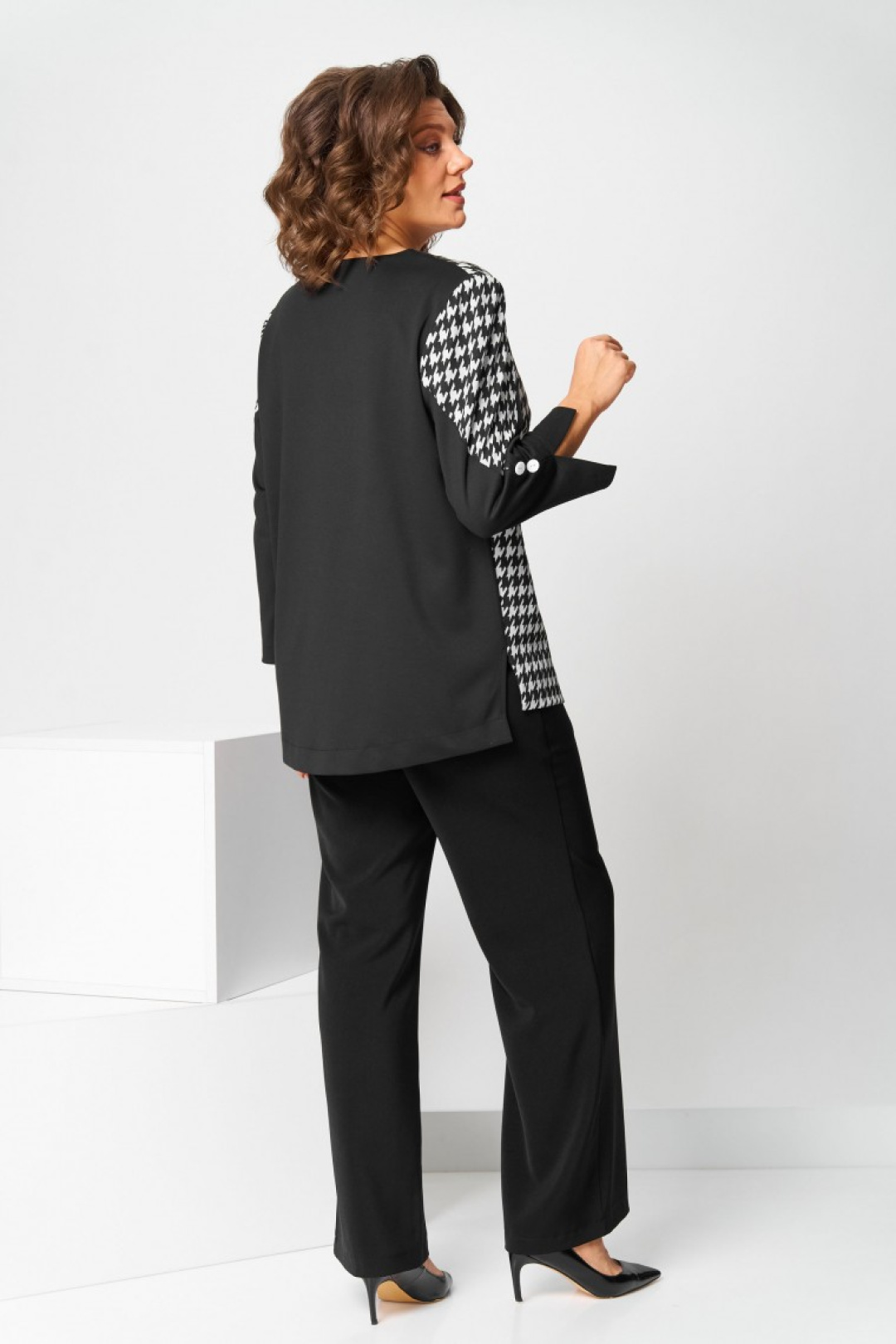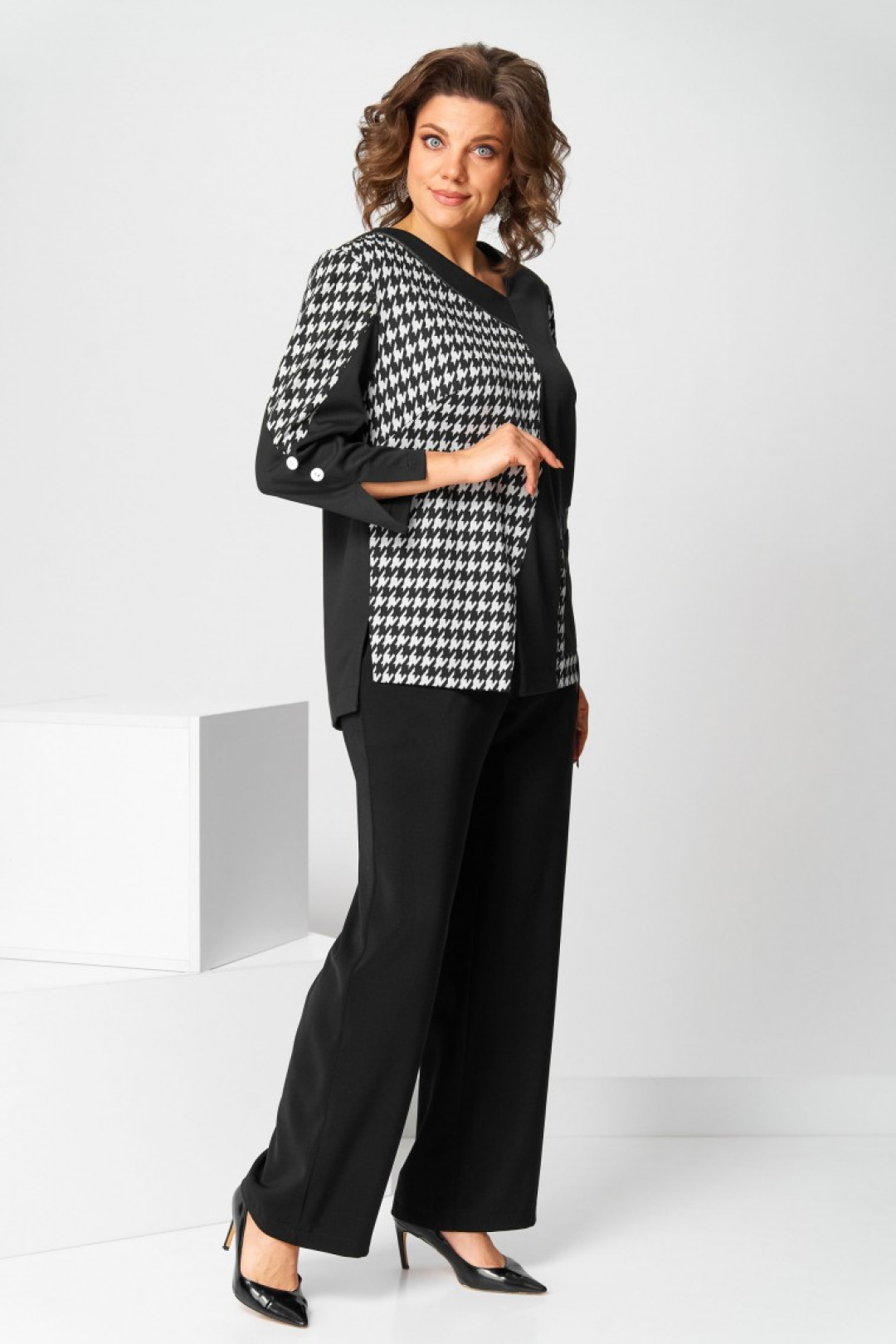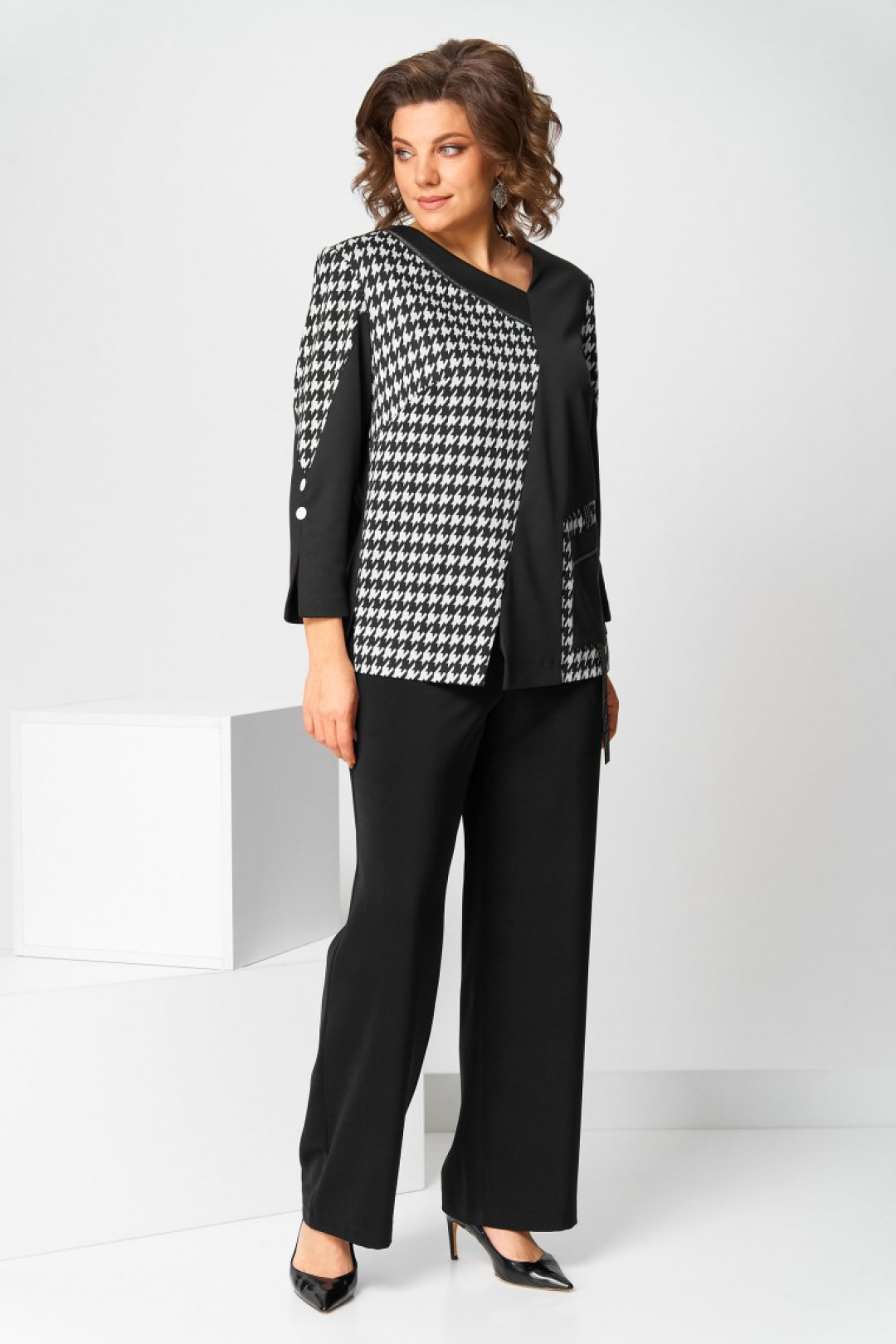 Костюм брючный (двойка) женский полуприлегающего силуэта, состоит из джемпера и брюк. Костюм выполнен и трикотажного полотна и брючной ткани. Джемпер без застежки, рукав длинный с фигурной вставкой. По низу разрез. Горловина фигурная V-образная со вставкой, декорированной тесьмой с имитацией "молнии". Перед с асимметричным подрезом в области бедра вставка с карманом с отделочной тесьмой. По переду внизу разрез по рельефу. По боковым швам внизу разрезы. Спинка свободная. Брюки классические, со стрелками на поясе с резинкой. Застежка на гульфик, на тесьму-молнию. Вверху косые карманы.