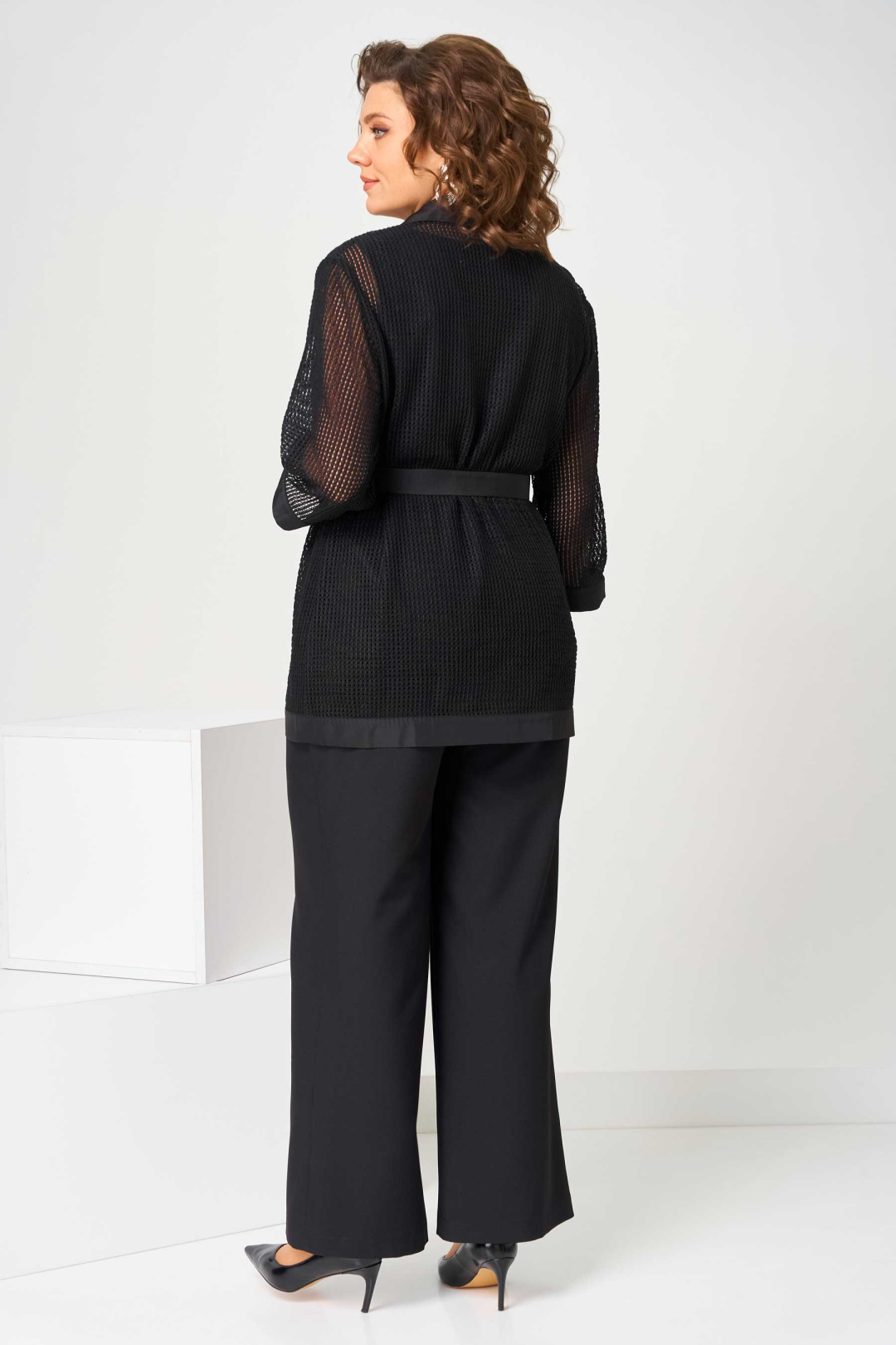 Костюм женский свободного силуэта, состоит из кардигана, брюк и топа. Кардиган свободного силуэта, из ткани сетка. Воротник пиджачного типа. Рукав втачной с манжетом, длиной 3/4. Кардиган со съемным поясом, без застежки. Брюки на поясе с резинкой, с карманами в боковых швах, с застежкой на гульфик-молнию. По передней половинке топа складки, выходящие из кокетки.