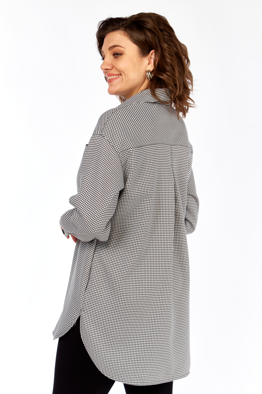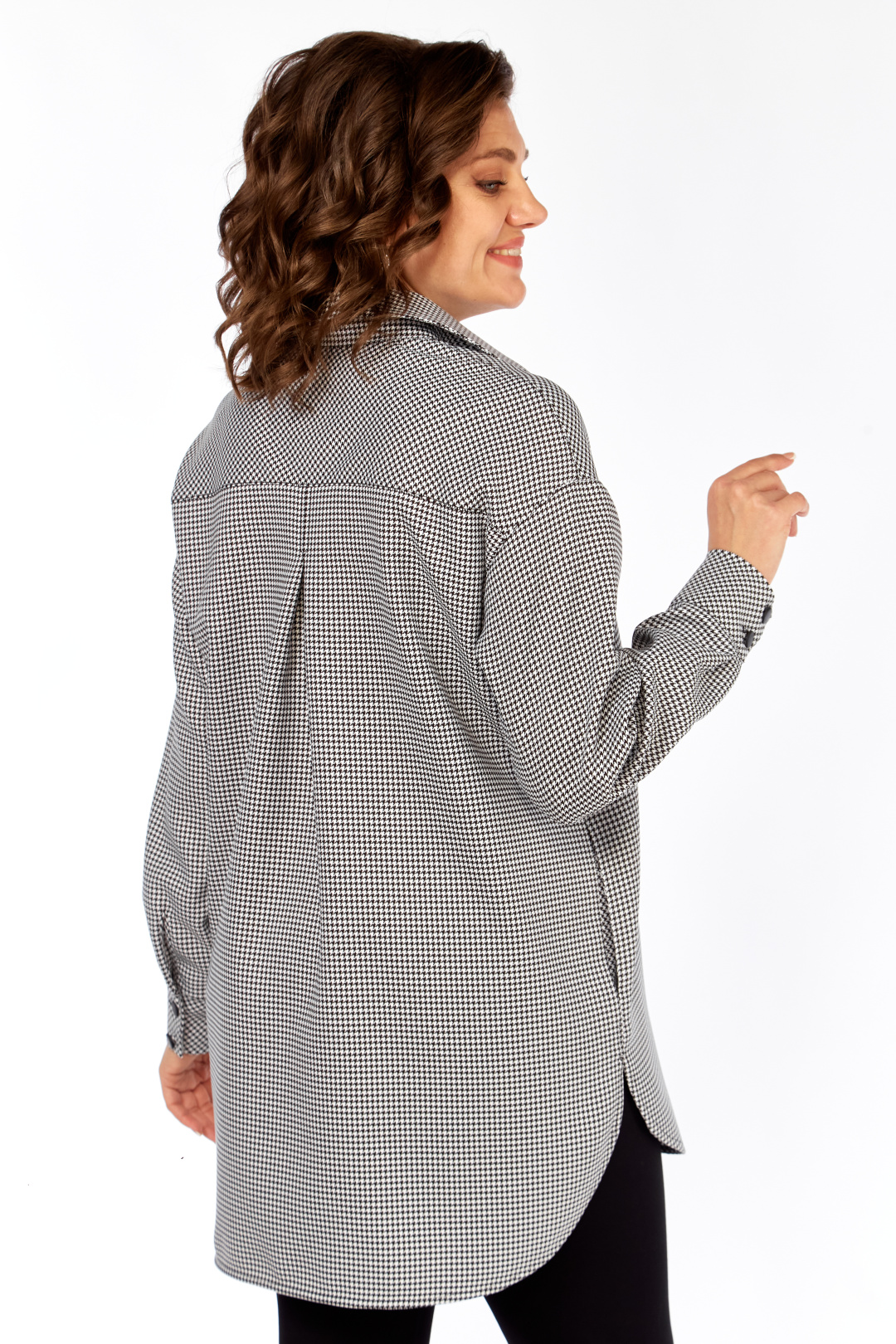 Рубашка свободного кроя, в стиле оверсайз. Силуэт свободный. На переде слевой стороны карман, выкроенный по косой. В боковых швах карманы. Рукав рубашечный с разрезом и складками,заканчивается манжетой, которая застегивается на 2 петли и пуговицы.Плечо спущенное, кокетка также выкроена по косой. На спинке по центру складка. Спинка длиннее переда, низ спинки и переда скруглен к боковым. Планка переда выполнена не до конца детали. Длина по спинке-84,5см, длина рукава+манжета-53,5см, длина плеча-20см. Параметры модели: обхват груди-98см, обхват бедер-110см, размер изделия на модели 50.