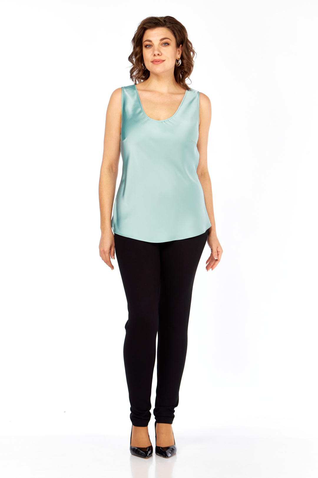 Топ полуприлегающего силуэта. Перед и спинка выкроены по косой. На переде от бокового грудные вытачки, на спинке выполнены талиевые вытачки. Длина по спинке(от точки основания шеи) -65см, длина по боку 37,5см. Параметры модели: обхват груди-98см, обхват бедер-110см, размер изделия на модели 50.