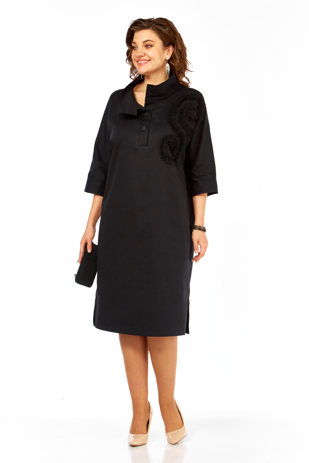 Платье прямого силуэта , "оверсайз", с цельнокроеным рукавом длиной 3/4, заканчивающимся притачной отложной манжетой, выполнено из двух видов ткани. Перед с втачными планками по горловине и центральной застёжкой на 2 кнопки, и декоративным элементом из сетки. Воротник - стойка. Спинка с отрезной кокеткой из сетки и средним швом. В боковых швах разрезы.