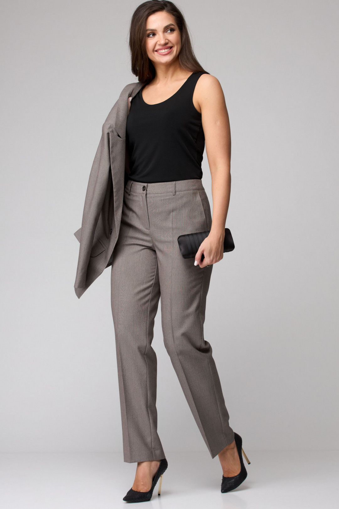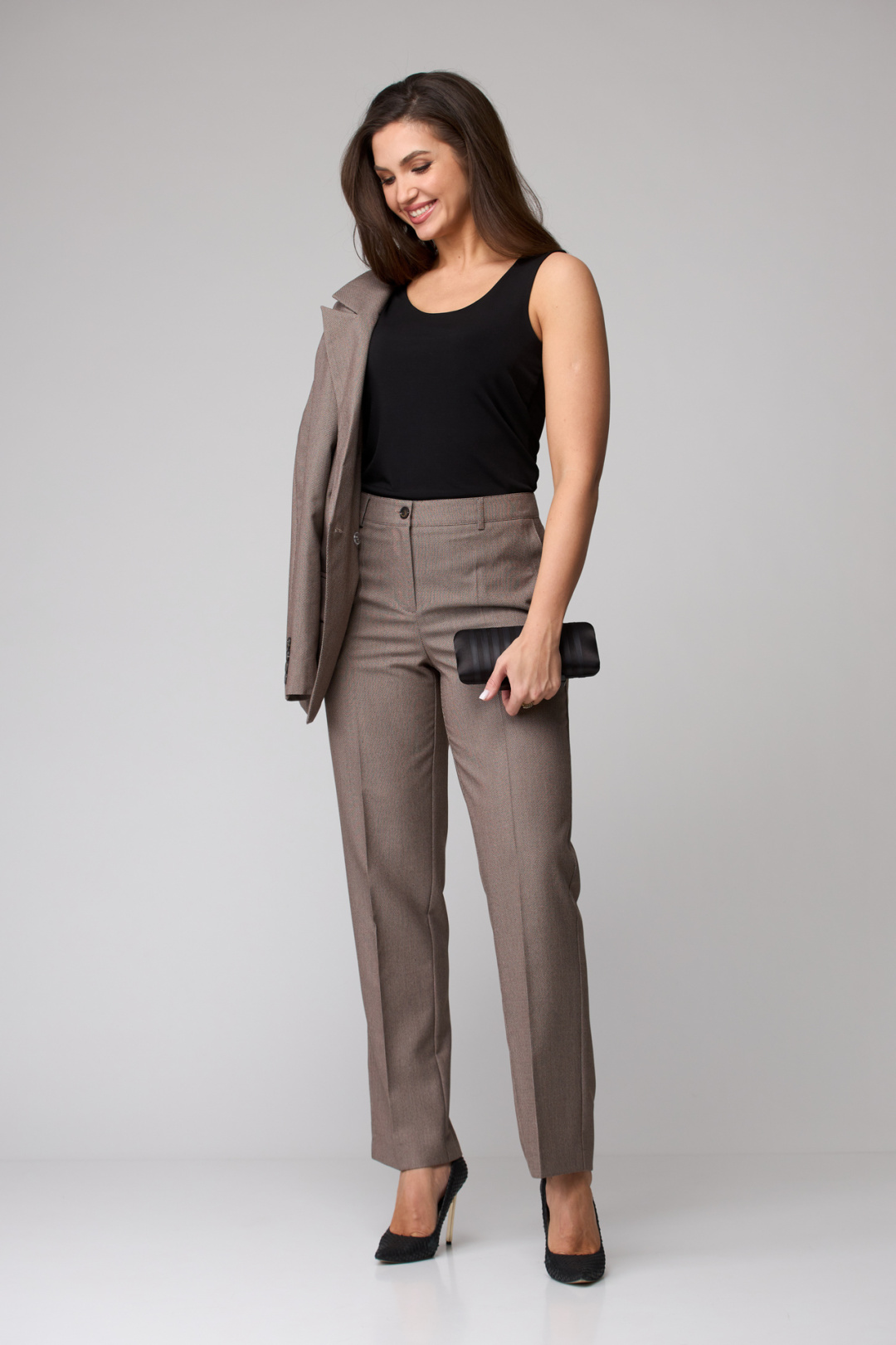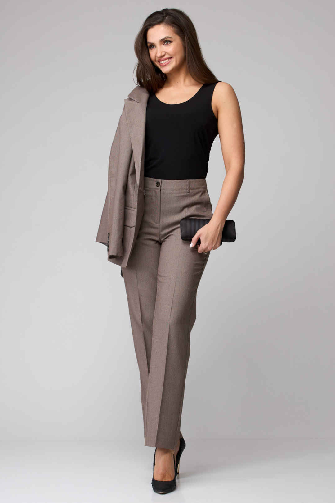 Брюки прямые,классические, с заутюженными стрелками,по переду обработаны карманы с отрезным бочком,застежка на тесьму-молнию и 1 пуговицу.На задних половинках обработаны вытачки и имитация карманов с листочкой, пояс в брюках притачной. Длина брюк от талии по боковому шву 100 см.