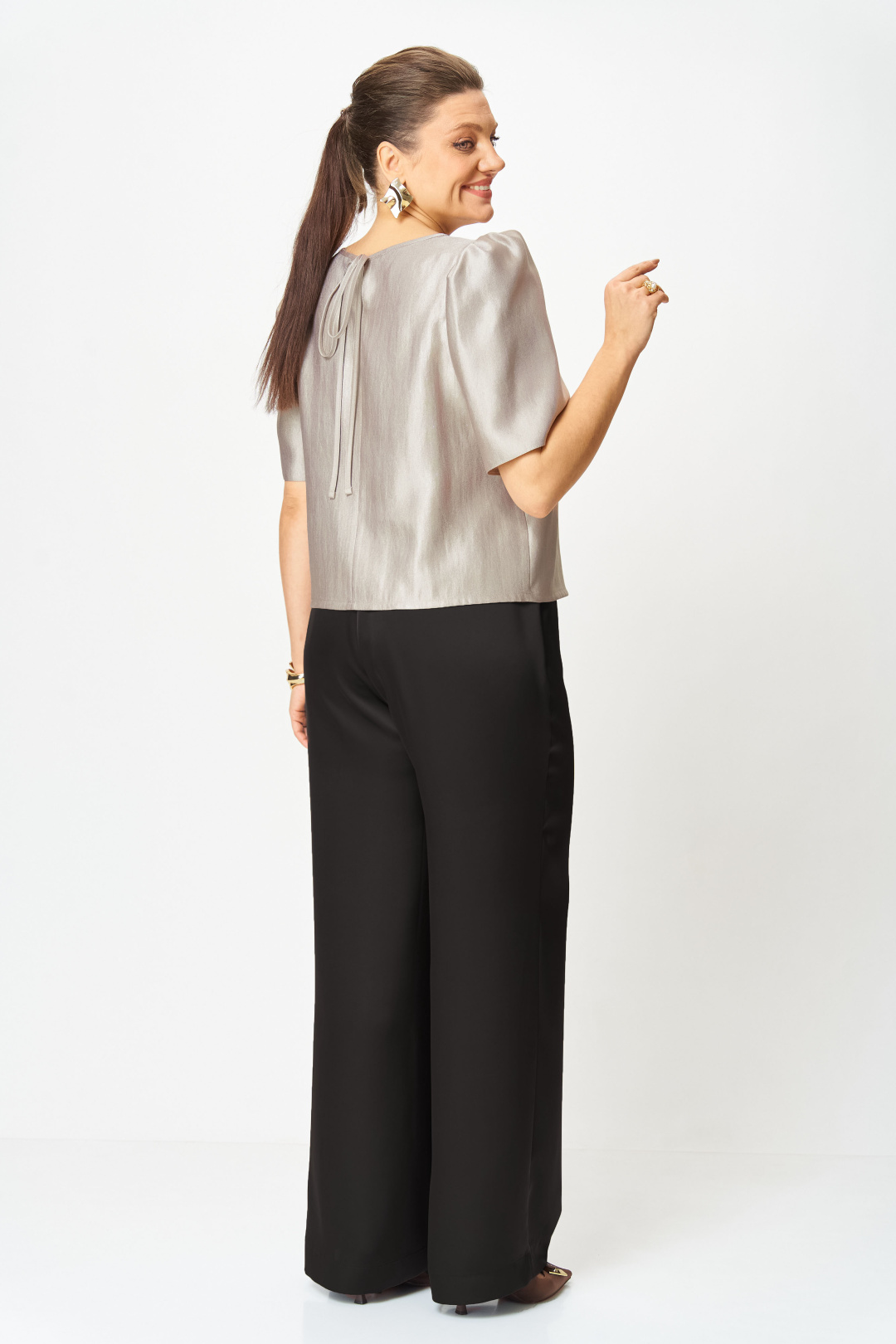 Блузка свободного силуэта из плательной ткани с блеском. Горловина круглая, по спинке в центральном шве разрез возле горловины с завязками.