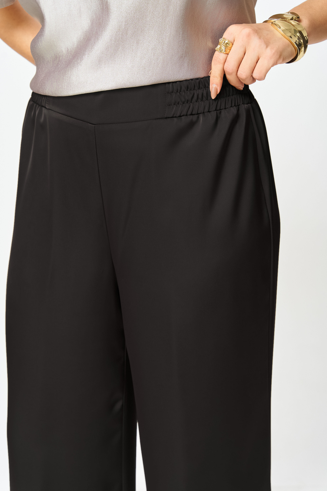 Брюки свободного силуэта, прямые к низу, выполнены из атласной ткани, брюки без застежки, верх брюк на поясе с резинкой.