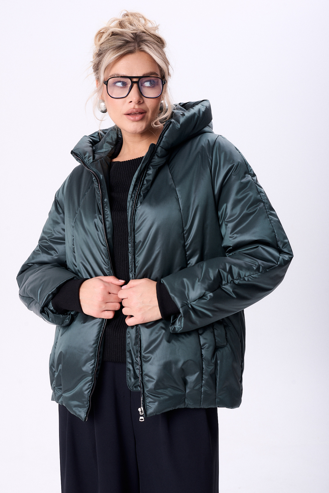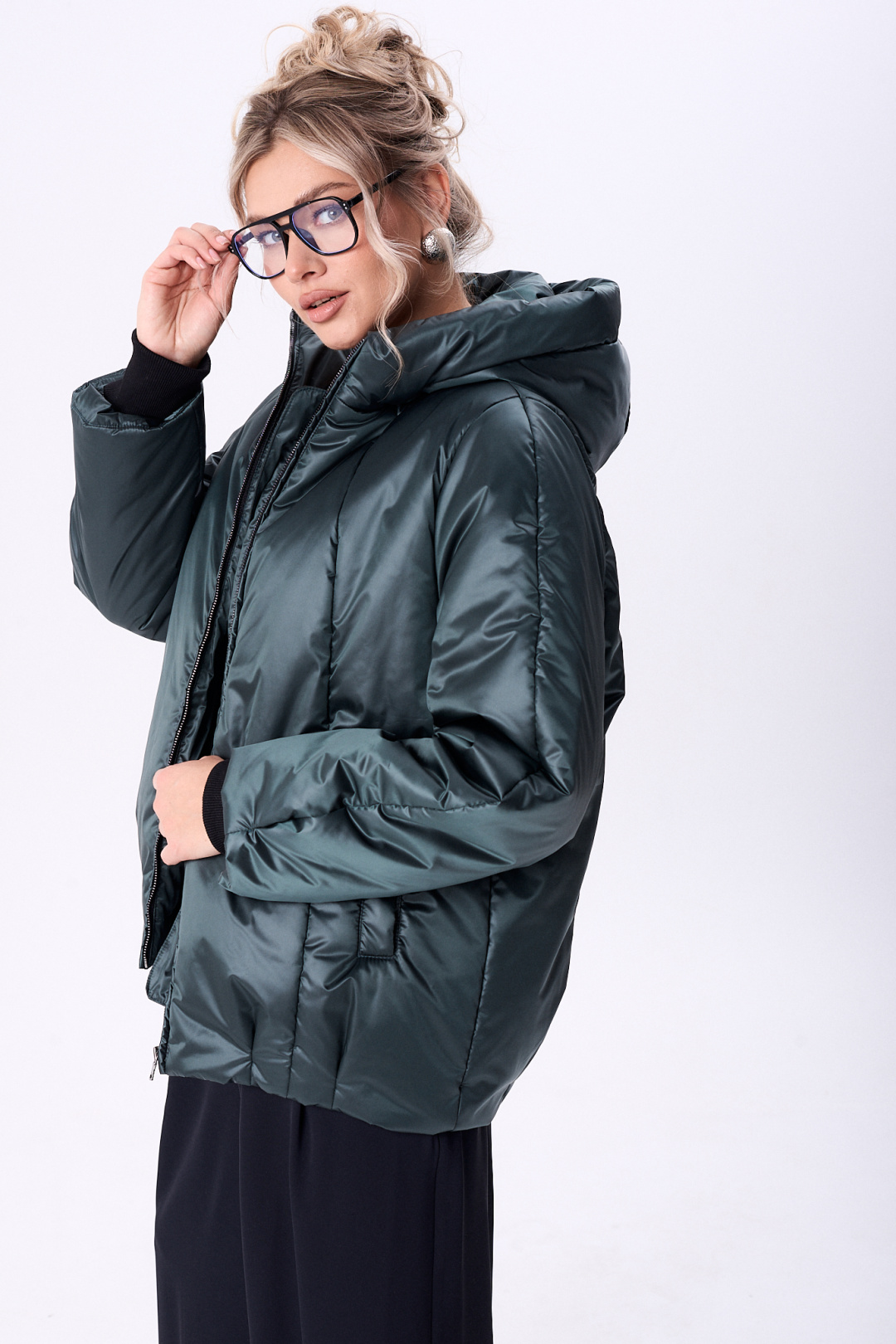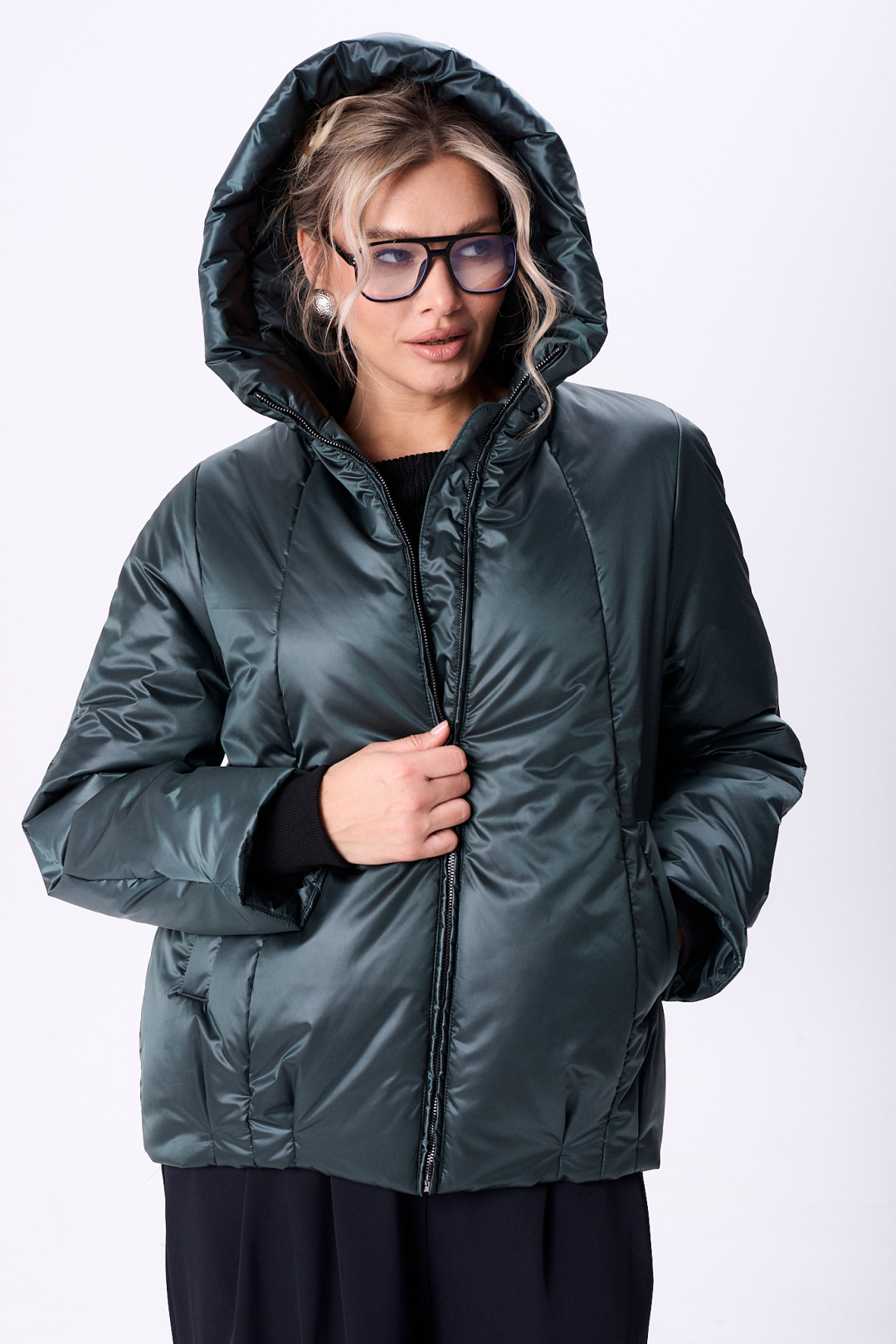 Куртка женская с центральной застежкой на тесьму-молнию. По спинке рельефные швы от горловины до низа, по низу заложены складки. По переду рельефные швы от горловины до низа, по низу заложены складки, обработаны карманы с втачной вытачкой. Рукав полуреглан 2шовный. Капюшон с центральной частью и отделочной деталью по отлету. В качестве отделки используется фурнитура. Утеплитель синтепон 150 гр. Длина по спинке 73 см. Длина рукава 65 см.