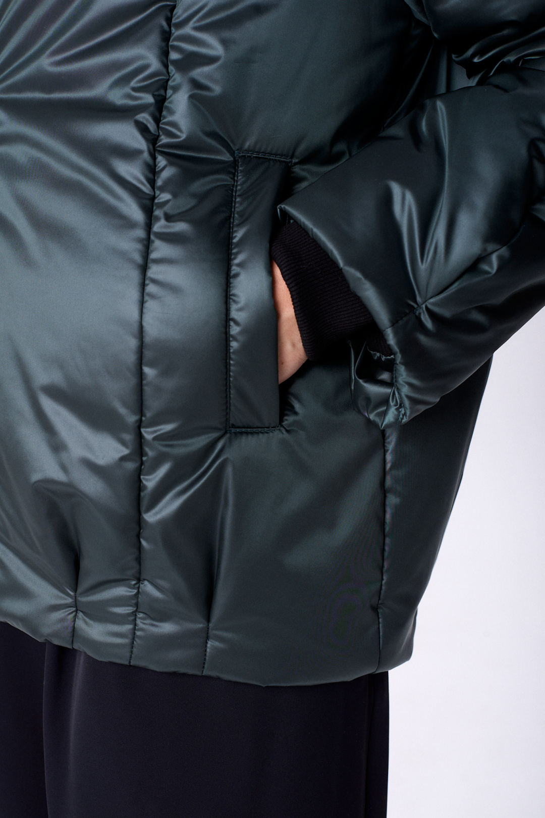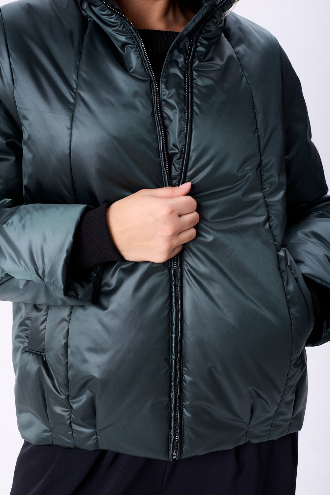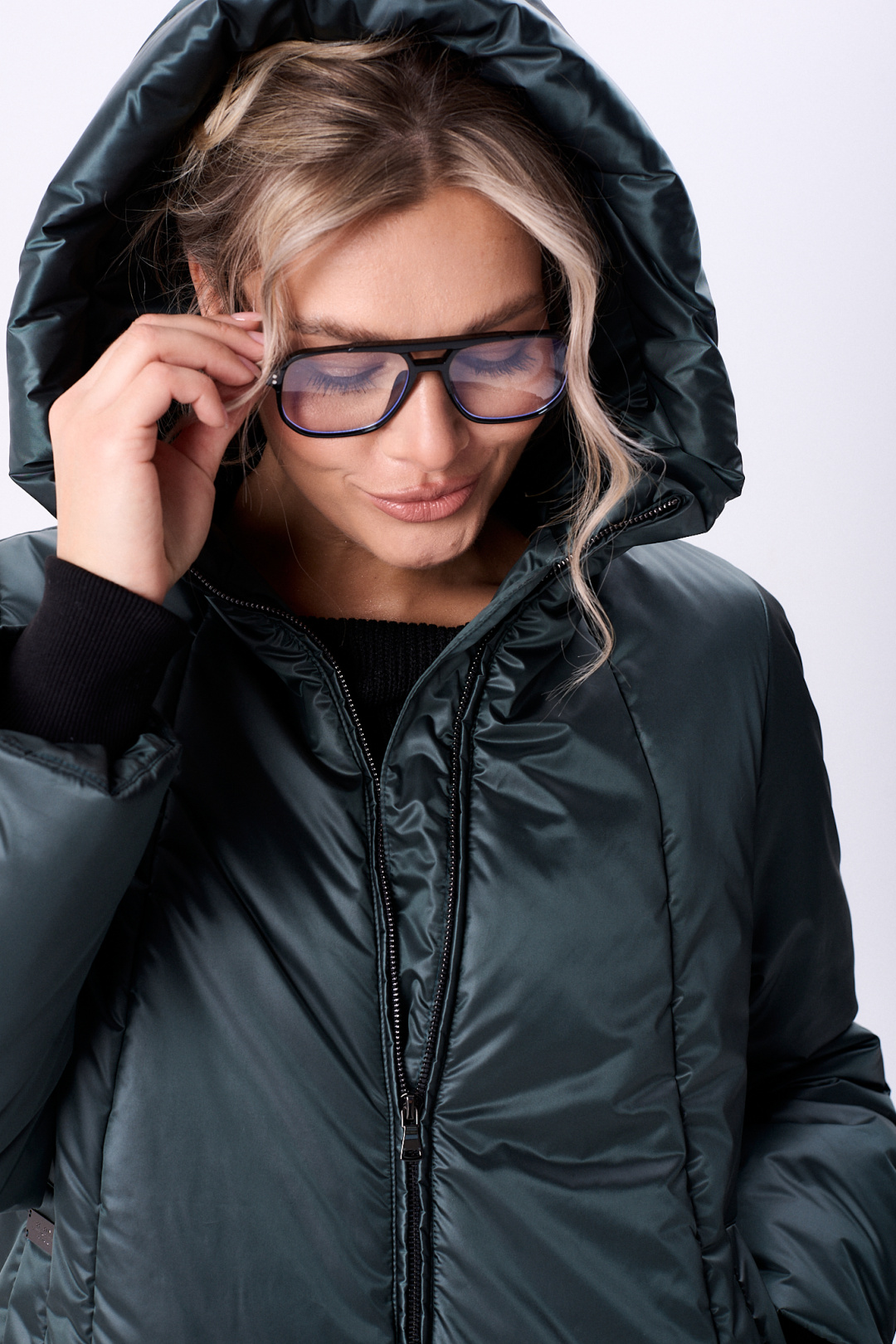 Куртка женская с центральной застежкой на тесьму-молнию. По спинке рельефные швы от горловины до низа, по низу заложены складки. По переду рельефные швы от горловины до низа, по низу заложены складки, обработаны карманы с втачной вытачкой. Рукав полуреглан 2шовный. Капюшон с центральной частью и отделочной деталью по отлету. В качестве отделки используется фурнитура. Утеплитель синтепон 150 гр. Длина по спинке 73 см. Длина рукава 65 см.
