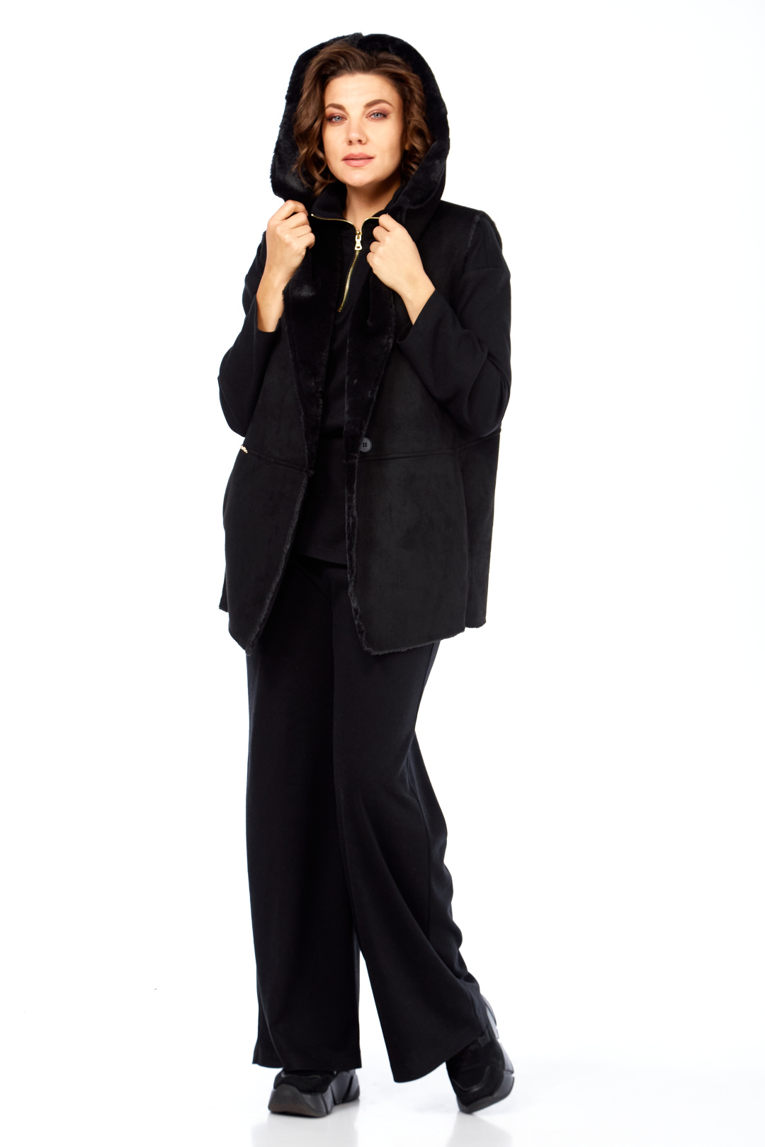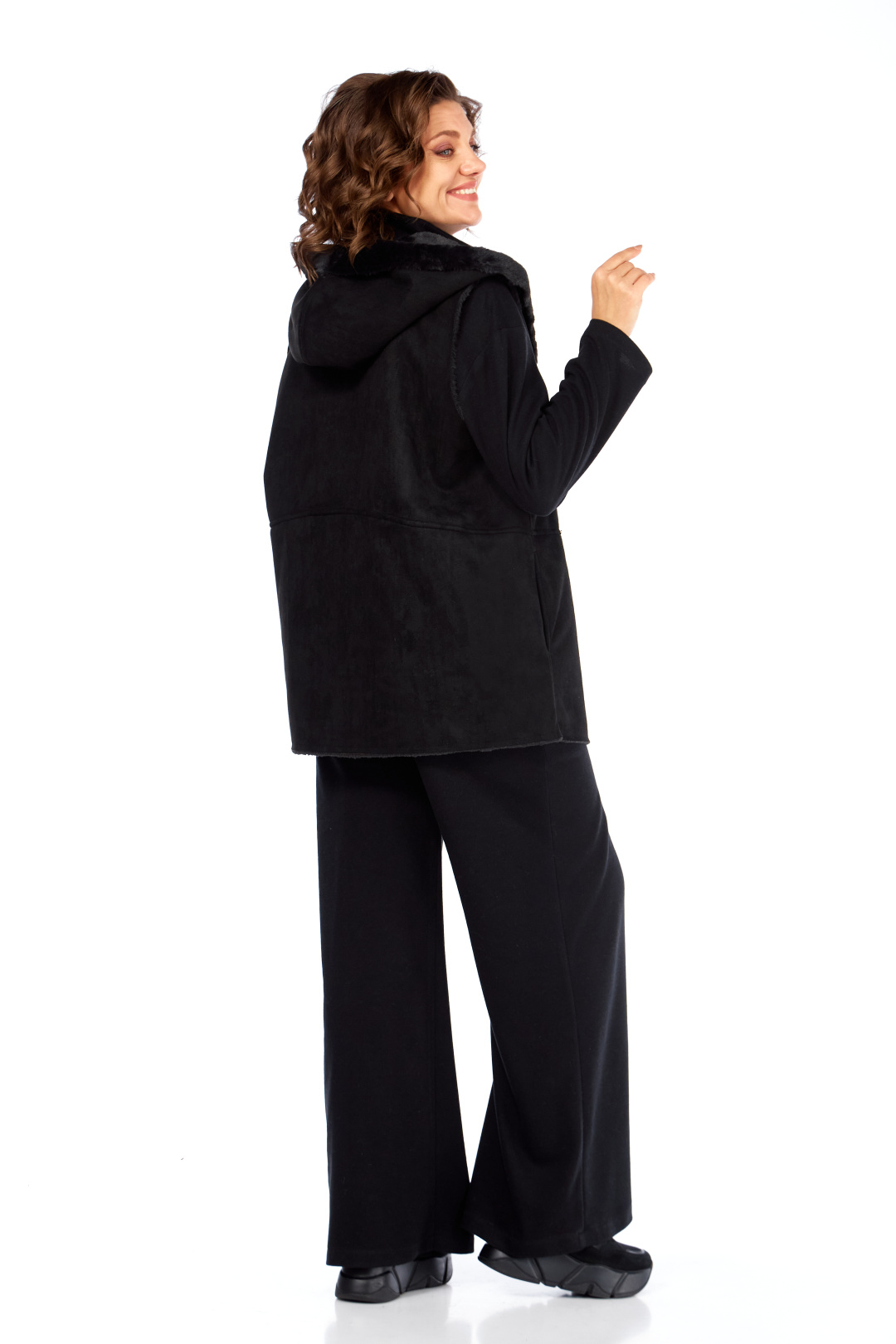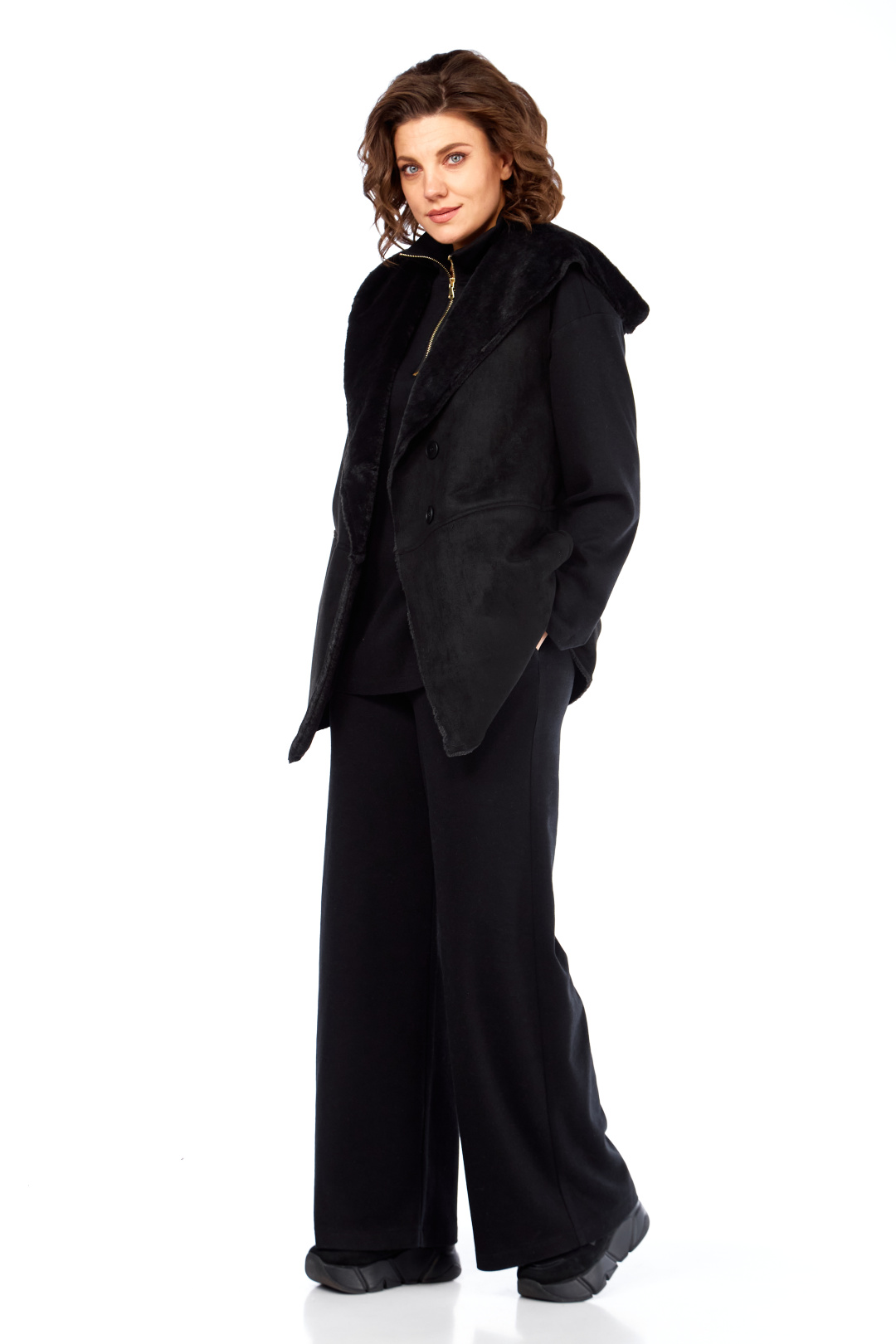 Комплект брючный состоит из кофты, жилетки и брюк. Кофта полуприлегающего силуэта со спущенным плечом, рукав втачной, одношовный. Воротник стойка с застежкой на тесьму-молнию. По боковым швам разрезы. Брюки расширенные книзу, верхний срез обработан поясом с резинкой. В боковых швах карманы. Жилетка свободного кроя со смещенной застежкой на петлю и пуговицу. По спинке горизонтальный рельефный шов на перед, в котором обработаны карманы. Цельнокроенный капюшон с центральной частью. В качестве отделки используется фурнитура.